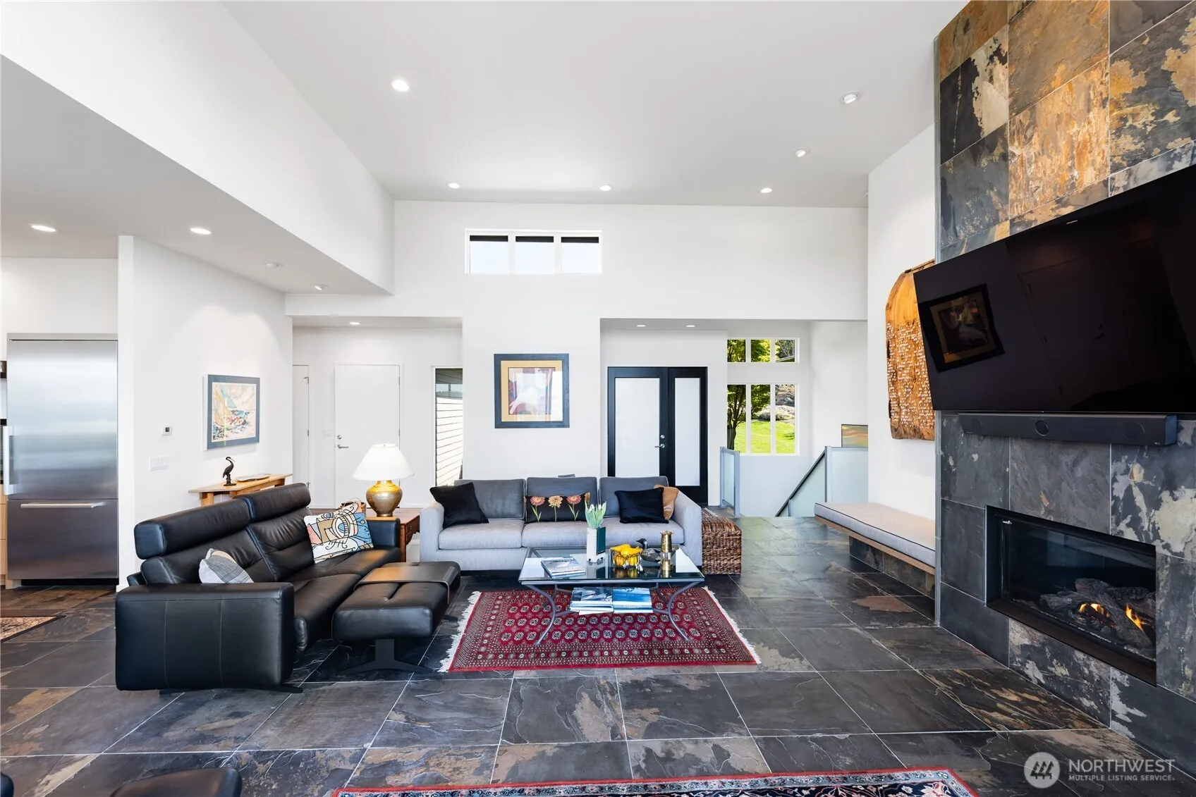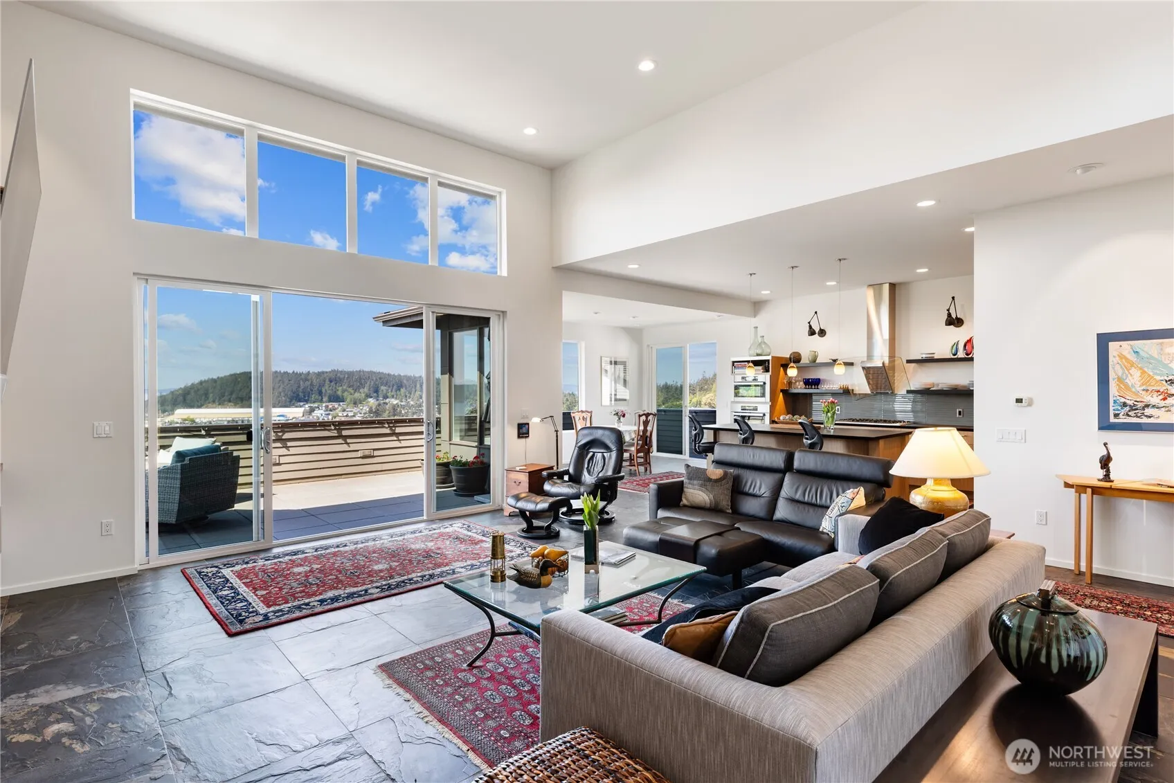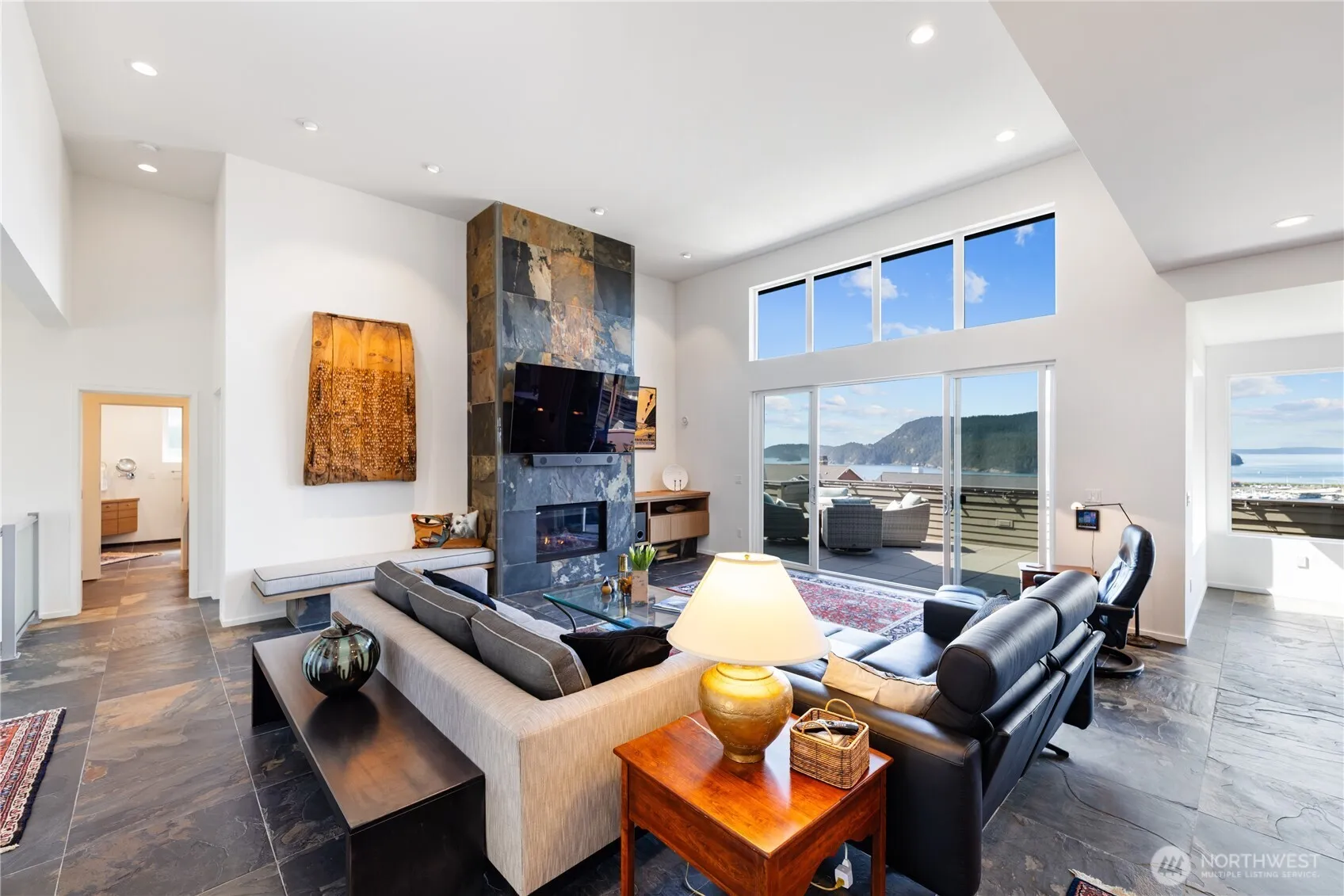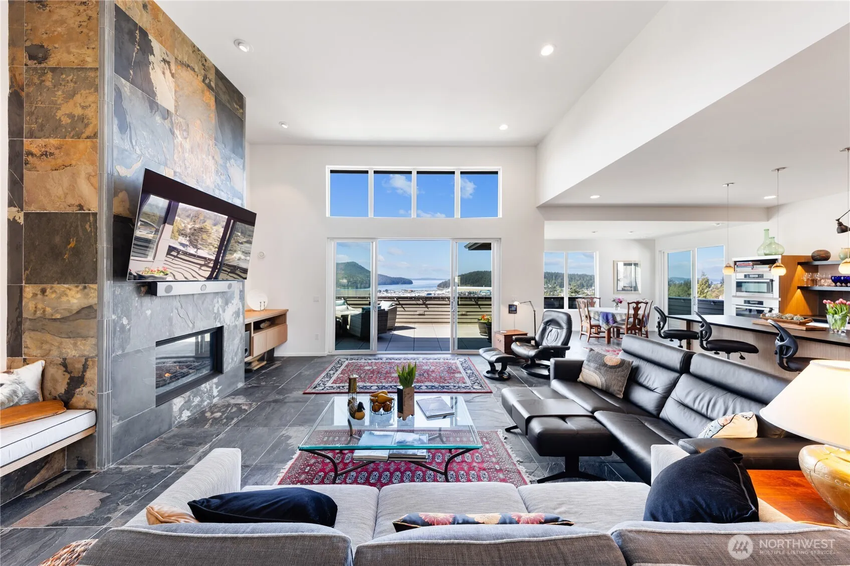 Modern luxury blends seamlessly with timeless elegance in this Skyline masterpiece. Sleek slate floors, soaring ceilings, and a striking floor-to-ceiling slate feature wall create a refined yet inviting atmosphere. Expansive windows and a generous deck frame sweeping views of the ocean, islands, and mountains. The chef’s kitchen is a culinary showcase with premium Miele and Viking appliances, leathered granite countertops, and stylish open shelving. A tandem garage adds practicality, while the metal roof, durable Hardi siding, and radiant heated floors ensure lasting comfort. Enjoy exclusive access to community amenities including a beach, clubhouse, parks, and a full-service marina—coastal living at its finest. 3 car tandem garage/shop