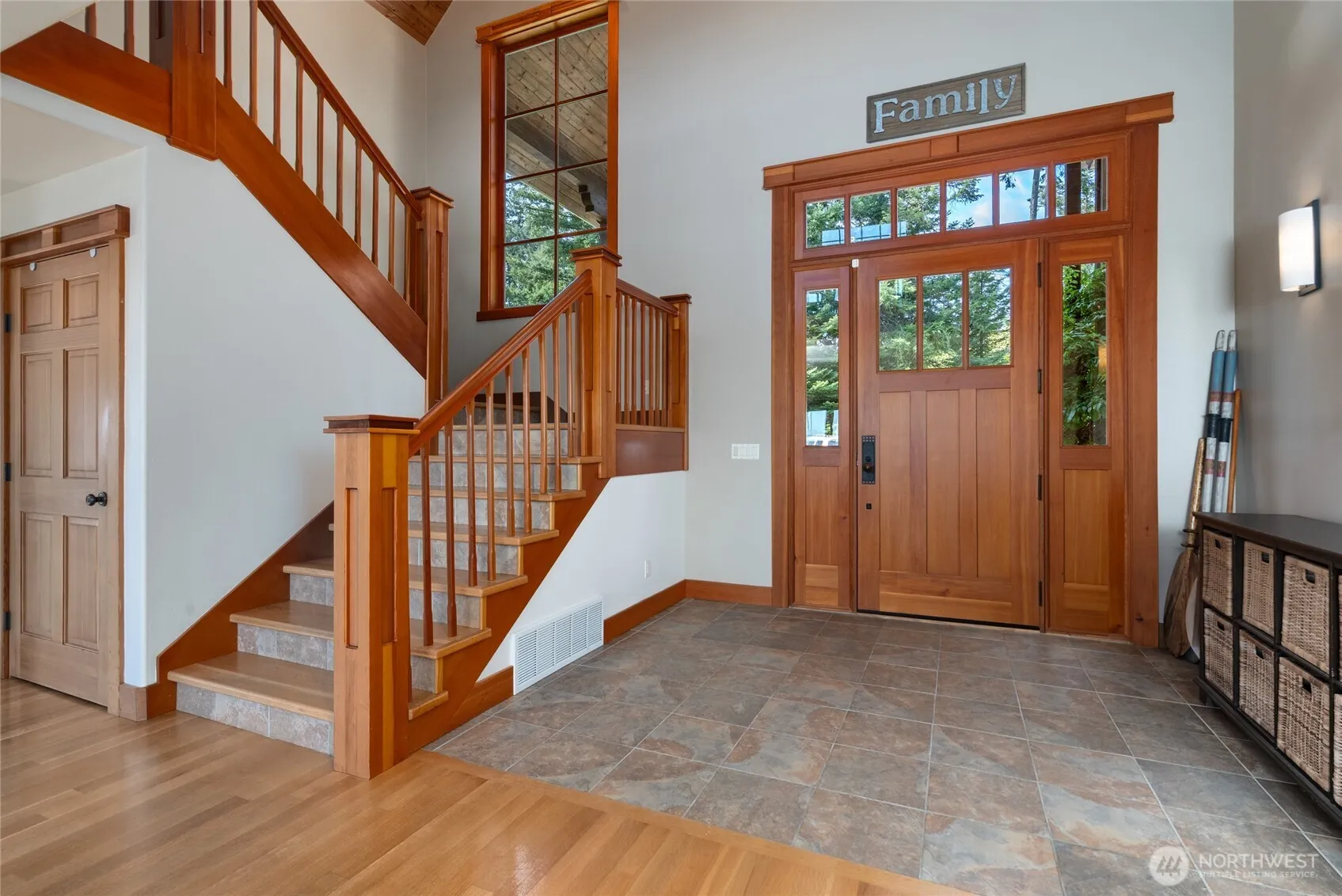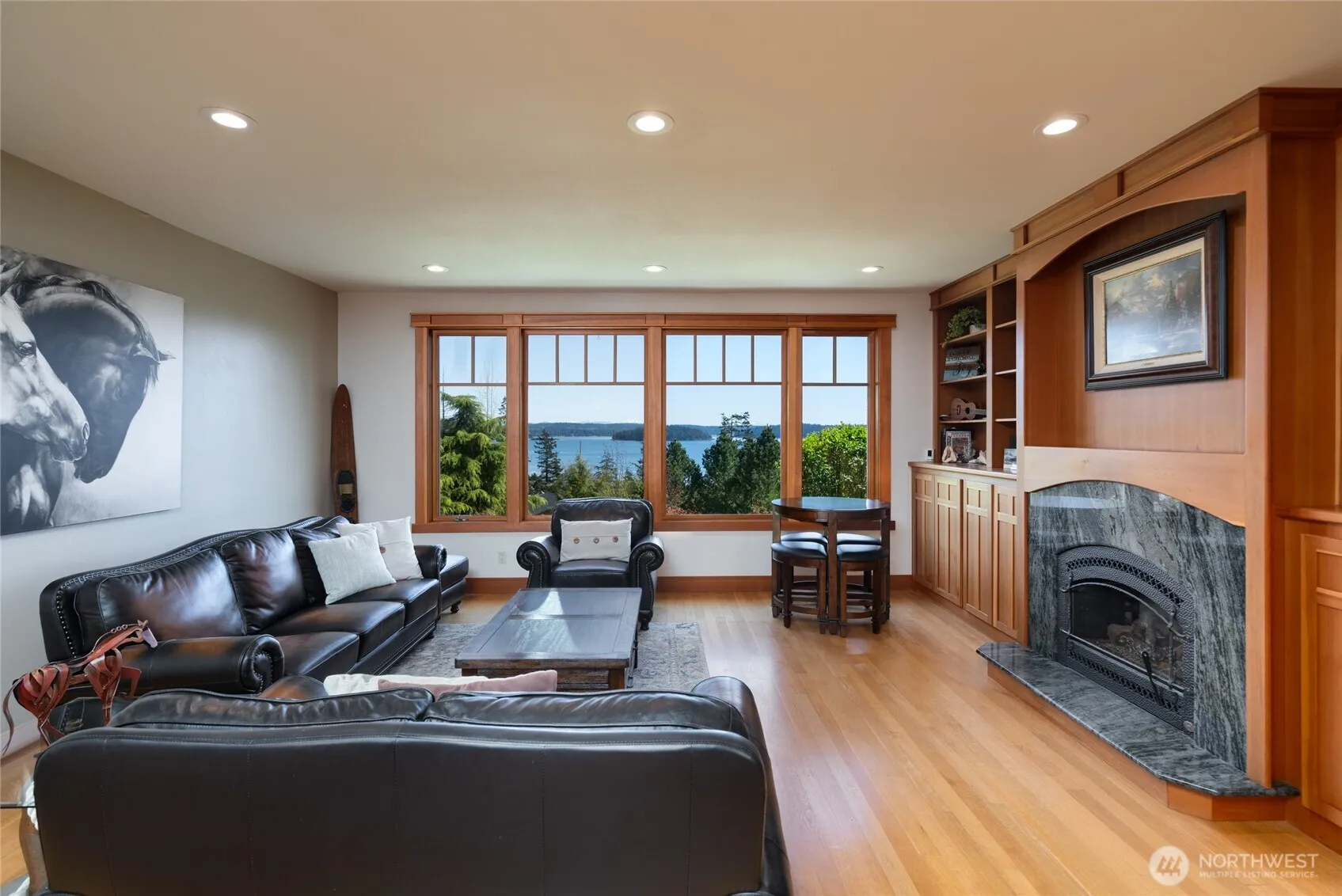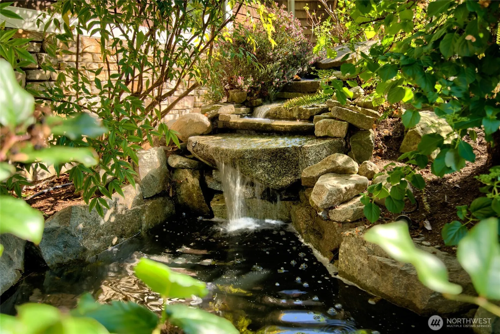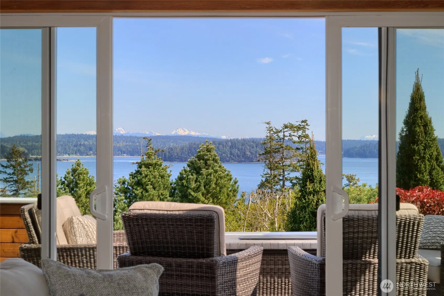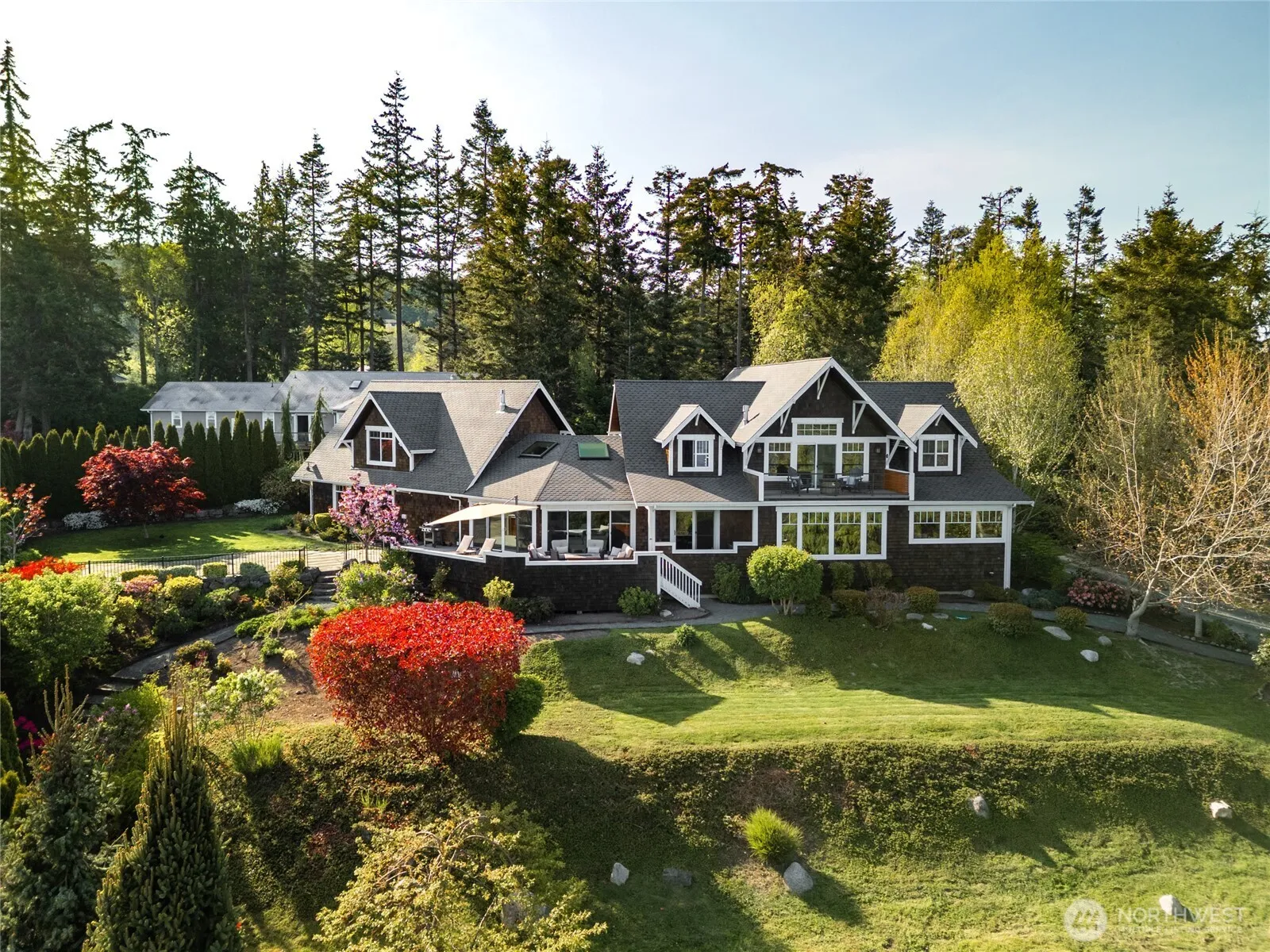 This custom craftsman home welcomes you with an elegant entry + waterfall pond nestled on private acre with mature landscaping. Upon entry, enjoy stunning water, islands, and mountain views from every room complemented by high-quality millwork and craftsmanship throughout the home. Downstairs offers a formal living room + fireplace, chef’s kitchen + pantry, dining room, family room + fireplace, and main level primary with luxurious ensuite bath + radiant flooring. Deck & patio offer indoor/outdoor living with full sun throughout the day. Upstairs offers two bedrooms with ensuite bathrooms & a flex room with deck. A separate upstairs + full bath over the garage could be ADU, movie theater, or flex space. Don’t miss this incredible gem!