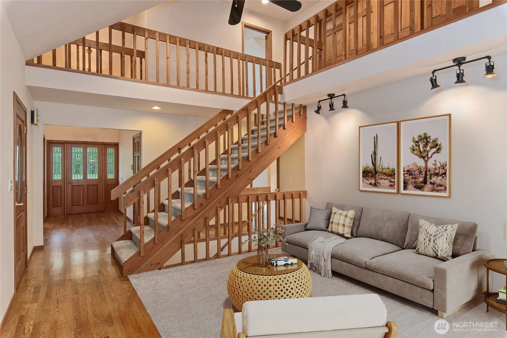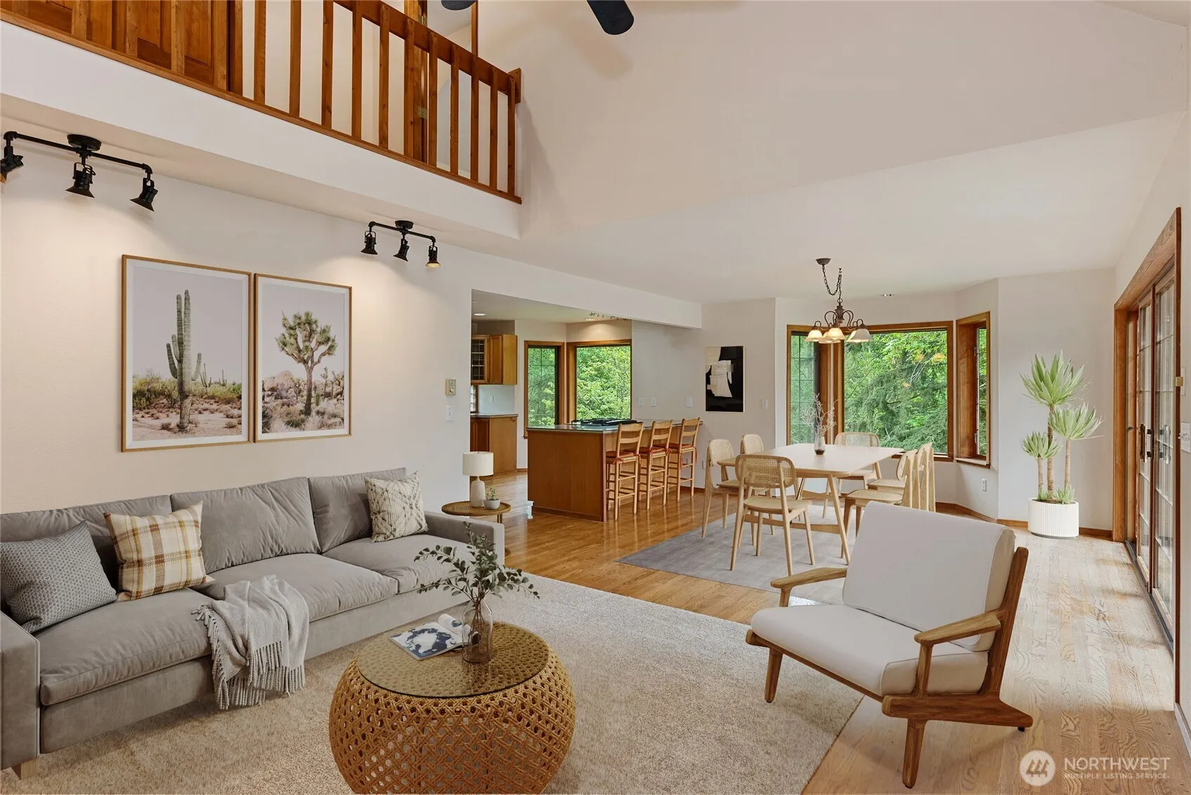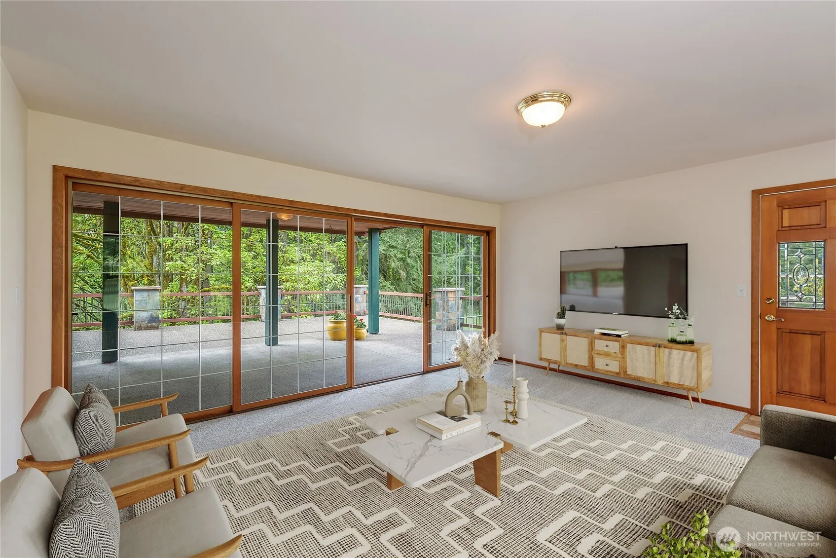 Custom home on 2 1/2 acres in Olalla. Lovely rural area of small farms on a quiet country street. Home is very spacious with large rooms and many windows throughout to enjoy nature and sunny northwest days. Living and great room open to a covered deck area. Three bedrooms on 2nd level and den/office with a walk in closet and full bath on main level. Kitchen is roomy with a nook for a small table or eat at the bar. Hobby/utility room off kitchen. Daylight Basement has a finished rec room with a propane free standing fireplace. There is a 900 sq. ft shop also in basement. Washer and dryer on 2nd level. Covered parking is at basement level. Large level yard is perfect for outdoor activities and a wooded area with creek to explore.