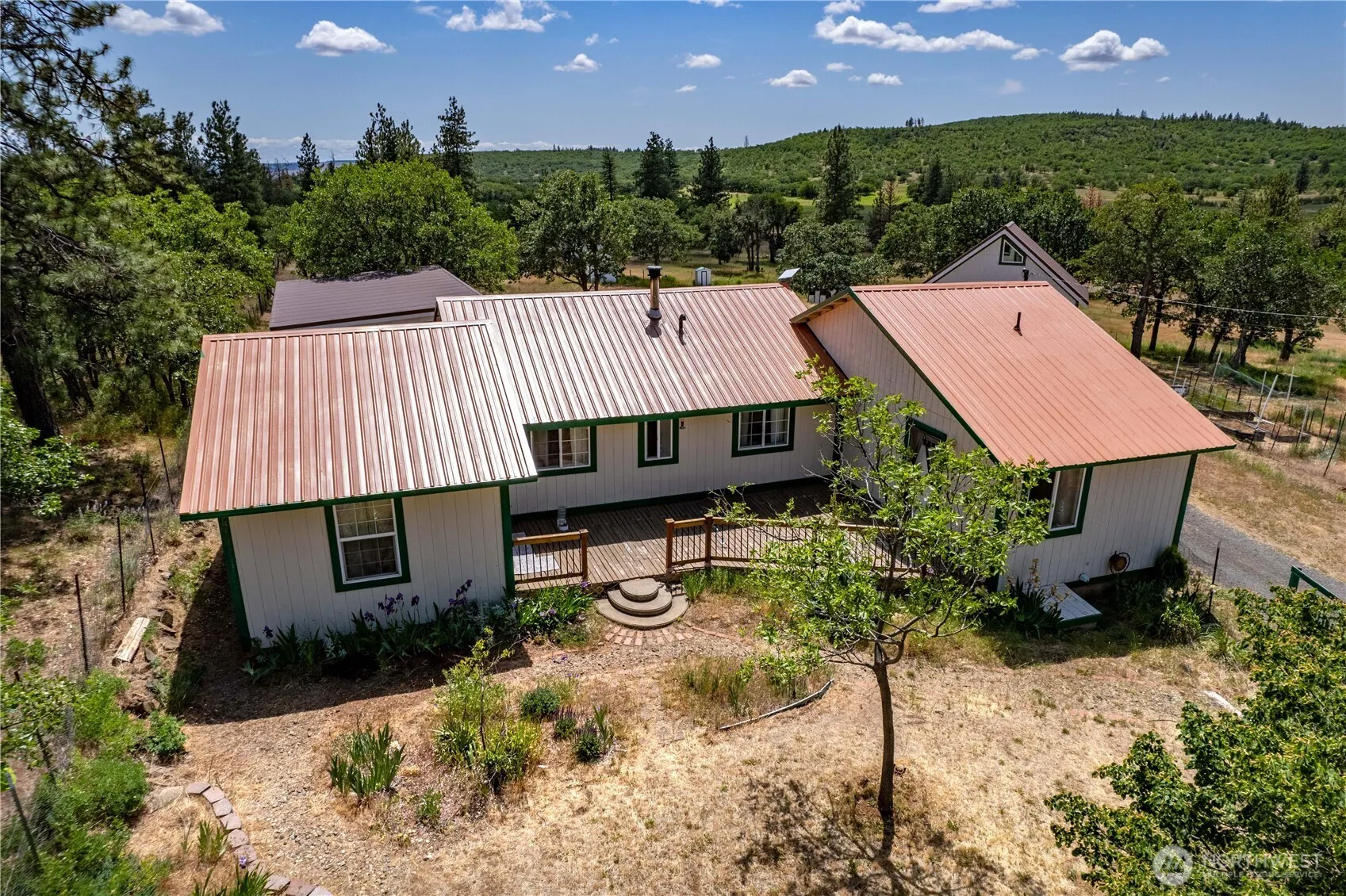 Welcome to your private retreat in the heart of Goldendale. Nestled on 5.18 peaceful, full-fenced acres, this charming 3-bed, 2-bath home blends comfort and function. Inside, enjoy brand new wall to wall carpet flooring, a cozy wood stove, and a spacious primary suite with a jetted tub and walk-in closet. Step outside to find everything you need-raised garden beds, a chicken coop, dog kennel, and multiple paddocks ready for livestock. A detached shop with a guest loft offers space for hobbies, guests, or rental income. With Starlink internet, two wells, a new cistern, and no HOA, level 2, 50 amp, 240 volt EV charging receptacle, this is the perfect mix of rural freedom and modern convenience. Peace & privacy all waiting for you.
