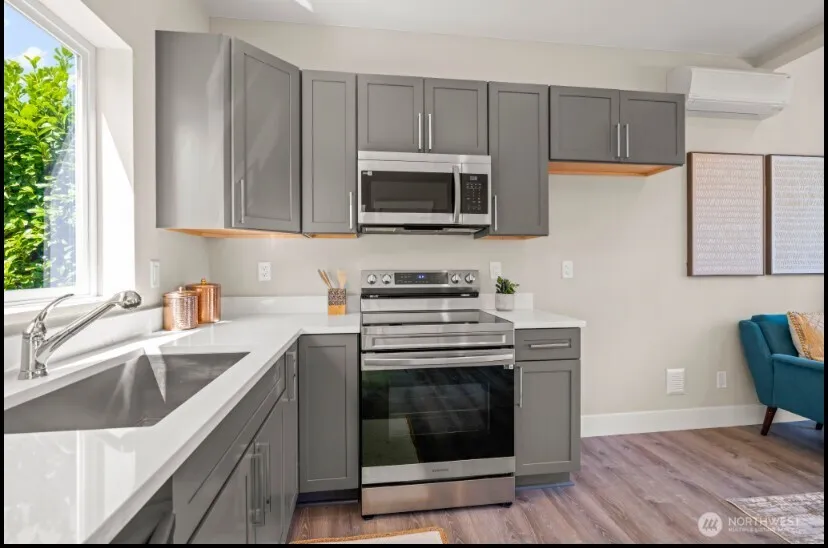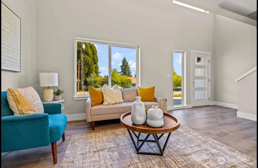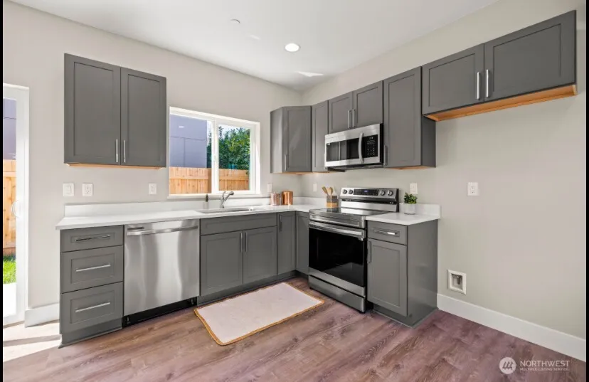 New community with five homes! Stunning new construction – modern home in Burien’s sought-after Boulevard Park! This 2-bed, 2.5-bath stunner features sleek architecture with vaulted ceilings, large windows, and covered terraces that fill the home with natural light. Enjoy designer finishes including quartz countertops, white millwork, luxury vinyl plank flooring, upgraded fixtures, and mini-split heating with C/A. The open dining area flows to a private patio and fully fenced, landscaped yard – perfect for entertaining. Includes on-demand hot water and a spacious 2-car garage. Just minutes to beaches, parks, Old Burien shops and dining, plus easy freeway access.