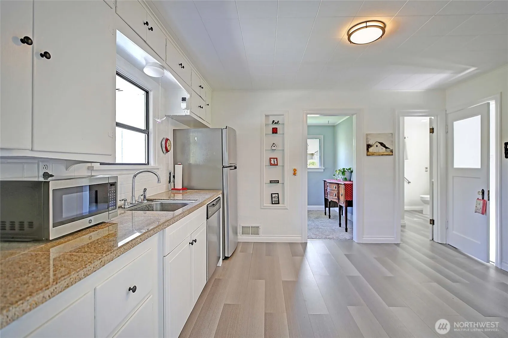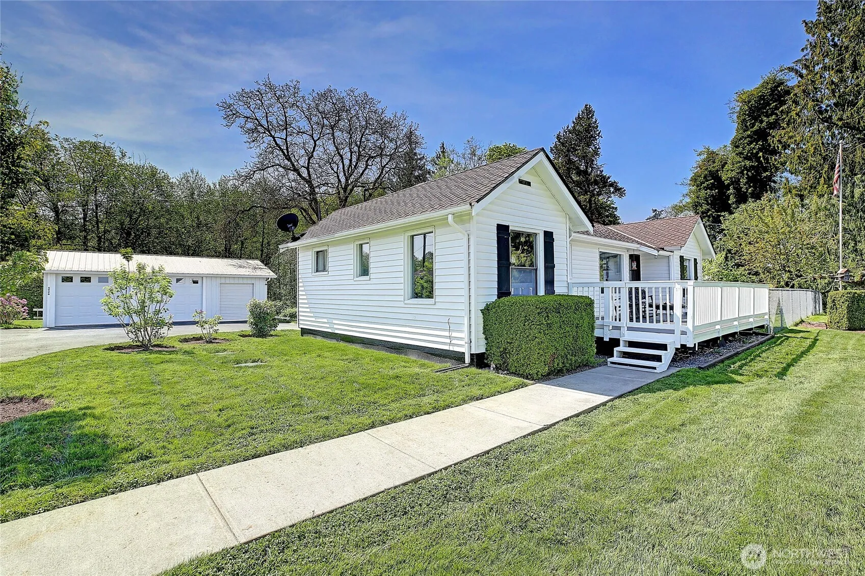 Charming 100-Year-Old-Famhouse! Step back in time while enjoying modern comforts in this beautifully preserved 2-bdrms, 1-bath farmhouse nestled on a full acre. Surrounded by mature trees, fully fenced yard, this home offers the perfect blend of rustic charm and everyday functionality. Inside, you’ll find a welcoming layout featuring a spacious dining room, living room with cozy fireplace, and plenty of natural light. Outside, a large, updated deck provides the ideal space for relaxing or entertaining, while the detached two-car garage includes a generous workshop area—perfect for hobbies, storage, or home projects. Enjoy the peace of country living just a short drive from town amenities. Plus, a 336 sq ft basement. 5 minutes from I-5.