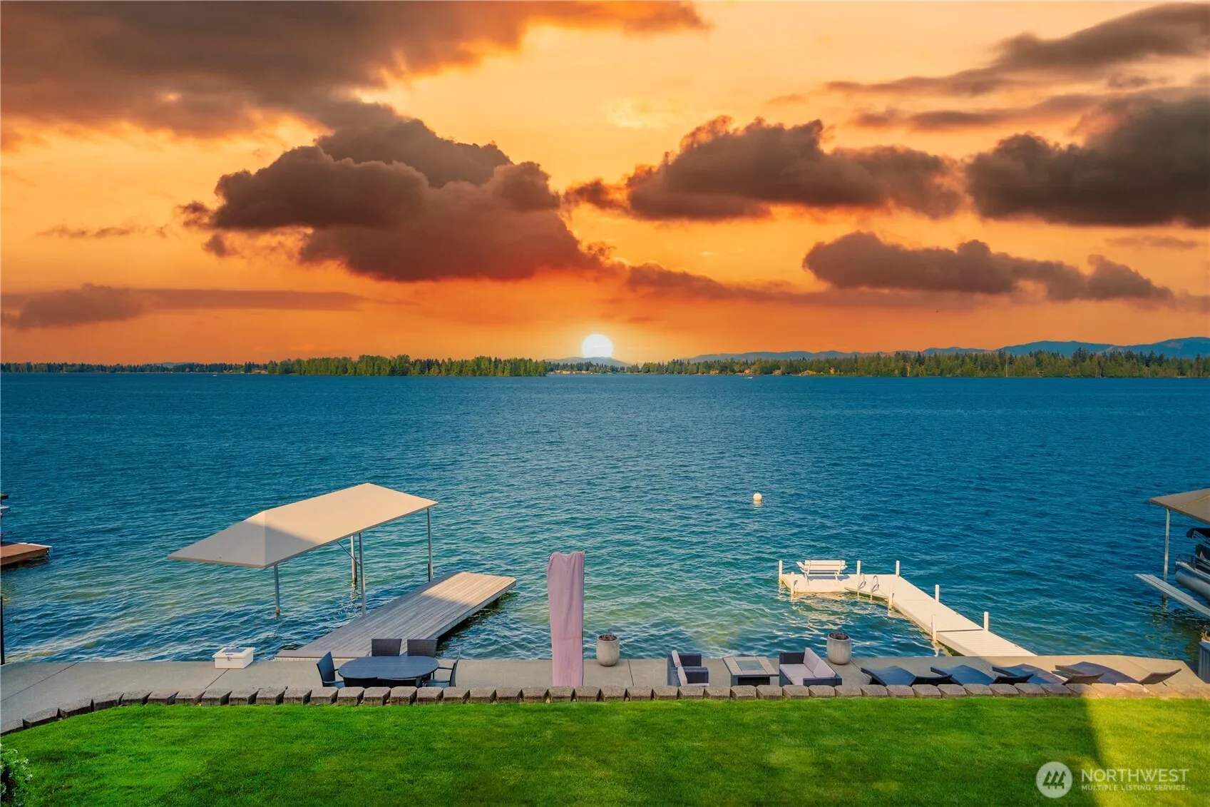 Bask in panoramic views of Lake Tapps and the majestic Cascades from this custom, turn-key waterfront estate on Jenks Point. Impeccably maintained with A/C, lush professional landscaping, and a full sprinkler system. Enjoy 81 feet of premier open-water frontage from expansive decks – ideal for entertaining, soaking in the new hot tub, or savoring lakefront sunrises. The main-level primary suite is complemented by a chef’s kitchen with slab granite, high-end appliances, and a spacious pantry. The lower level boasts a luxe media room, sleek wet bar, brand-new sauna and more. A rare 3-story garage/shop accommodates an RV plus two cars, in addition to the attached 2-car garage. Experience elevated lakefront living.