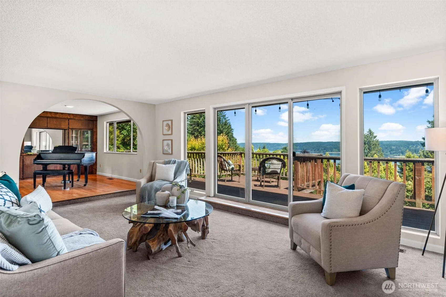 Sweeping views of Colvos Passage, this peaceful tri-level mid-century home in Gig Harbor North offers a rare blend of space, character, and setting. Just 10 minutes to downtown and minutes from shopping, dining, and top-rated schools. Inside, you’ll find fresh interior paint, hardwood floors, newer carpet, and a renovated primary suite with an updated ensuite bath. The spacious living area opens to a large entertainment deck—perfect for relaxing or hosting with a view. A designer-rendered plan for a new kitchen and custom fireplace built-in is included to inspire your vision. Bring your mini farm and enjoy room to roam with stunning water views as your backdrop.