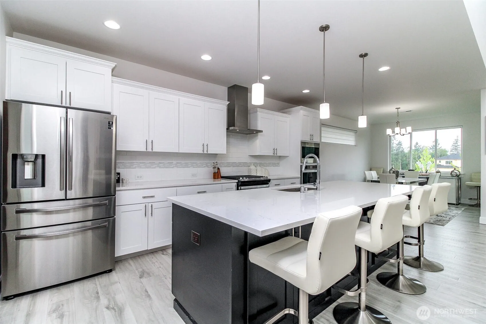 Impressive 5 bedroom Open Concept home. Features soaring ceilings, lots of windows, large bedrooms and more! Spacious entry, large open kitchen with breakfast bar/center island, stainless appliances, and a kitchenette area with even more counters and cupboards. Formal dining room with slider to covered back porch. Living area with gas fireplace, roomy utility room. Extra large living area located upstairs with small private lanai with majestic views of the mountain. Two primary bedrooms w/private baths on main floor and both with walk in closets. Fully fenced backyard, 3 car garage, and plenty extra parking!