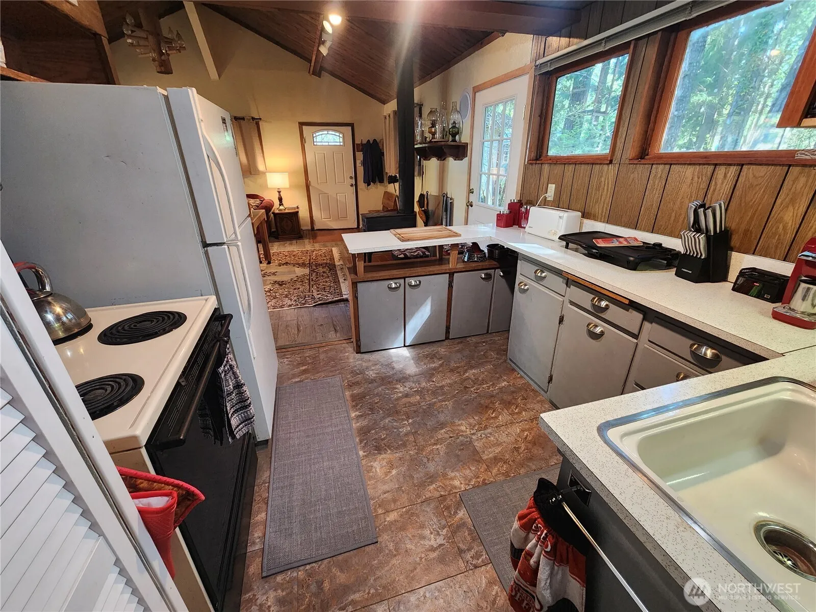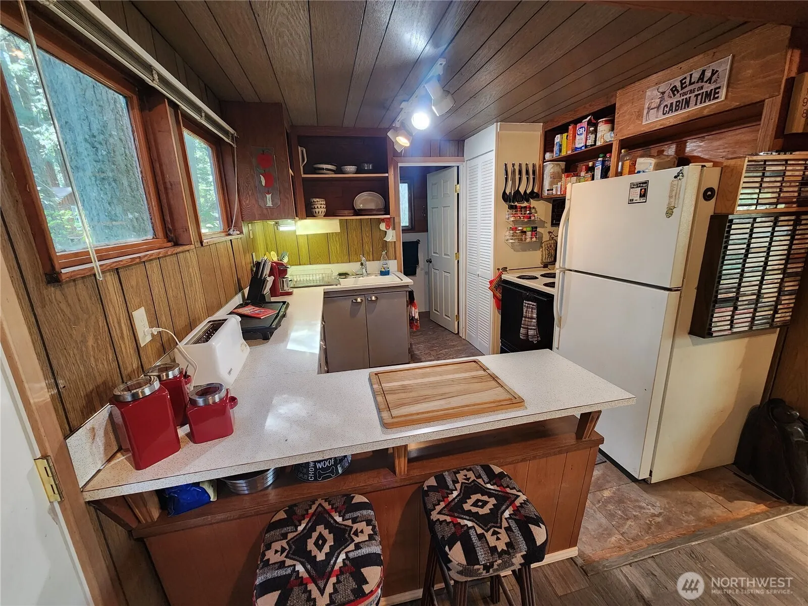 2 bed, 1 bath cabin with detached bunkroom on a double lot (.42 acre) in High Valley 1. Fire pit overlooks natural backyard and dry creek bed. The open concept living room and dining room opens to vaulted ceilings. Primary bedroom also has vaulted ceilings. House is surrounded by trees and natural landscaping giving the feeling of seclusion. High Valley Country Club dues include water, golf course, pools, clubhouse, playground, and community trails.