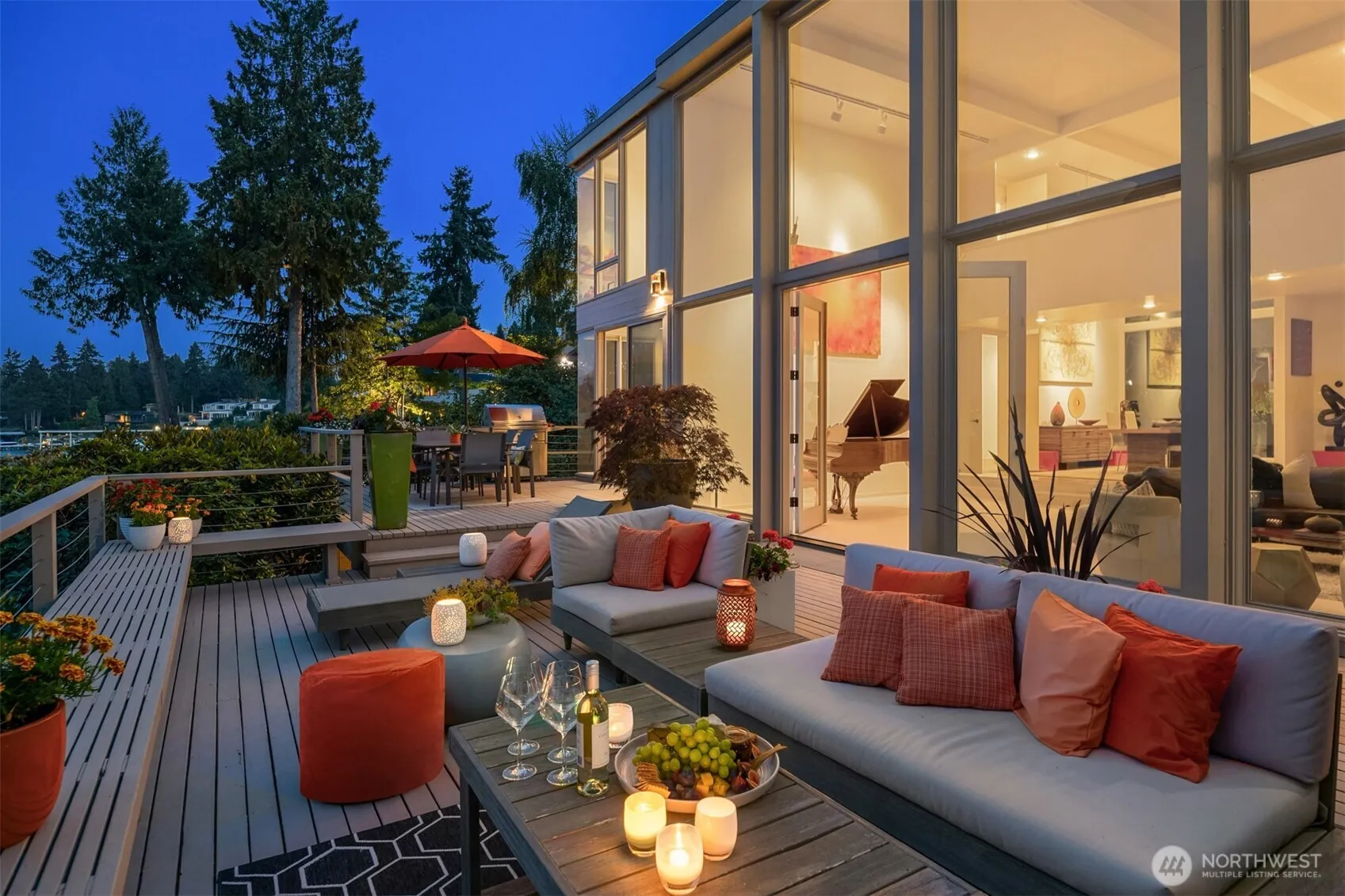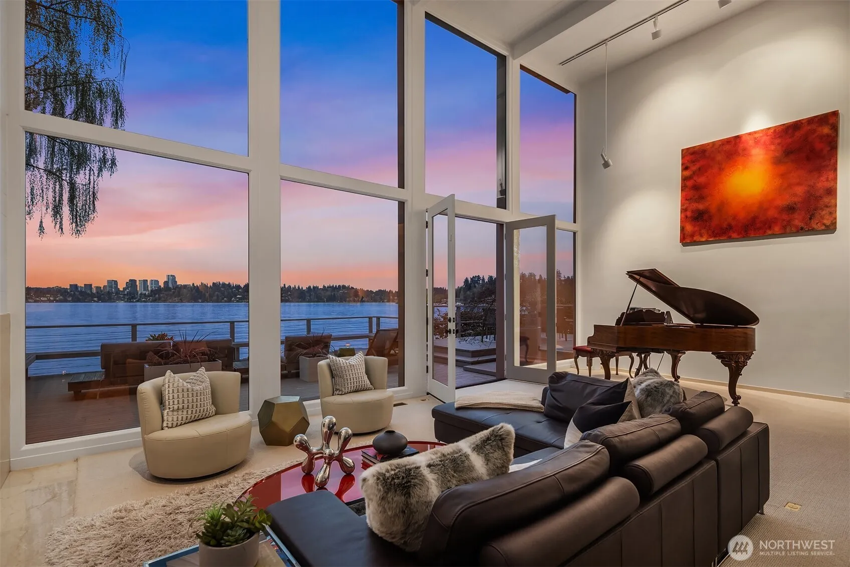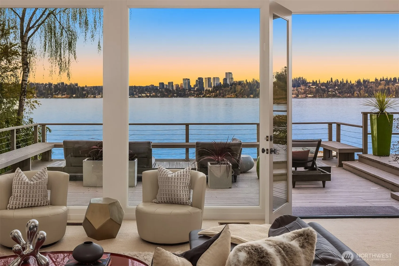 An extraordinary statement of mid-century modern style with sweeping views of Lake Washington at this renovated waterfront designed by renowned architect Reid A. Morgan. Ideally placed on the north end, this lakefront residence features walls of glass framing water views from dawn to dusk. The two-story great room and outdoor living spaces offer a front-row seat to boaters, sunsets & the ever-growing downtown Bellevue skyline. 82 feet of waterfront, dock with boat lift. Indoors, the floor plan offers an updated, view kitchen, boasts two primary suites + office + den + exercise/rec room. Lush grounds originally designed by Robert Chittock. Just a three-minute drive to town!