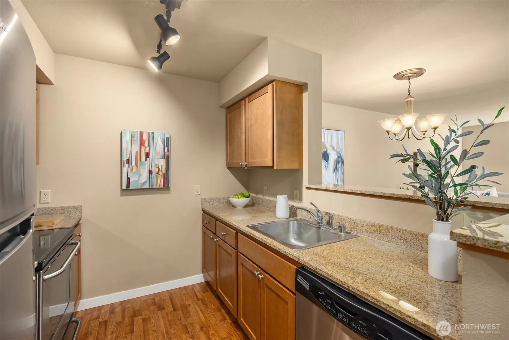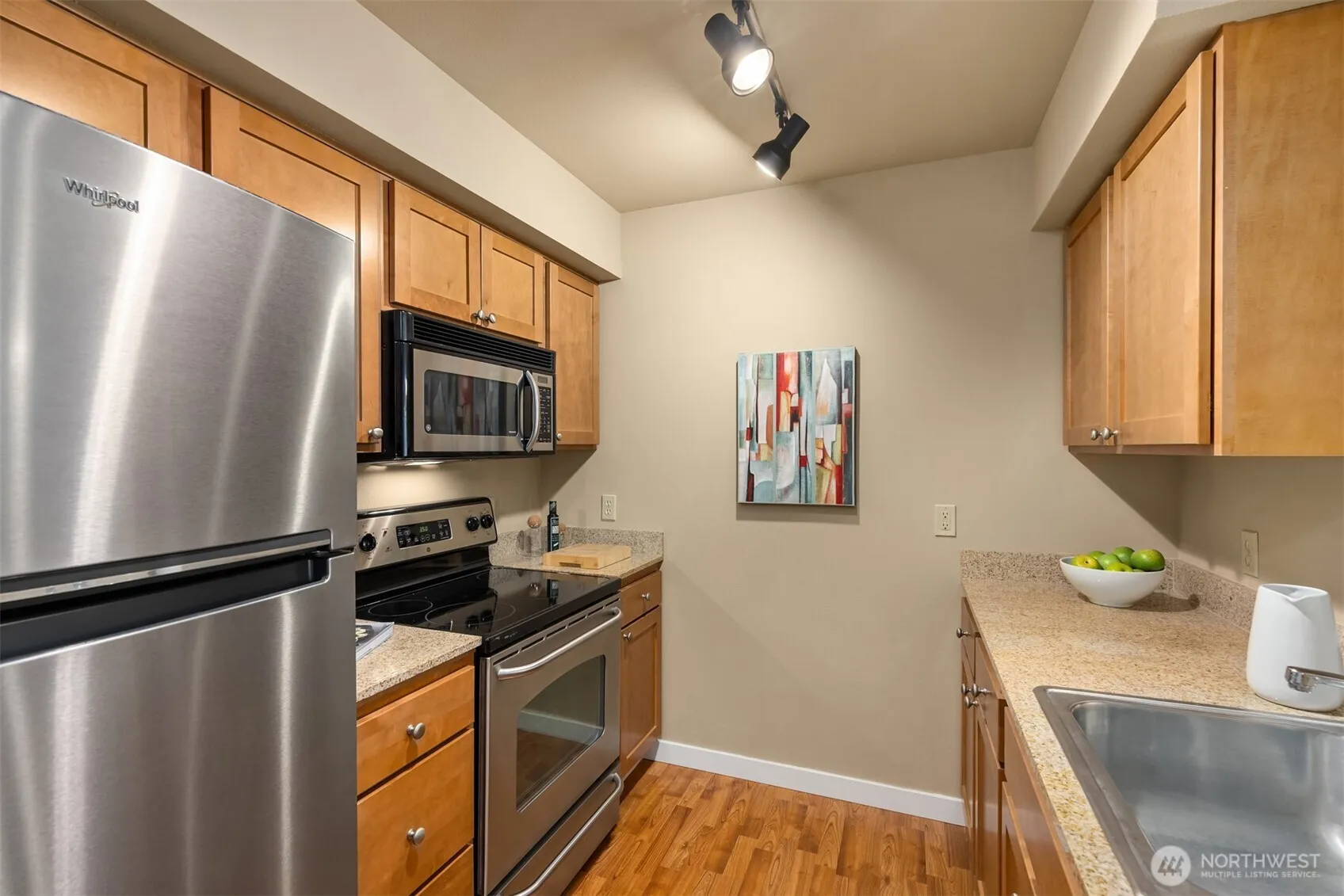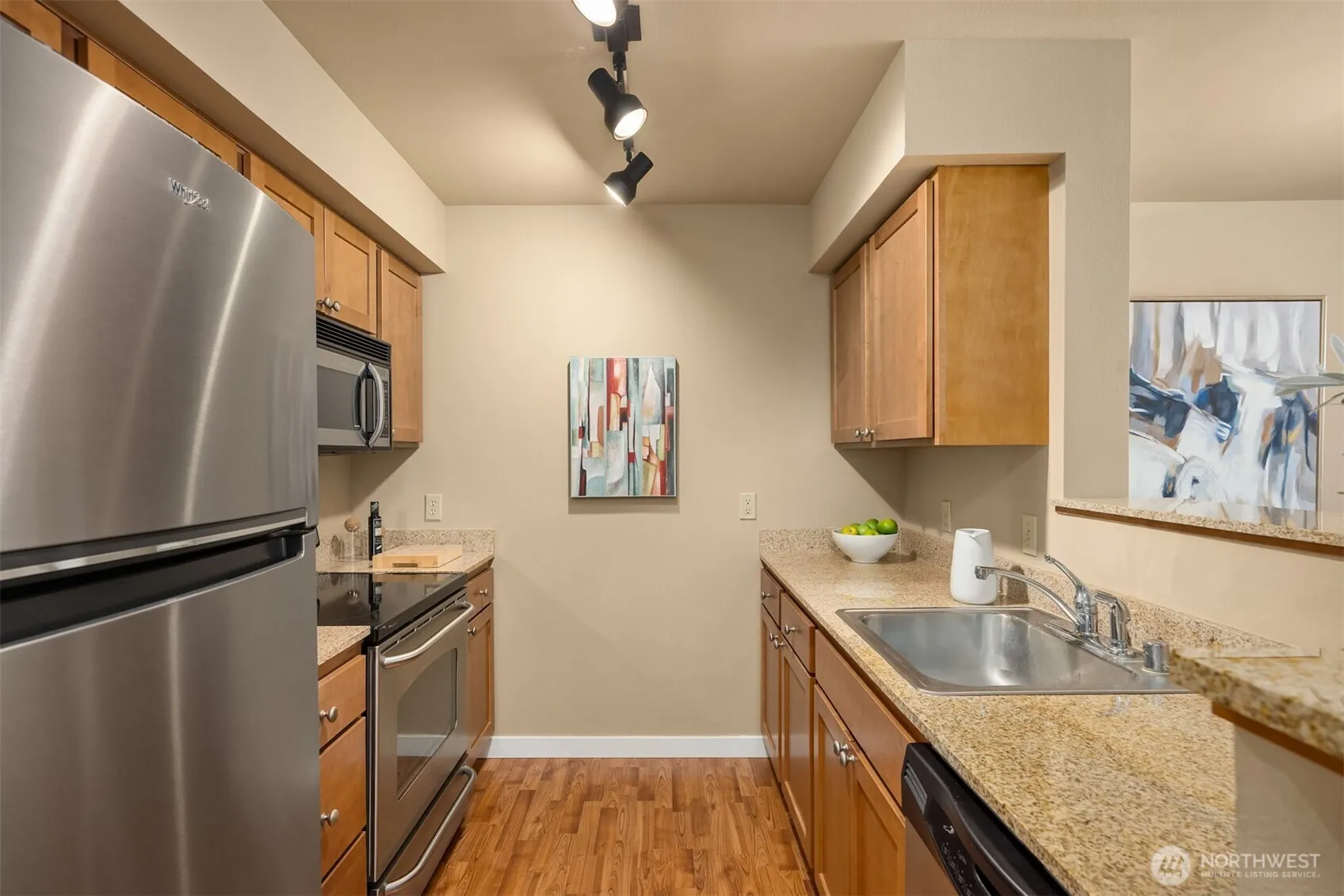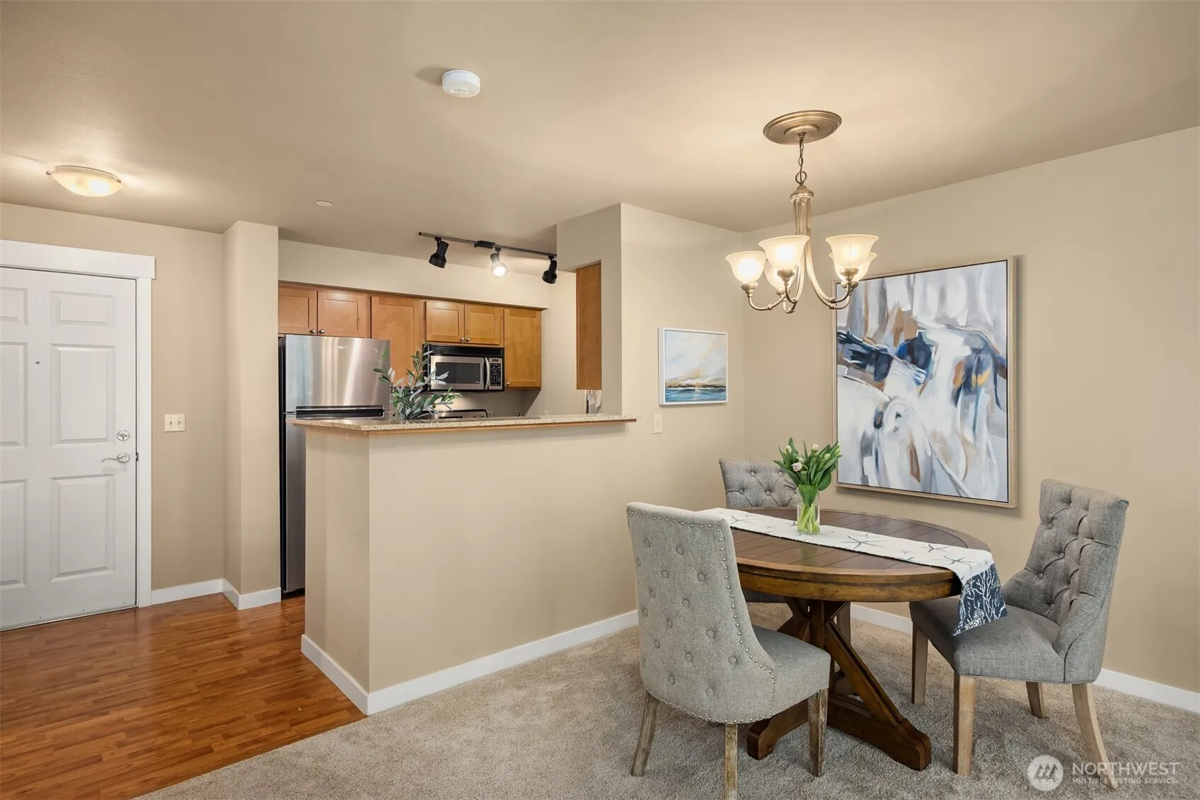 Welcome to Island Crossings, a condominium close to shopping, public transit, and island amenities such as an aquatic center and library. This one-bedroom home has been lightly lived in and well maintained. Enjoy a dedicated parking space in a secure garage, and building access from lobby with code or key only. An elevator will whisk you to the third floor, where this home is located on the west side of the building. A private Juliette balcony has a view of deciduous trees and the western sky. Community open space to the north abuts the 23-acre Sakai Park.
