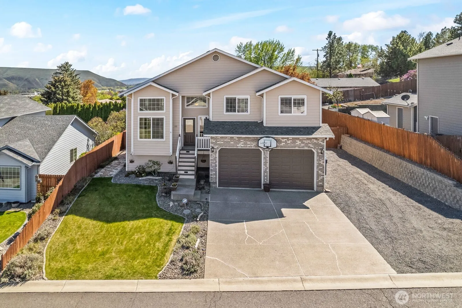 Beautifully updated 4 bed, 3 bath home with views of Selah Valley. Recent upgrades include new HVAC, flooring, paint, and a gas fireplace in the lower-level living room. Multi-level layout offers privacy and function with a finished lower room perfect as a theater or bonus space. Kitchen features tile counters, wood cabinetry, and stainless appliances. Enjoy the outdoors from the expansive deck overlooking the fully landscaped yard with a water feature. 2-car garage with 528 sq ft and excellent curb appeal. Located on a .20-acre lot in a quiet Selah neighborhood. Contact your favorite Realtor for a private showing.
