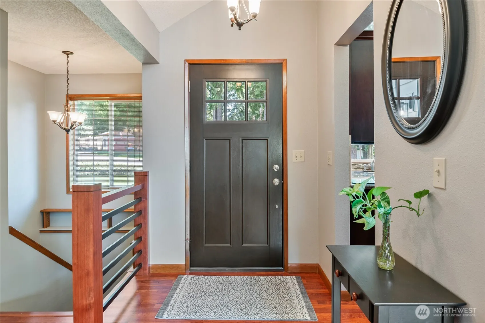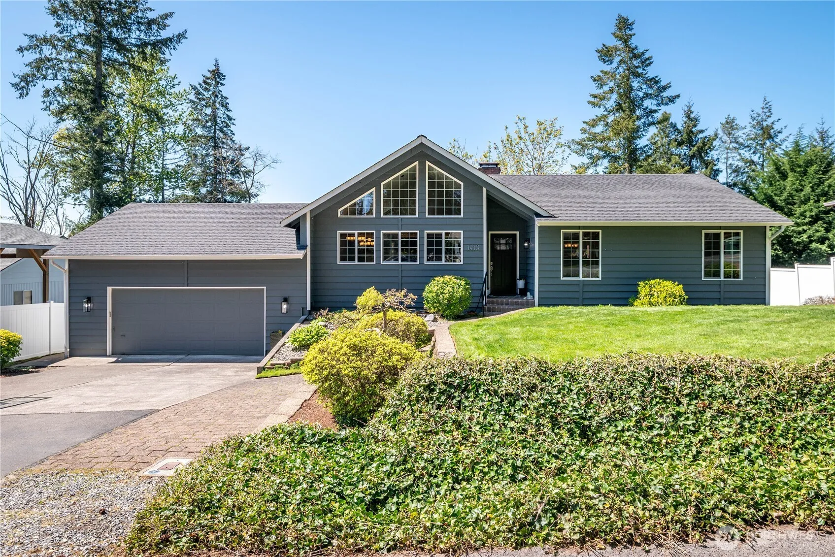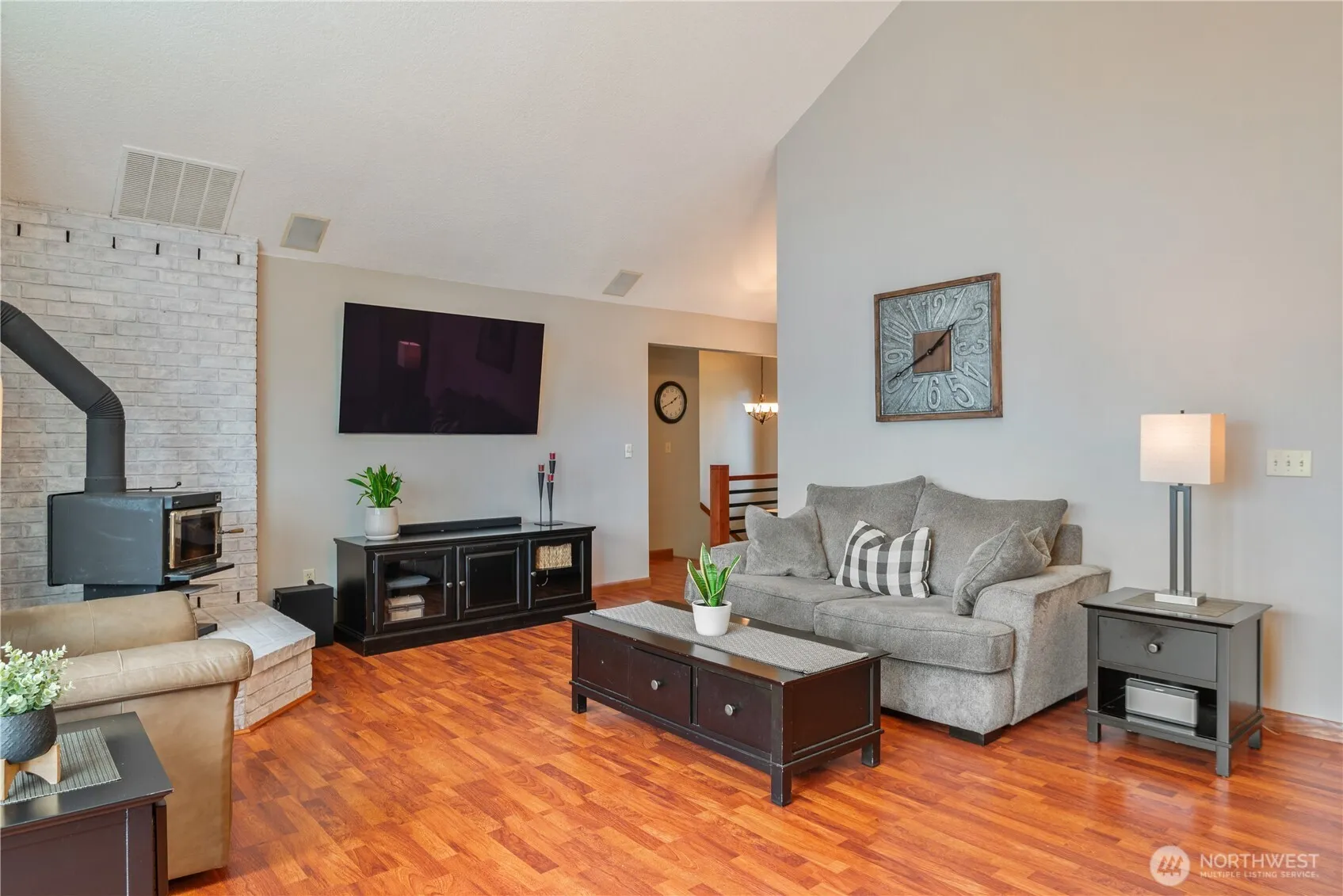 This lovely 4 bed, 3 bath home is located in a peaceful neighborhood on a dead-end street. Gorgeous front yard yet close to everything! Enter on the main level to vaulted ceilings and large windows. Step right out your sliding door onto the newer 45×10 composite covered deck—great for entertaining while overlooking the beautiful fully fenced backyard. Enjoy the living and dining area with a cozy wood stove and beautiful floors. The kitchen features granite countertops with an attached 2-car garage off the kitchen. Down the hall is the primary bedroom with a walk-in closet, bath, and sliding door to the deck with stairs to the patio below. Also on the main level is a bedroom and bath. Downstairs features a large family room with a wood stove