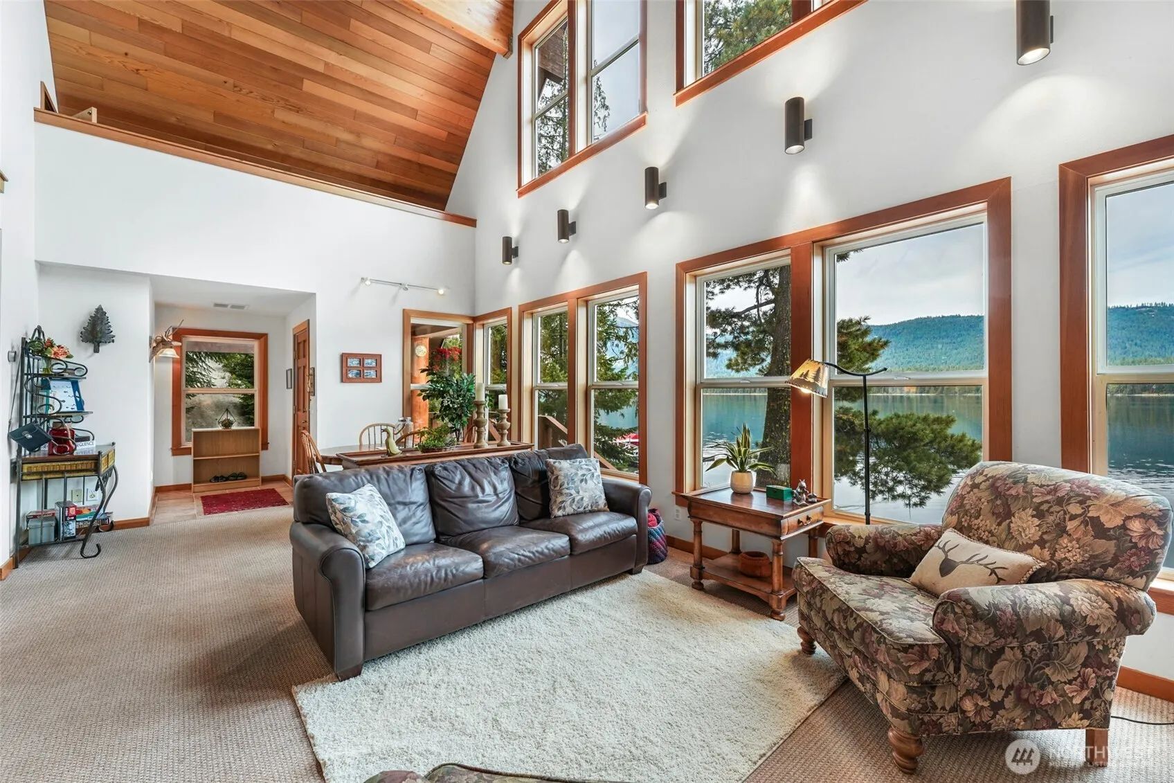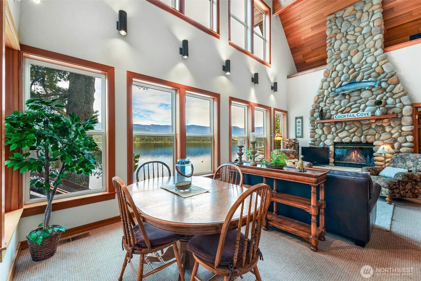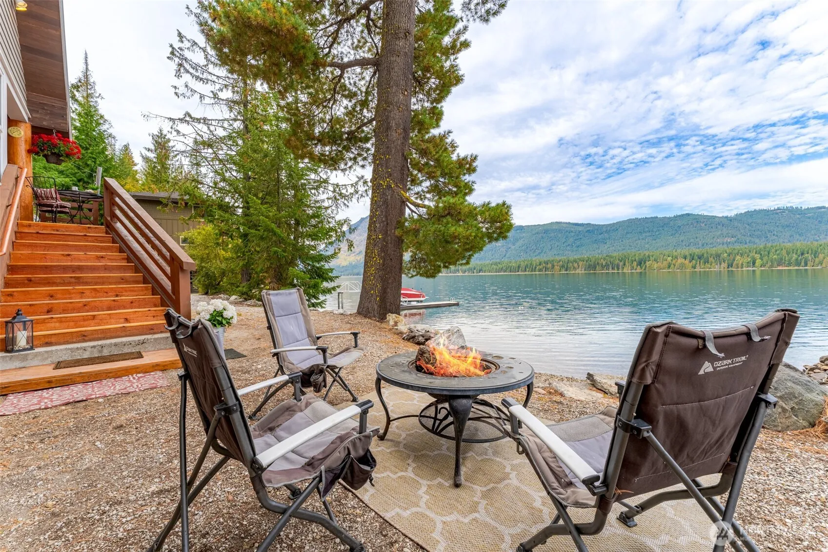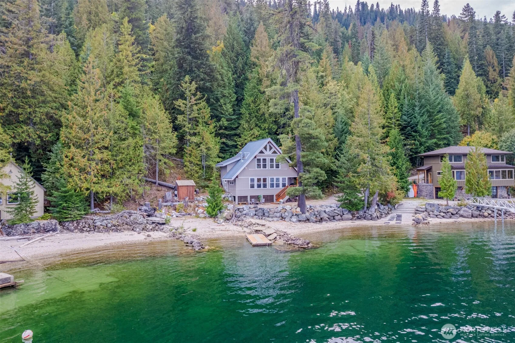 Welcome to Your Private Lakefront Oasis! Nestled right ON Lake Wenatchee this cozy lake front home has approximately 110 feet of waterfront offering a floating dock and a private sandy beach right out your door! Enjoy the breathtaking lake and mountain views from the beach and from the home’s floor to ceiling windows. The home is flooded with natural light with vaulted ceilings and open concept living. The stone fireplace and quality wood ceiling and wood touches throughout, offers a tranquil rustic charm. Two charming bedrooms are upstairs, with a third bedroom/den located on the main level. Outdoor living offers the perfect blend of nature and tranquility in this lakefront retreat! Parking right at the home and is being sold furnished.