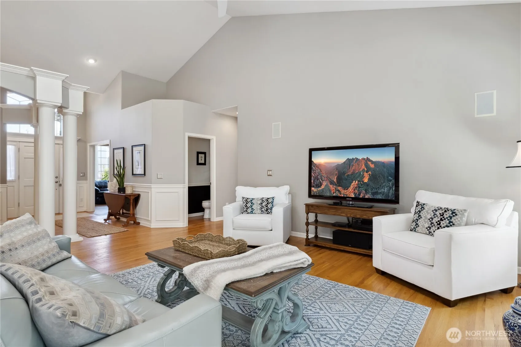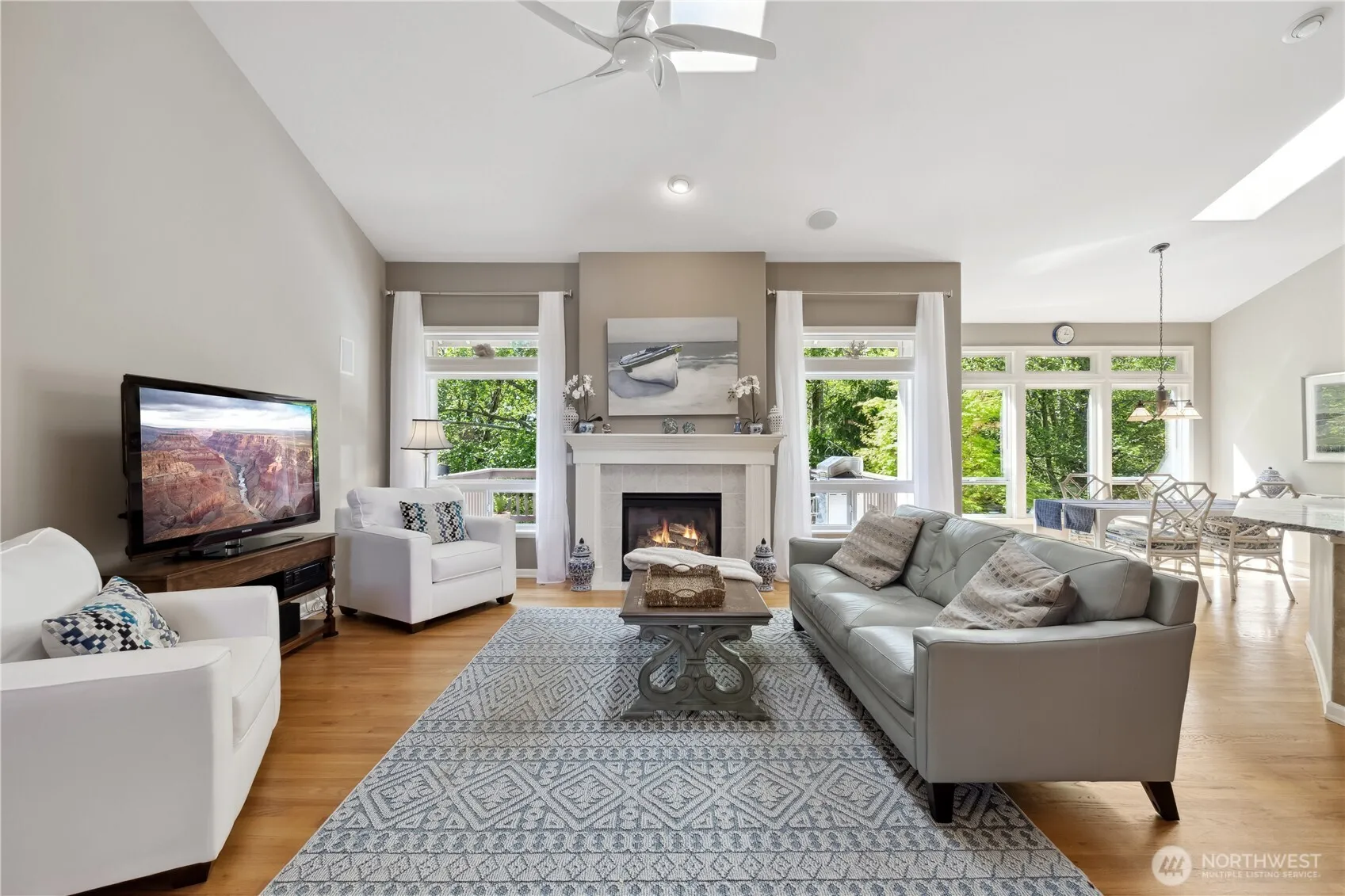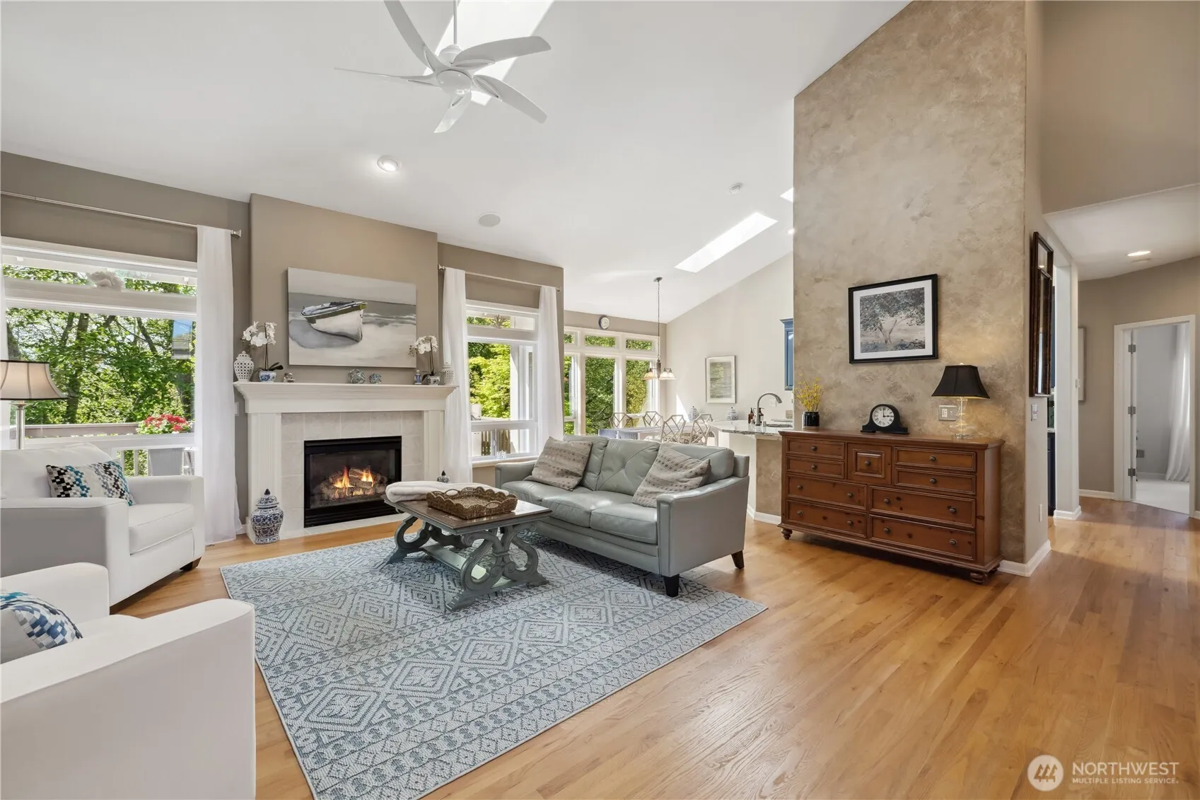 Welcome to breathtaking Smugglers Cove in sought-after Mukilteo. This elegant, light-filled 1-level home w/great room floor plan is complete w/soaring ceilings, gleaming hardwoods, built-in speakers, living room, gas FP, 2 dining areas, a large office w/vaulted ceiling & a beautifully updated kitchen w/granite counters & new stainless-steel appliances. Spacious back deck; home backs to greenbelt for added privacy. 3 beds include lovely primary suite w/full bath & walk-in closet. Full guest bath. Gorgeous landscaping is easily cared for w/Bluetooth sprinkler system. Beautiful Monier concrete tile roofing. Central A/C. 3-car garage. Brand-new W/D. Enjoy several nearby parks, easy ferry access & convenient commuting to major business centers.