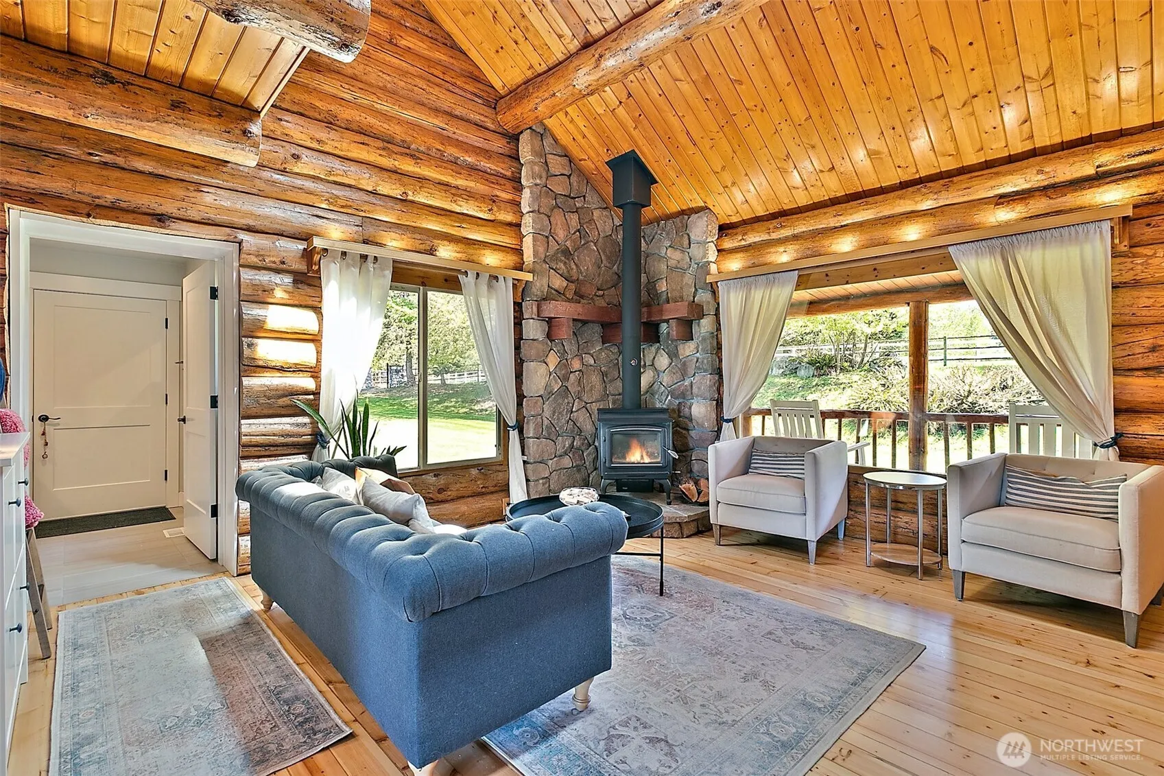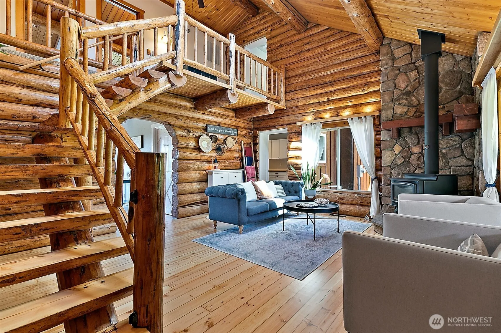 Discover this exceptional log home with breathtaking panoramic views of the Orting valley & the Cascade Mountain range, blending rustic charm with upscale amenities. Entertain with a heated in-ground pool, sport court, and oversized garage with a bathroom for easy access while enjoying the pool & sport court. Enjoy vaulted ceilings, refinished hardwood floors, & a cozy wood-burning stove. The open-concept kitchen overlooks the valley, featuring stainless steel appliances and skylights that fill the space with natural light. Relax in the spa-like primary suite with heated floors, a soaking tub, & double shower. A guest suite offers a private bath & sunset balcony. All kitchen appliances included—brand new custom entry gate. Hot tub ready.