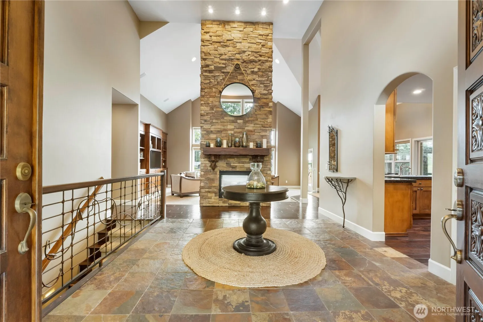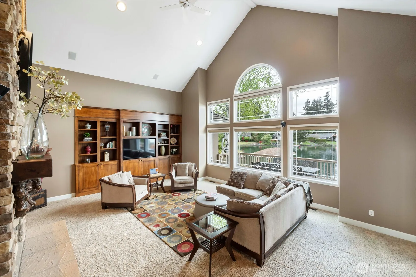 Exceptional Tapps Island western exposure waterfront home located in protected cove w/breathtaking sunsets & views. Step inside the grand entry with soaring 20-foot vaulted ceilings & open-concept living. Wall of windows floods w/natural light, showcasing stunning lake views. Gourmet kitchen is a chef’s dream, perfect for entertaining with top-of-the-line appliances & ample counter space. Main level boasts spacious primary suite, offering a private retreat w/luxurious amenities including jetted tub & sauna/steam shower. Lower level ideal for entertaining, featuring a wet bar in the family room, 3 add’l bedrooms, office + ample bathrooms. Covered outdoor living, pristine landscape, level yard & no-bank waterfront w/covered boat lift, 2 docks