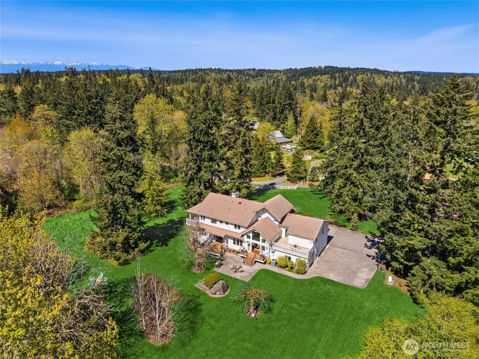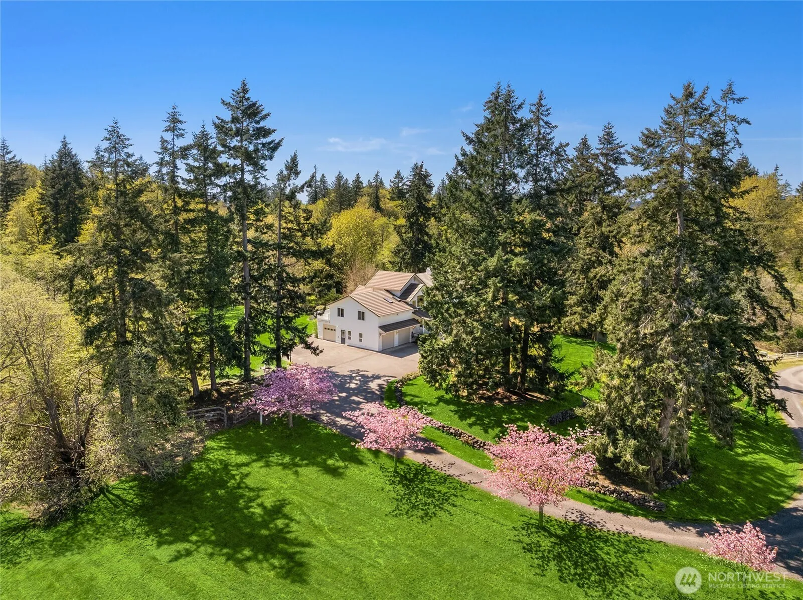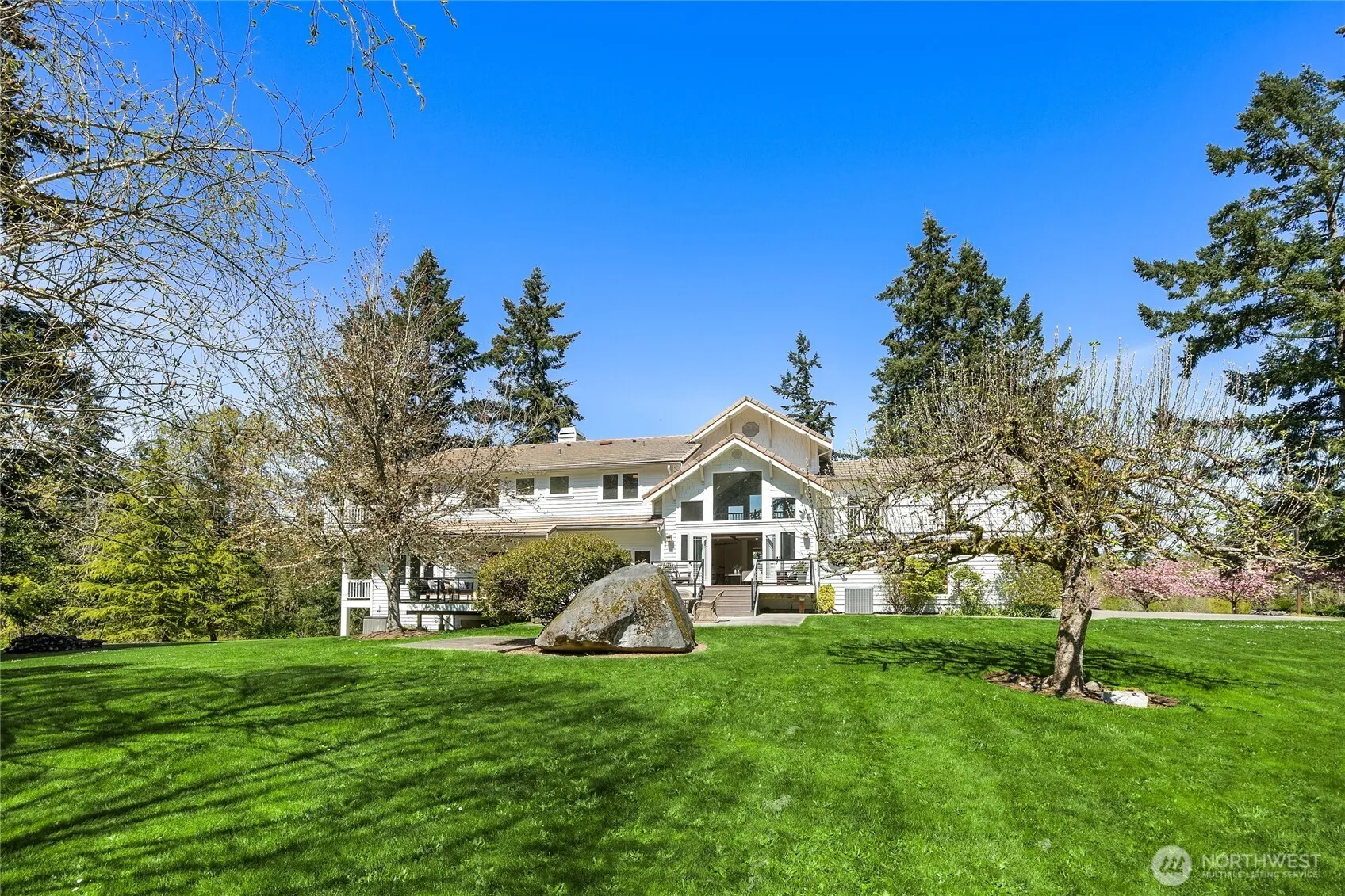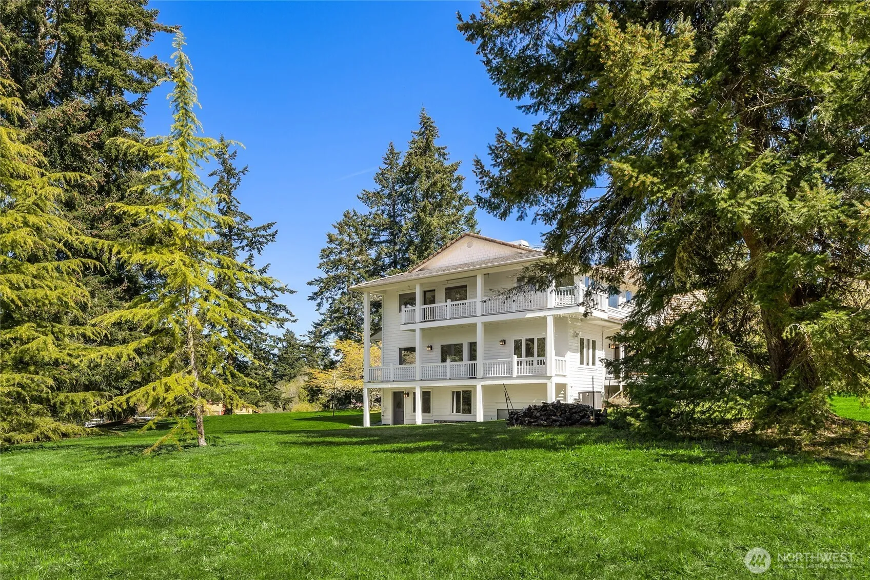 Breathtaking country estate located on top of sunny Fort Ward. A private drive leads you by pastures surrounded by white fences & parklike grounds. This grand home features large windows that bring in all-day sunlight. Entertain all your guests in the oversized dining room and double ceiling height living room with handsome wood beams and custom built-ins. The kitchen with high-end appliances has a fabulous eat-in area, too. Spread out into 4+ bedrooms, including the large primary suite featuring an office with a private deck overlooking the grounds, and a full basement. Head outside onto one of the many decks and take in the large yard perfect for all activities. A large pasture and your own private pond round out this south-end sanctuary.