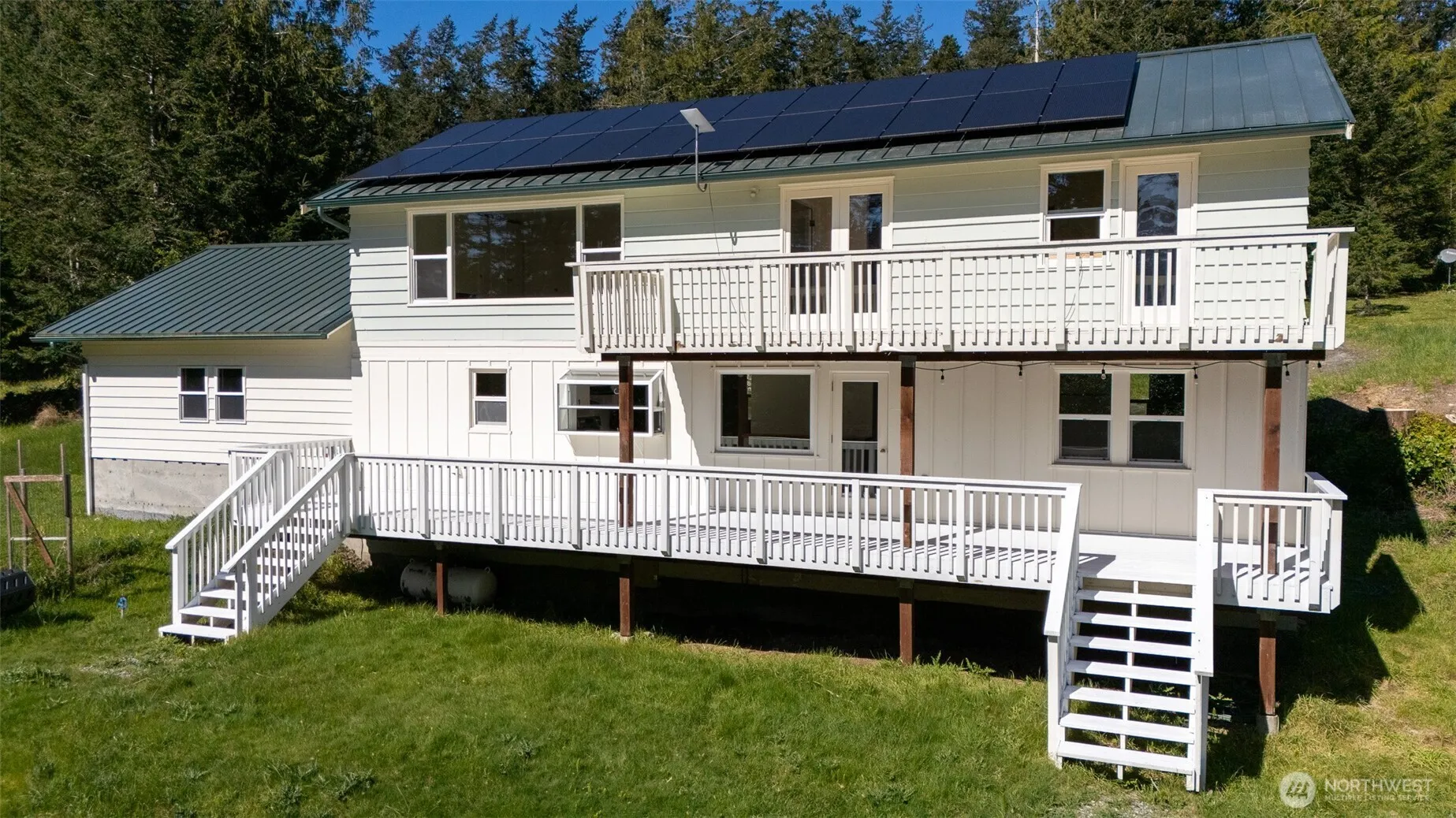 Sunny and spacious island living with community beach access on Lopez Island. From the stylish entry with a spiral staircase to the semi-open plan of the main floor, this three bedroom, two bath home on 0.459 acres, will make you feel at home. The generous primary suite, with built-in closets and fireplace, looks out over a vibrant forest. Ample room for entertaining on the main floor and the large, partially covered deck. Pantry/laundry room, two-car garage, metal roof, solar PV system, heat pump/mini-split, desal water system, fenced garden. Keep your kayak and crab pots at the community beach with its own picnic area, fire pit, and boat house right on Mud Bay. Hunter Bay dock and public beach are just down the road.