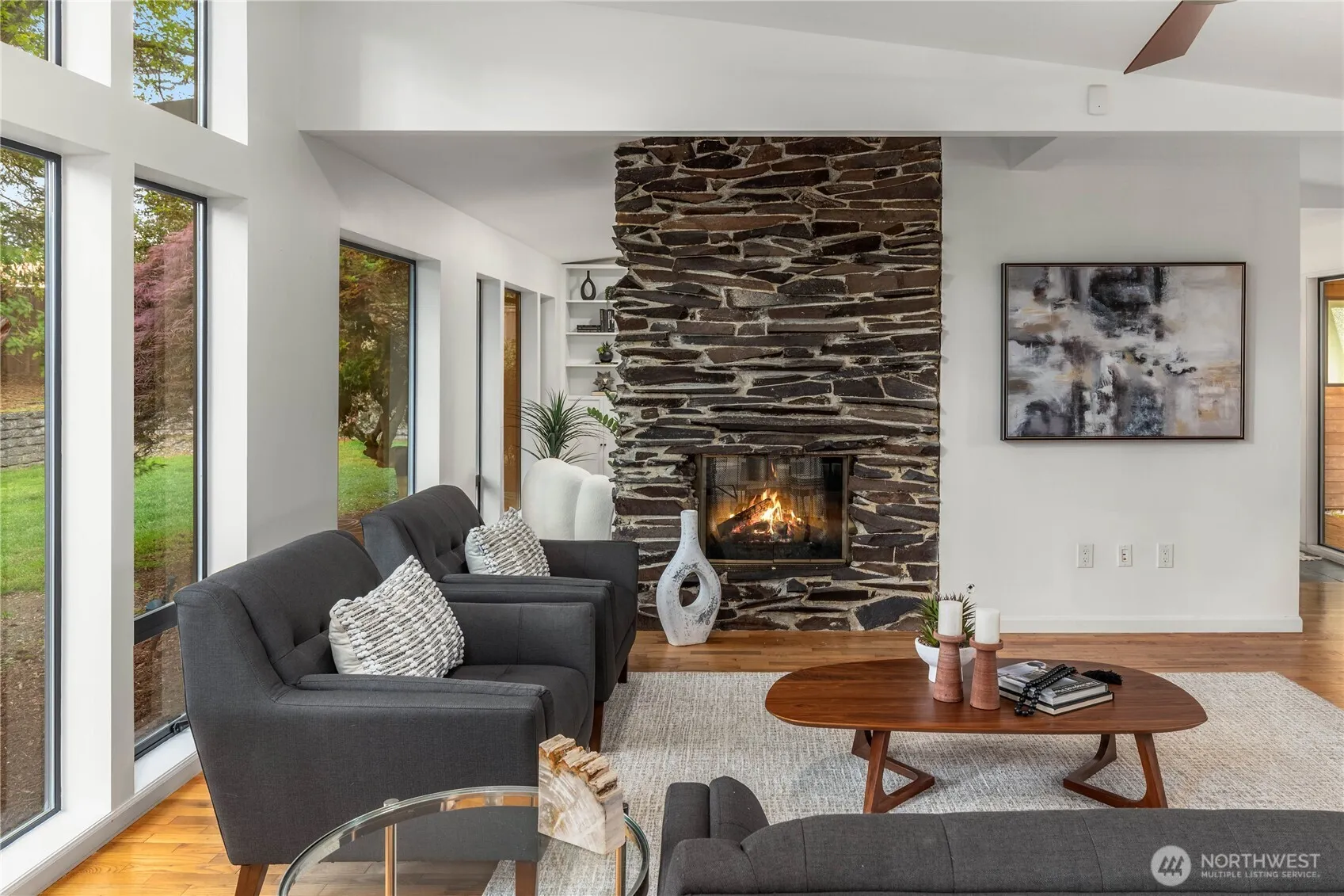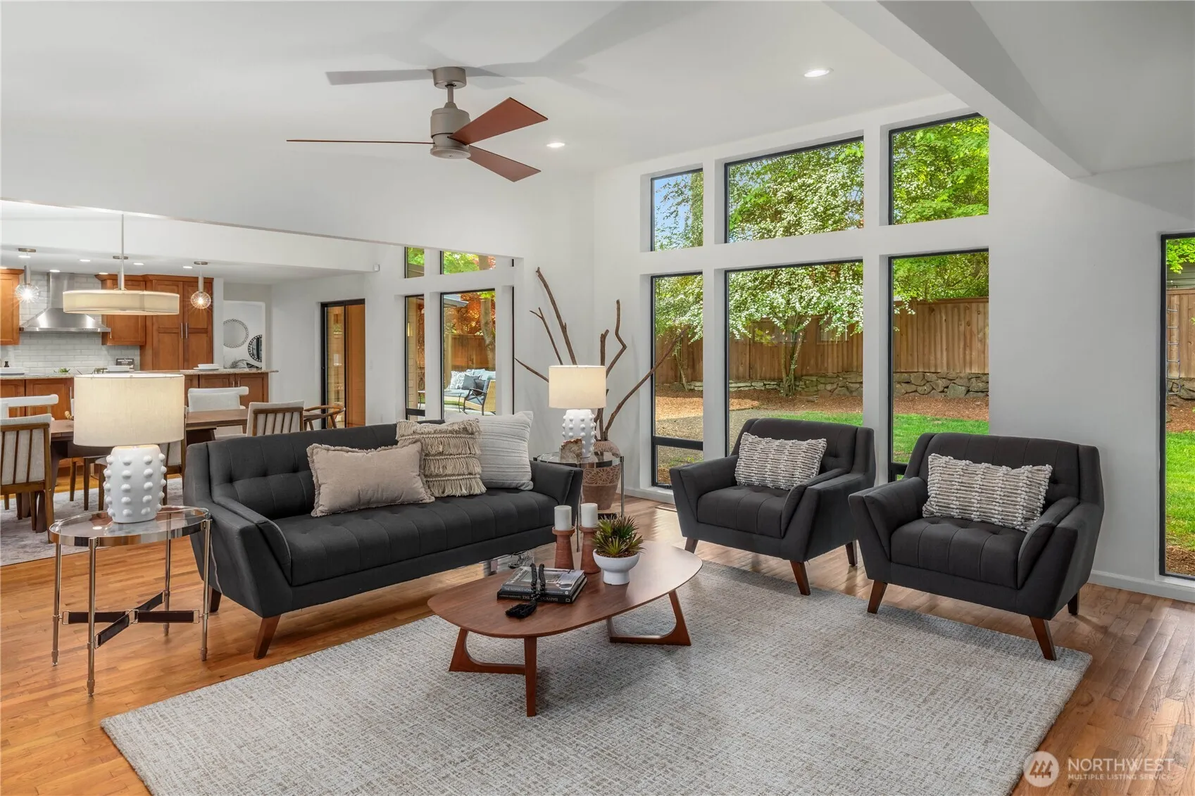 Perfectly blending mid-century modern style w/contemporary comfort, this updated 4BR/3.5BA rambler is designed for easy living. Open kitchen flows seamlessly into the spacious dining area & two bright living spaces divided by a stunning stone-surround fireplace. Separate family rm off kitchen adds more flexibility. Gleaming hardwood flrs & window walls bring in natural light & frame the level, fully fenced backyard—ideal for relaxing, playing, gardening. Primary features walk-in closet, ensuite bath & opens to backyard. Two more BR’s share a full hall bath, while the 4th BR has its own 3/4 bath & private patio. Thoughtful details include a mudroom w/dog wash, generous pantry & guest powder rm. True Northwest gem located in the heart of MI!