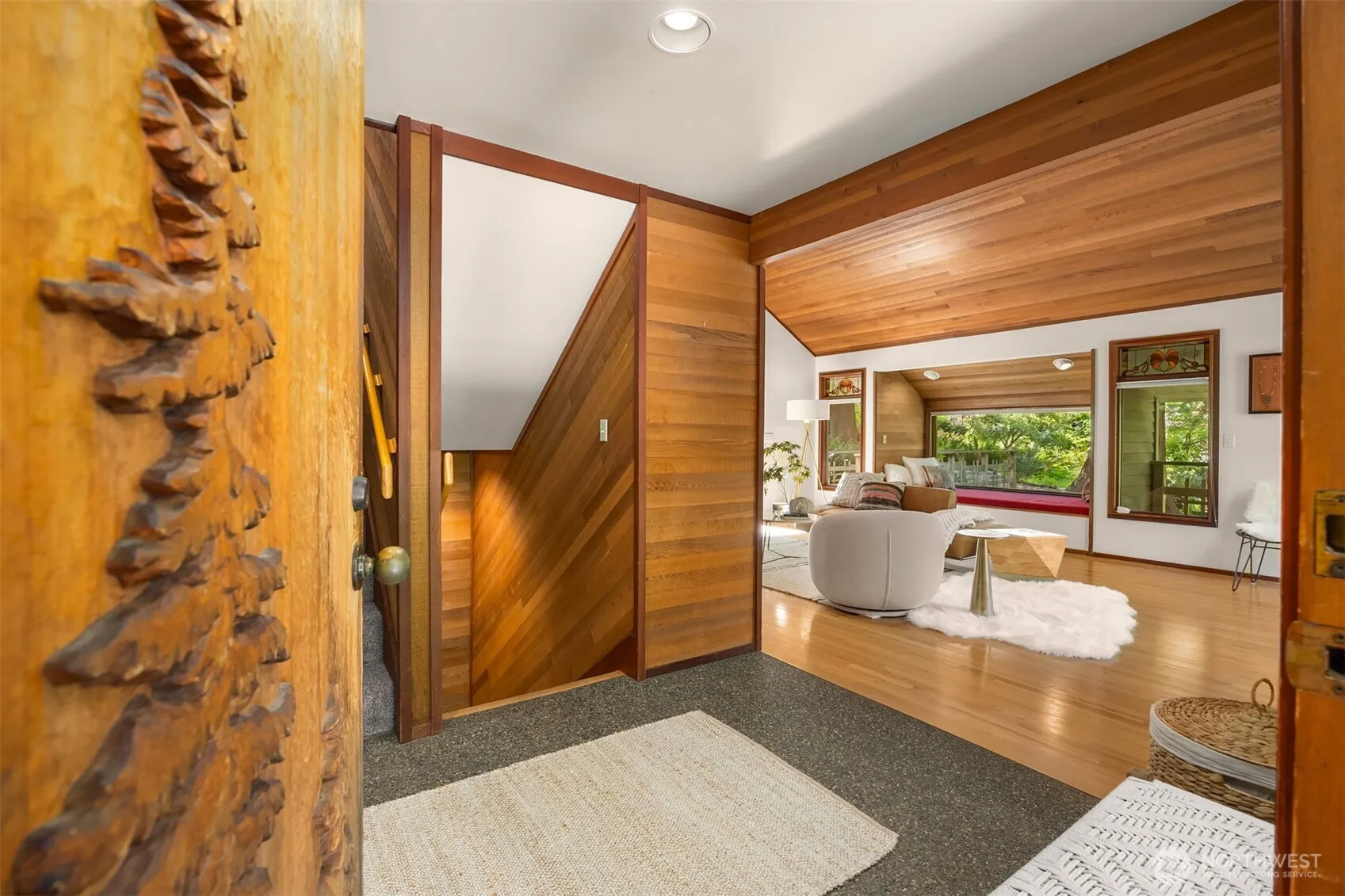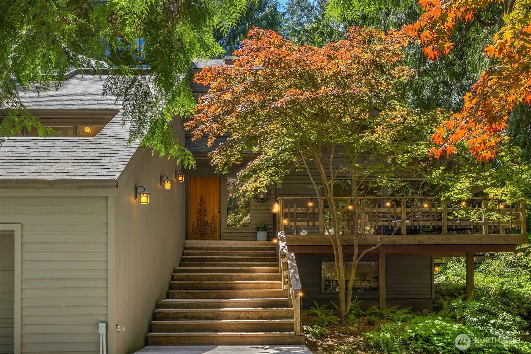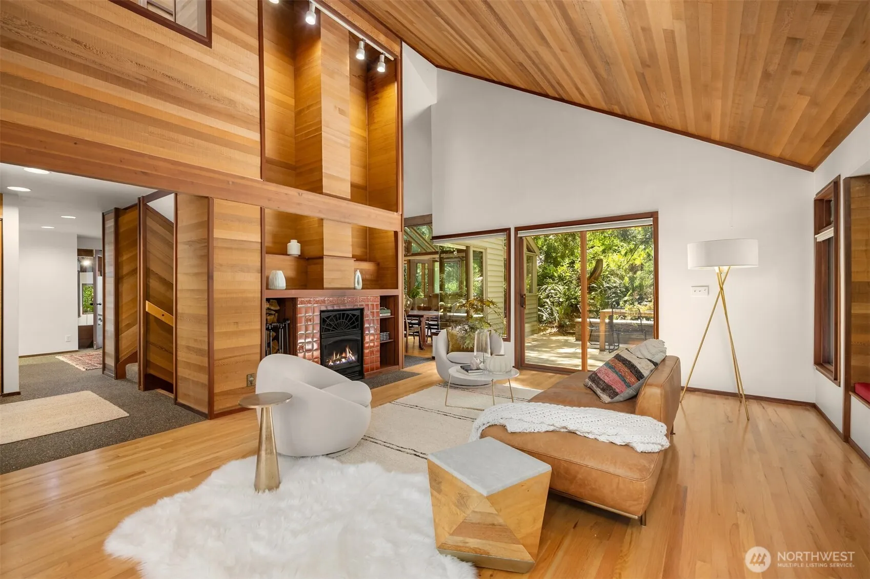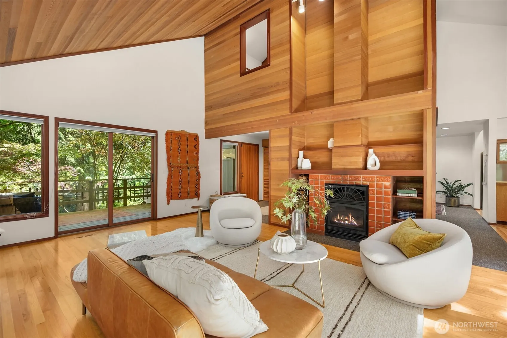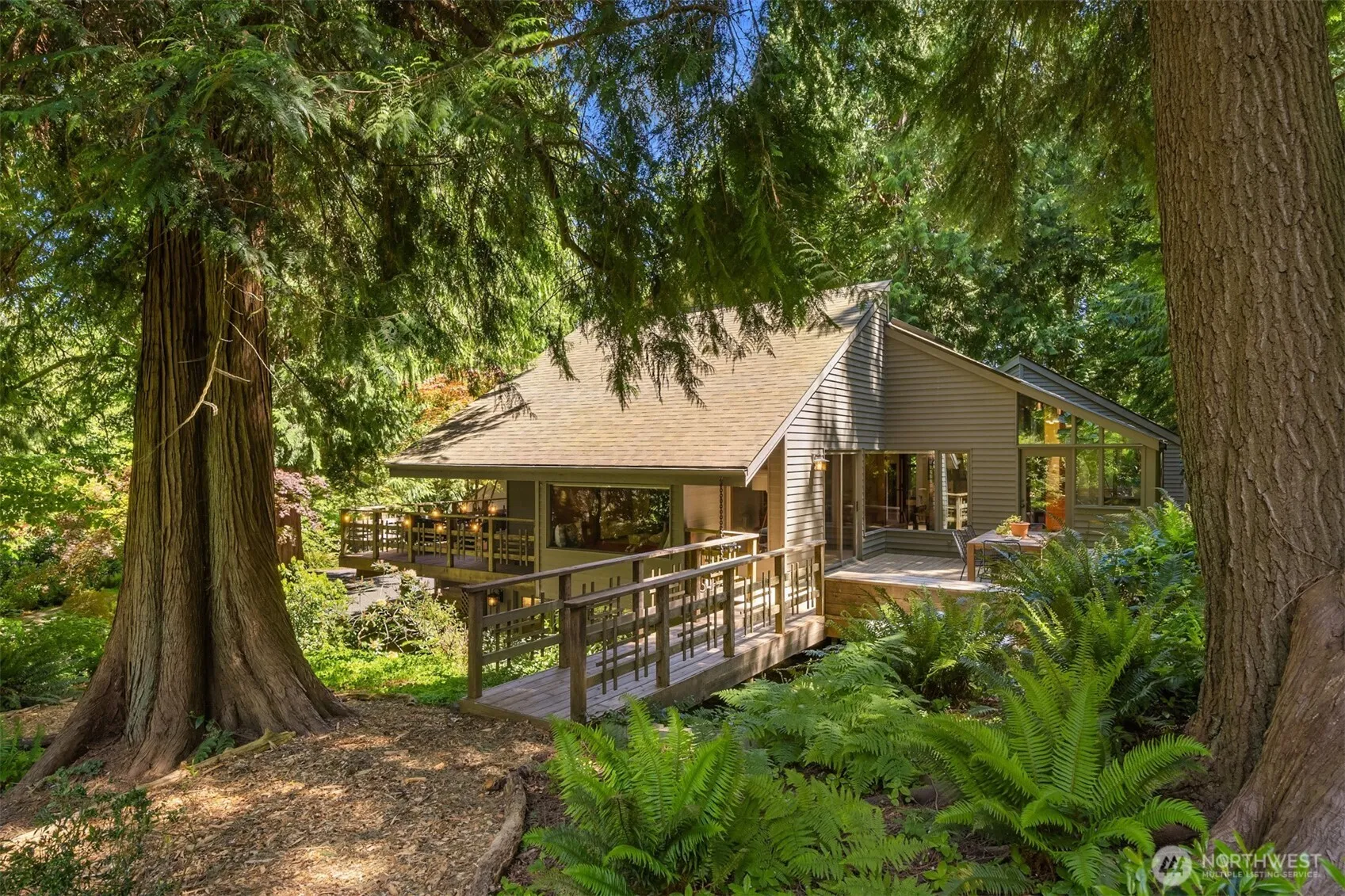 Majestic NW Contemporary perfectly situated on serene 1+ acre lot w/deeded private beach access. This 3-bedroom home features custom wood details, frameless glass corners, and a stunning fireplace that anchors the light-filled living room. Thoughtful updates throughout blend modern comfort with timeless design. Enjoy multiple living spaces, including a cozy family room, formal living, sun room and a lower-level bedroom with direct outdoor access—perfect for guests or flexible use. Four decks provide spaces to relax or entertain, magical gardens with winding trails, cedar soaking tub and sun deck offers tranquillity and a deep connection to nature. Peaceful, private, and perched on over an acre, this is Bainbridge Island living at its best.