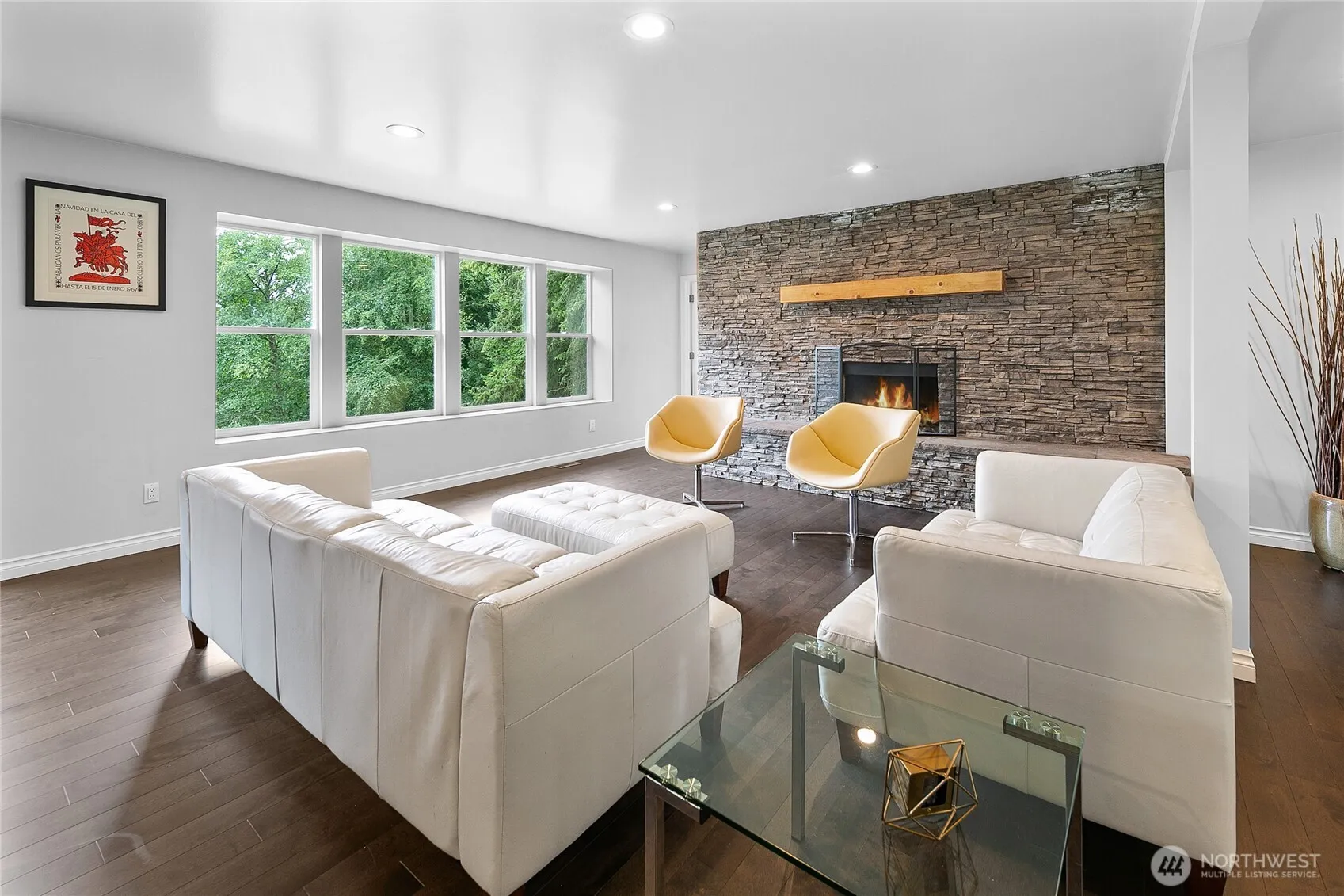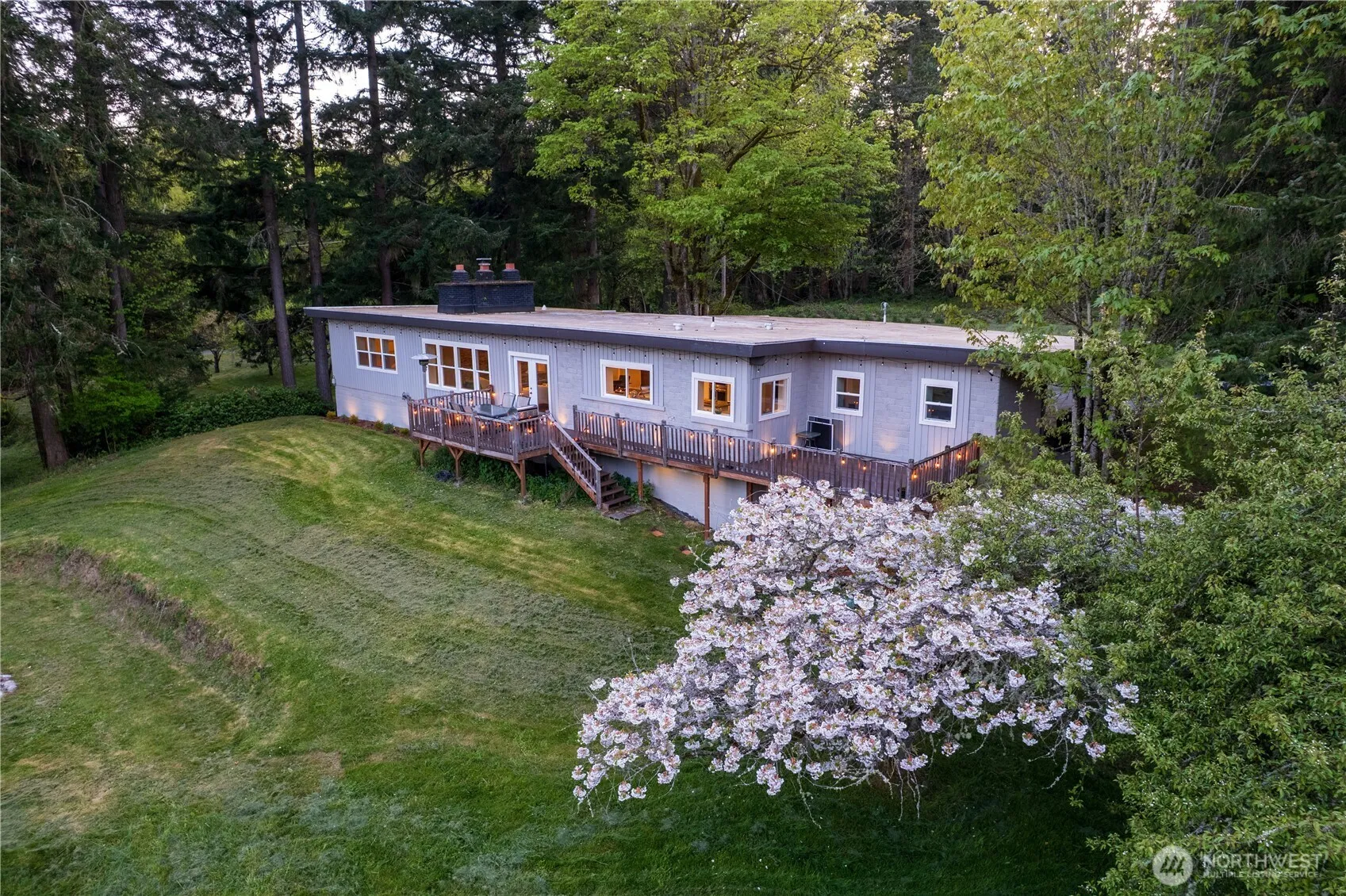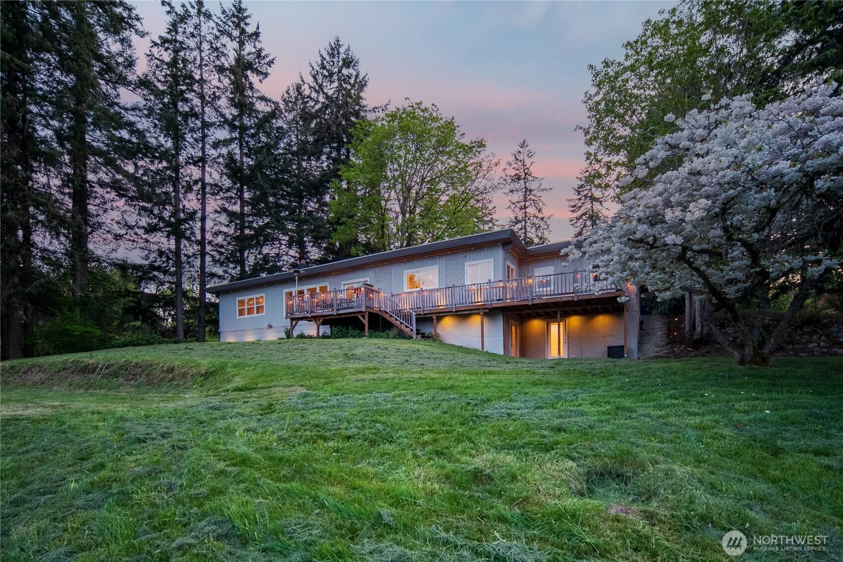 Spacious mid century home sits tucked away on over two acres of rolling pasture & mature fruit orchard. Gorgeous whole house renovation makes this home feel brand new! New hard wood floors upstairs & carpets downstairs. Newer stainless steel appliances and cook top, large open format kitchen/living room + breakfast bar, cooking island, & access to back deck for dining al fresco. Large laundry room! Primary bed features cozy fireplace w/ jetted tub and stone floor shower. Downstairs features a den/movie or game room as well as two full bedrooms or flex office space/home gym. Large cedar sauna invokes the sense of hygge through the seasons! Outdoor fire pit for bon fires + RV pad w/ full hook ups. Close to Seattle ferry, farm stands, & town!