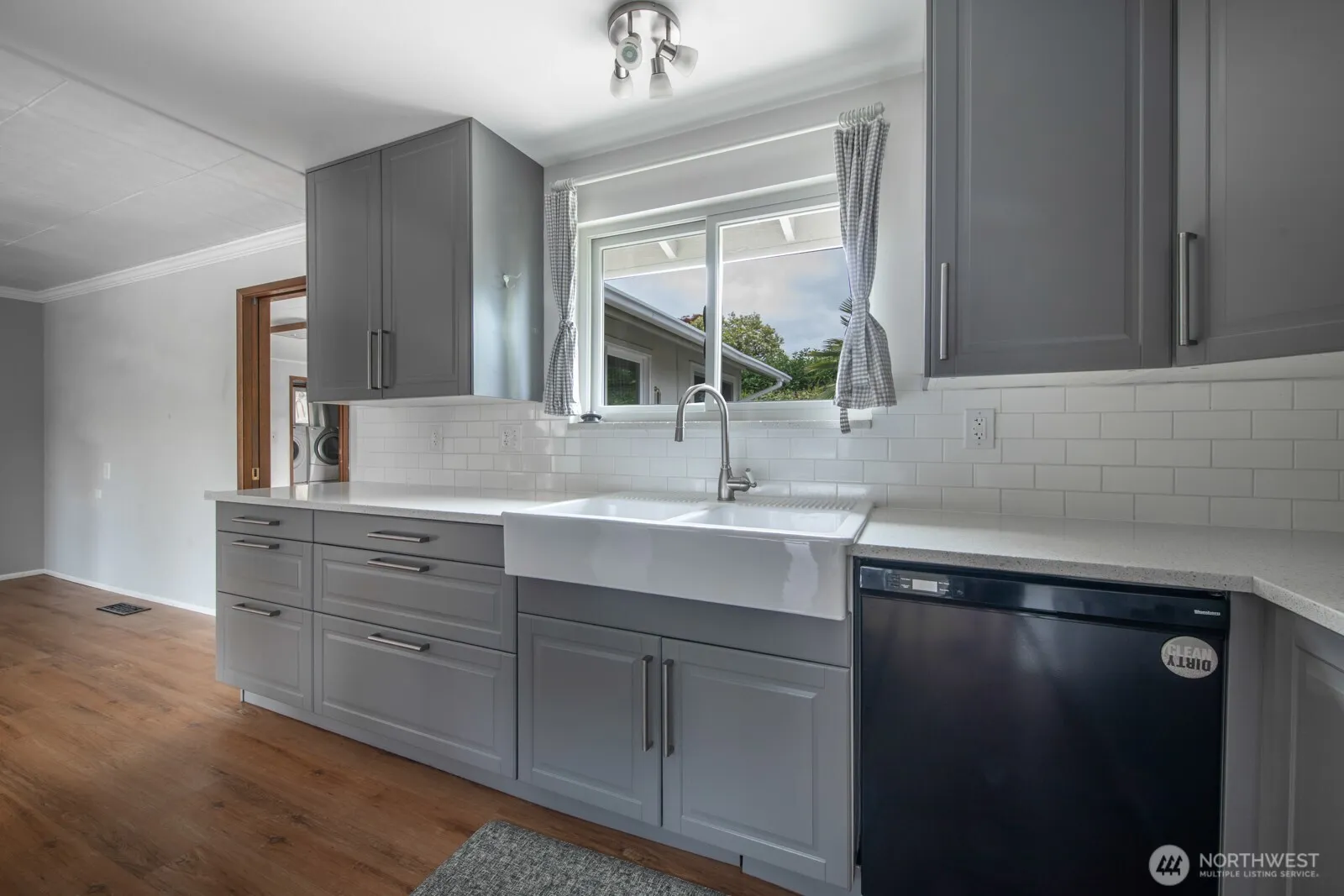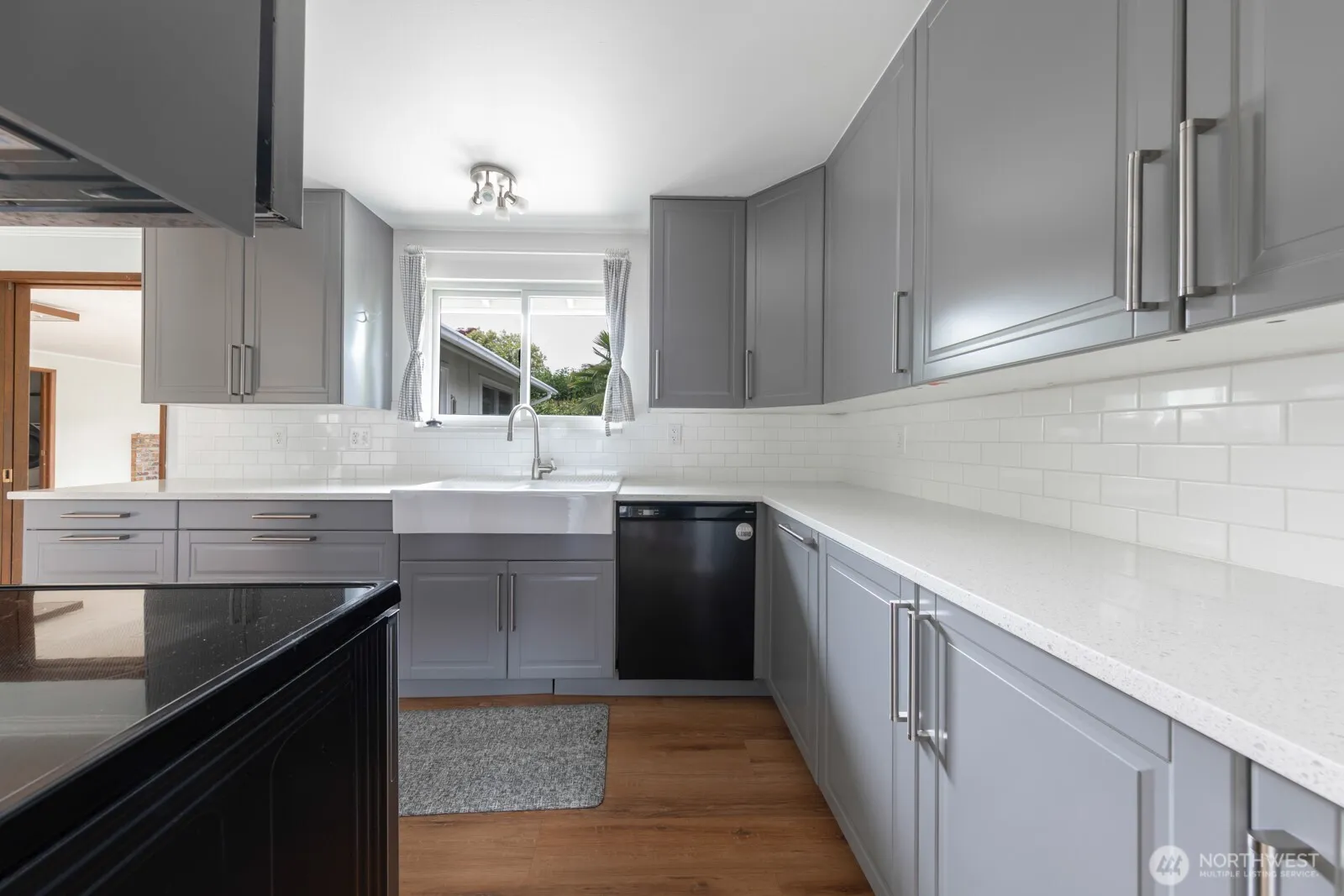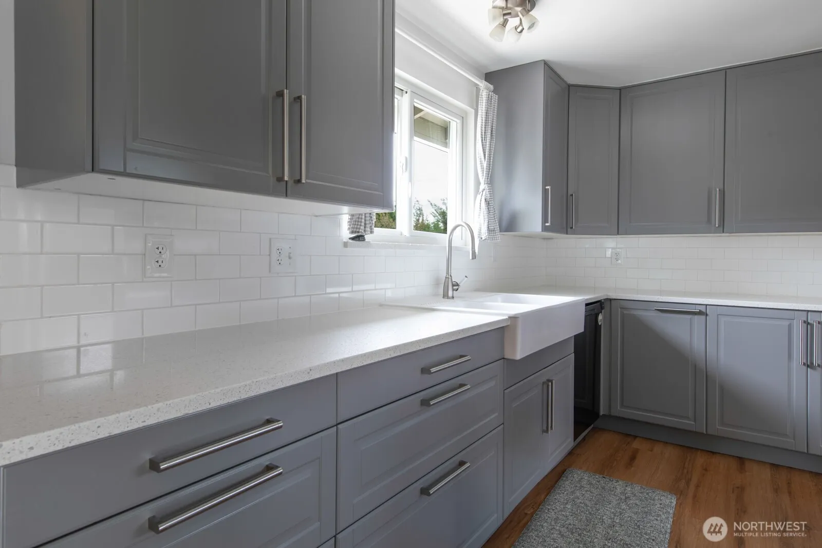 Charming & bright all one level home, sits majestically on shy 1/4 acre lot. Not on a direct flight path, so it is QUIET. Beautifully remodeled kitchen w/ quartz counter-tops, stainless appliances and laminate floors. Huge family room addition with adjoining 3/4 bath and laundry. Oak hardwoods in Living room & all 3 bedrooms. Completely remodeled main bath with soaking tub! Partially fenced, semi-private, Level back yard w/ patio off family room, perfect for backyard BBQ. Attached garage and plenty of off street parking. Updated plumbing, electrical, newer gas furnace and AC! Conveniently located to shopping, freeways, Boeing and the airport.