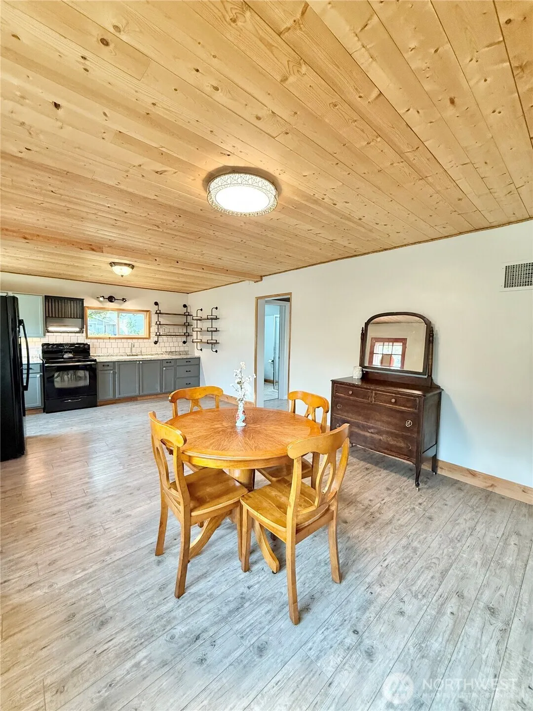 RIVERSIDE – Oversized corner lot w/diligently kept front & back yard! 920sqft 2 bedroom/1 bath house with attached 400sqft oversized one car garage w/ample storage space. Home features open living room, updated kitchen to include shelving, cupboards, countertops, with custom large sink and subway tiled backsplash – all appliances stay, knotty pine ceilings, two bedrooms, and three-quarter tiled bathroom. Brand new flooring. Utility room with washer/dryer. Fully fenced yard with a back deck. Storage shed. Irrigation. Septic. City of Riverside domestic water. Close proximity to Omak – less than 5 minutes – includes grocery stores, retail stores, gas stations, hardware suppliers, restaurants, and so much more. $224,900 MLS-2432620/H-3714