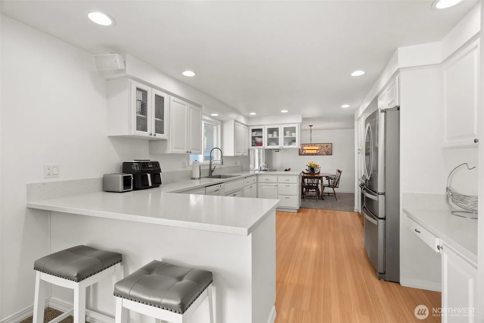 Incredible opportunity to own a gorgeous remodeled rambler on a double lot only 5 mins to West Oly. A giant and stunning Sequoia tree greets you as you approach this meticulously maintained inside & out home! Gated & paved road leads to huge heated shop w/ parking for 4 cars! Oversized primary bed w/ spacious luxury 5 piece en-suite featuring quartz counters, a beautiful soaking tub, shower w/ frameless glass & large walk-in closet. Enjoy the coffee/wet bar in the family room featuring built-in shelves. Newer windows, roof + gutters! Lawn is like a putting green w/ curbs + a 10 zone irrigation system. Sun drenched patio for all your outdoor entertaining, + jacuzzi for relaxing in the fully fenced & private backyard.