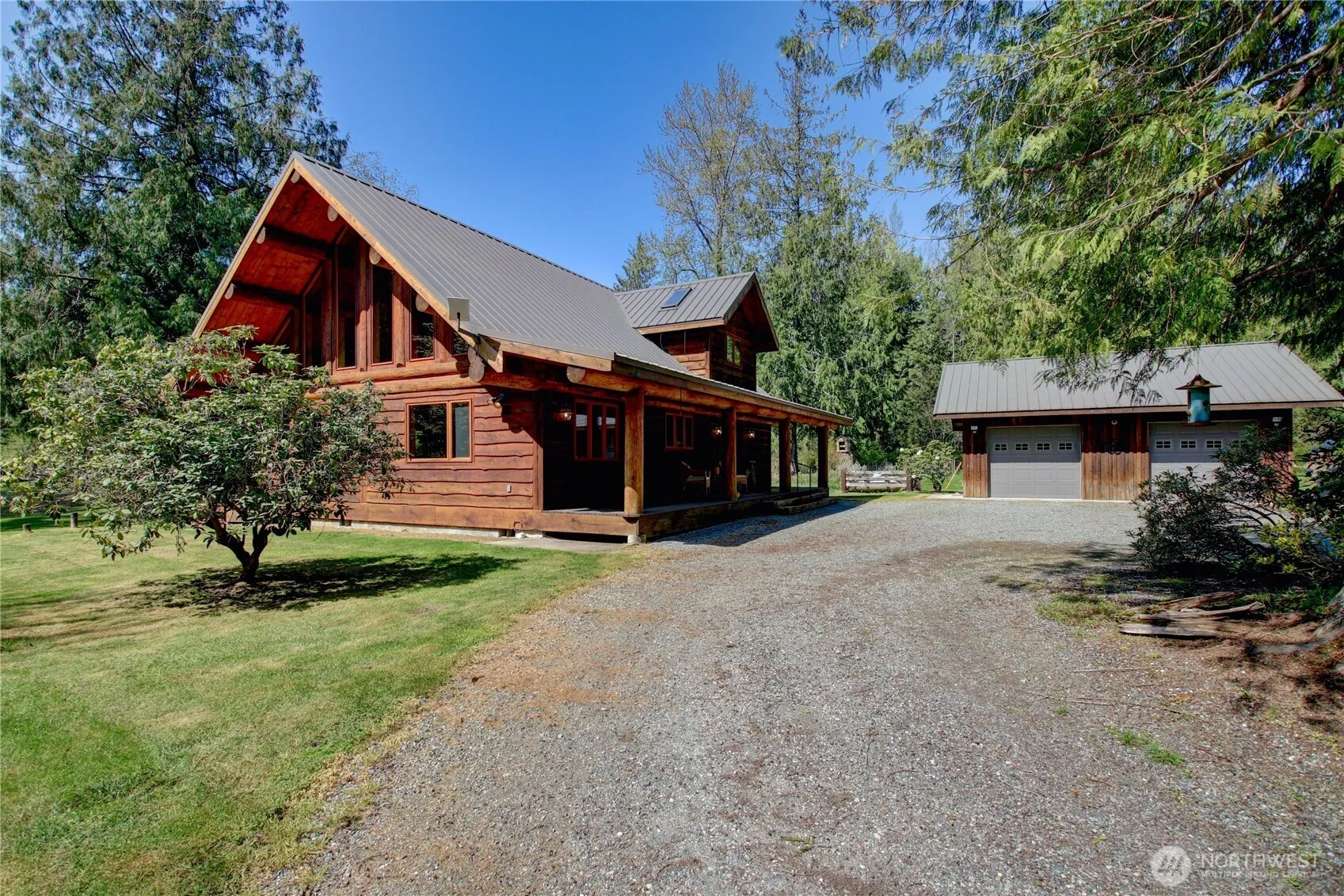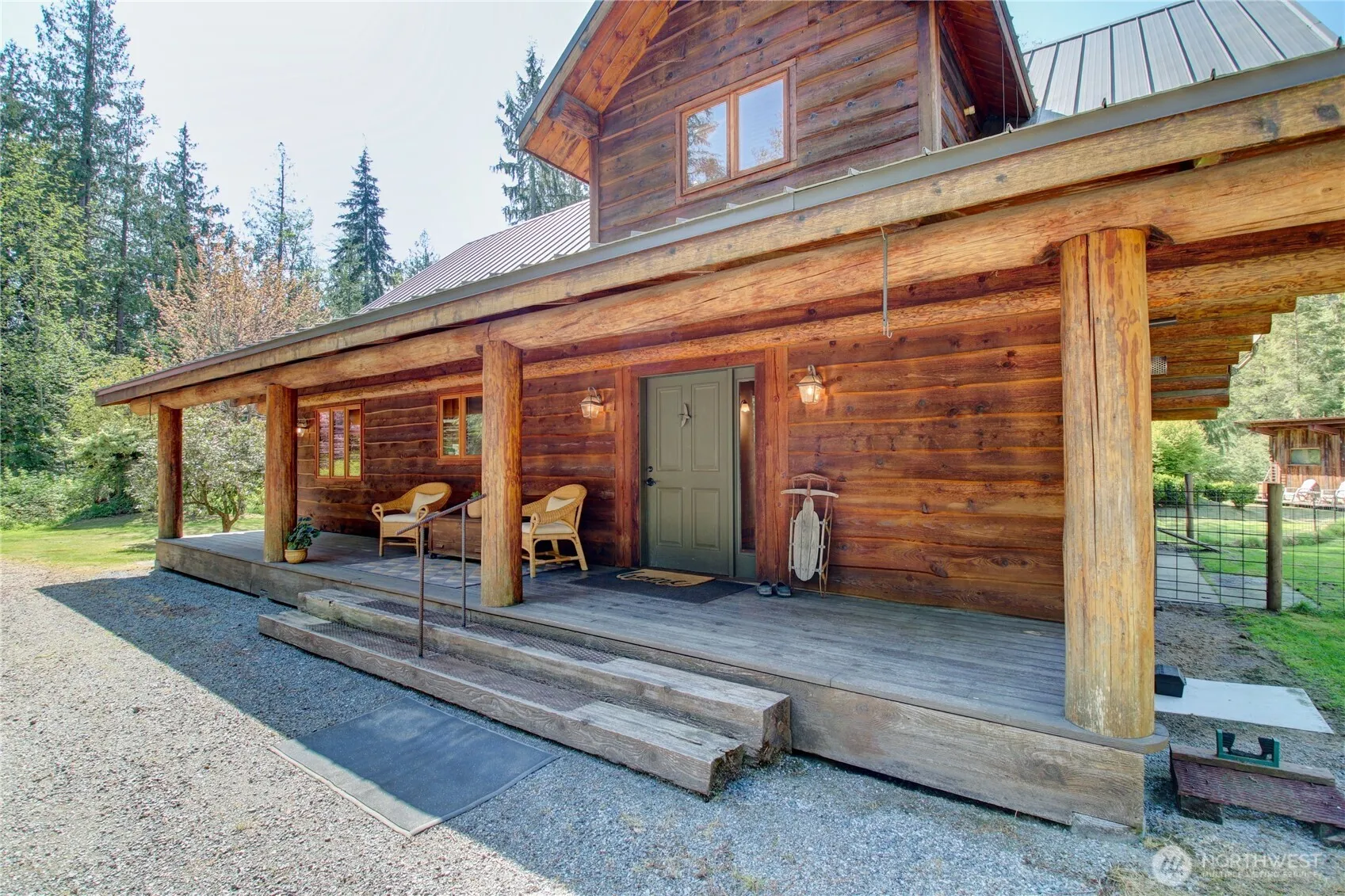 Escape to a stunning 9+ acre paradise with this custom-built log home! Revel in spacious open-concept living, featuring a cozy wood stove, expansive kitchen, and soaring loft. The upper primary suite offers a private balcony, full bathroom, and generous walk-in closet. Downstairs, discover a well-sized bedroom, additional bath, and convenient laundry/utility room. The property shines with a 24×28 garage, charming greenhouse, unique 3-hole golf course, two ponds (one stocked with fish) and a tranquil gazebo. A gated driveway and generator system ensure peace of mind. Perfectly situated between Bellingham, Seattle, Mount Baker, Anacortes, La Conner, the San Juan Islands and abundant parks. This retreat blends rustic charm with modern comfort!