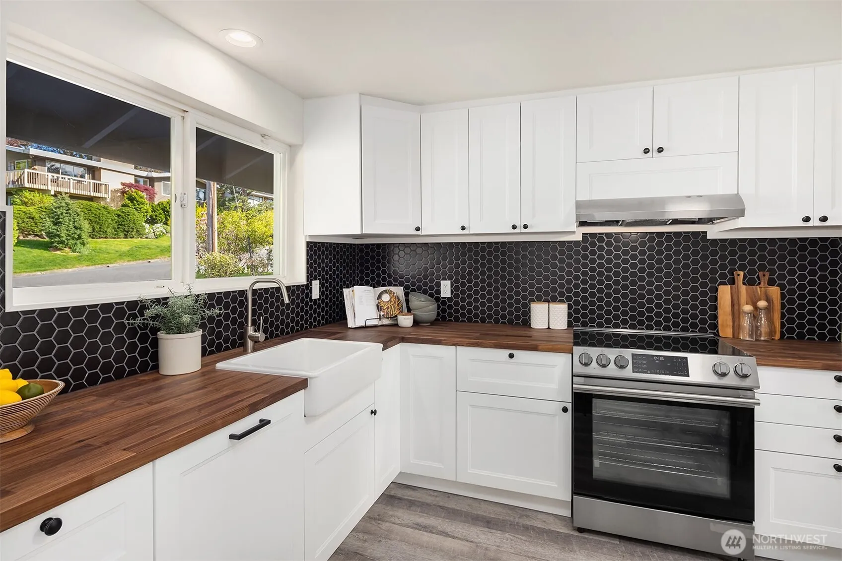 Move right in! This classic mid-century daylight rambler has been beautifully updated for modern living. Gather in its bright, open living and dining areas that flow out to a sunny deck with peek-a-boo lake views. Cooks will love the remodeled kitchen with butcher block countertops, honeycomb tile & stainless appliances. The ideal layout allows for 1-level living with your primary suite & two additional bedrooms together on the main, while a fully finished daylight basement with huge 4th bedroom + rec room provides bonus flex-space downstairs. Extras include a newly paved driveway, fresh paint, newer carpets, updated baths, & new hot water heater. Spacious, fenced yard, too! Stroll to schools, parks & downtown MI from this ideal locale.