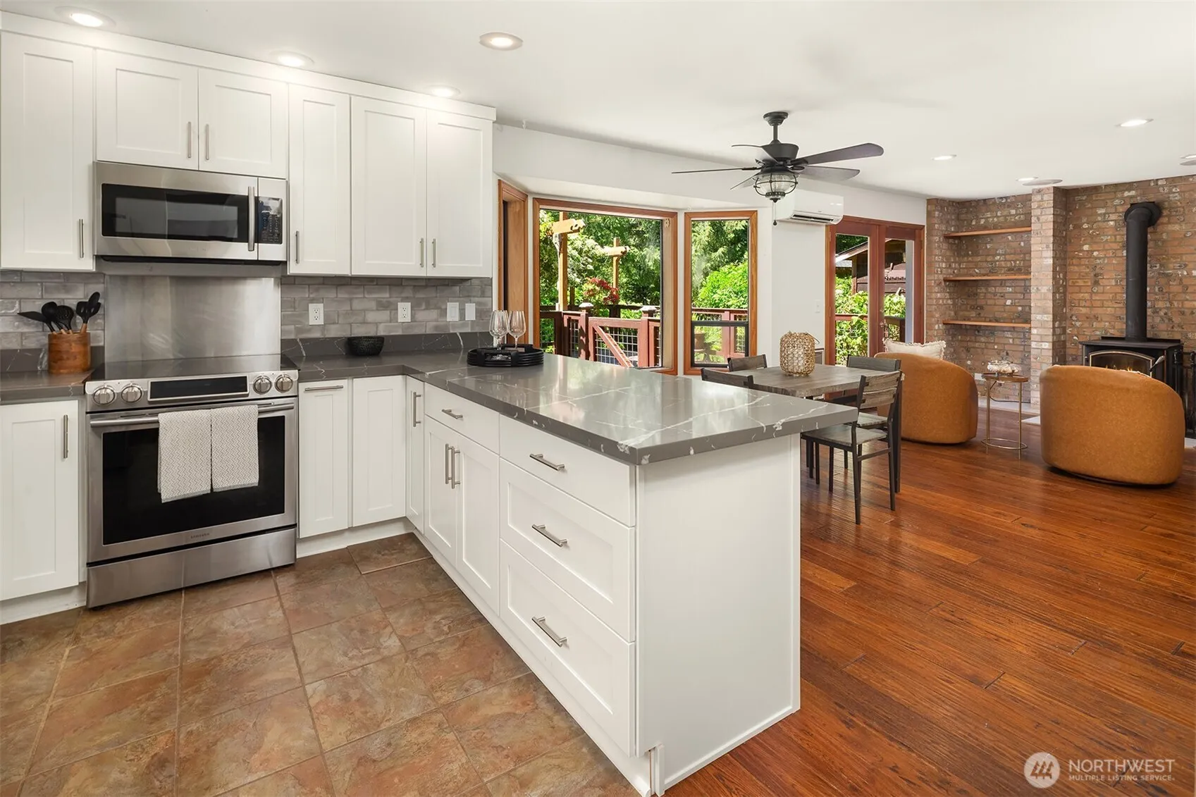 Nestled on 5 acres, this private Arlington retreat is enveloped by towering native trees offering a serene escape. Circular driveway provides ample parking, while sprawling lawns, fruit trees, raised beds, oversized deck, invisible fence, potting & garden sheds, and a trail down to your creek create a peaceful setting. Store your toys or hobby cars in the shop. Inside, a vaulted entry leads to a sunken living room. French doors open to a family room with new electric FP. All NEW never-used kitchen with pantry overlooks the great room with a wood stove. Upstairs you’ll find two guest rooms, a den, and a guest bath. Generous primary suite features a walk-in closet and stunning all NEW ensuite with walk-in shower. Quick access to I5 and HWY 9.