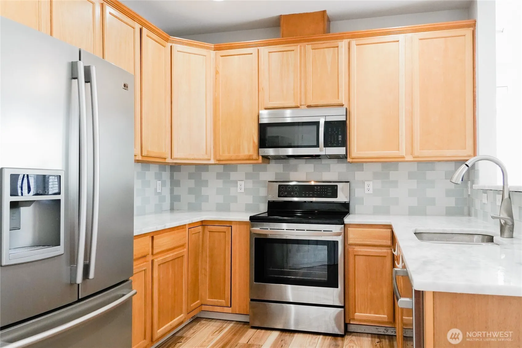 This bright and spacious 2-bed, 2-bath townhouse (1,140 sq ft) features an open floor plan with laminate wood-style flooring throughout. Relax in the cozy living area with a fireplace or step out onto the balcony. The primary suite offers a walk-in closet, a linen closet, and a private bath, while the 2nd bedroom is near the 2nd full bathroom. A dual-purpose laundry room doubles as a pantry. Parking includes 1 car garage plus space for 2 more vehicles (driveway/street). Recent updates include a new roof, the home has high ceilings with no carpet for easy maintenance. Enjoy a prime location near the Interurban Trail, I-5, Sounder Train stations, hospitals and community amenities—just a mile from Fife Elementary, Middle & High Schools.
