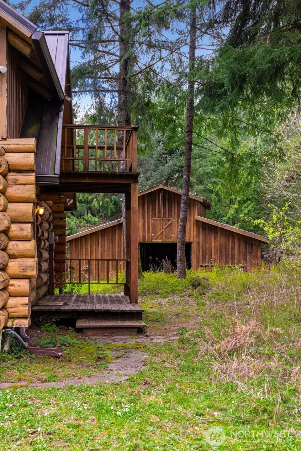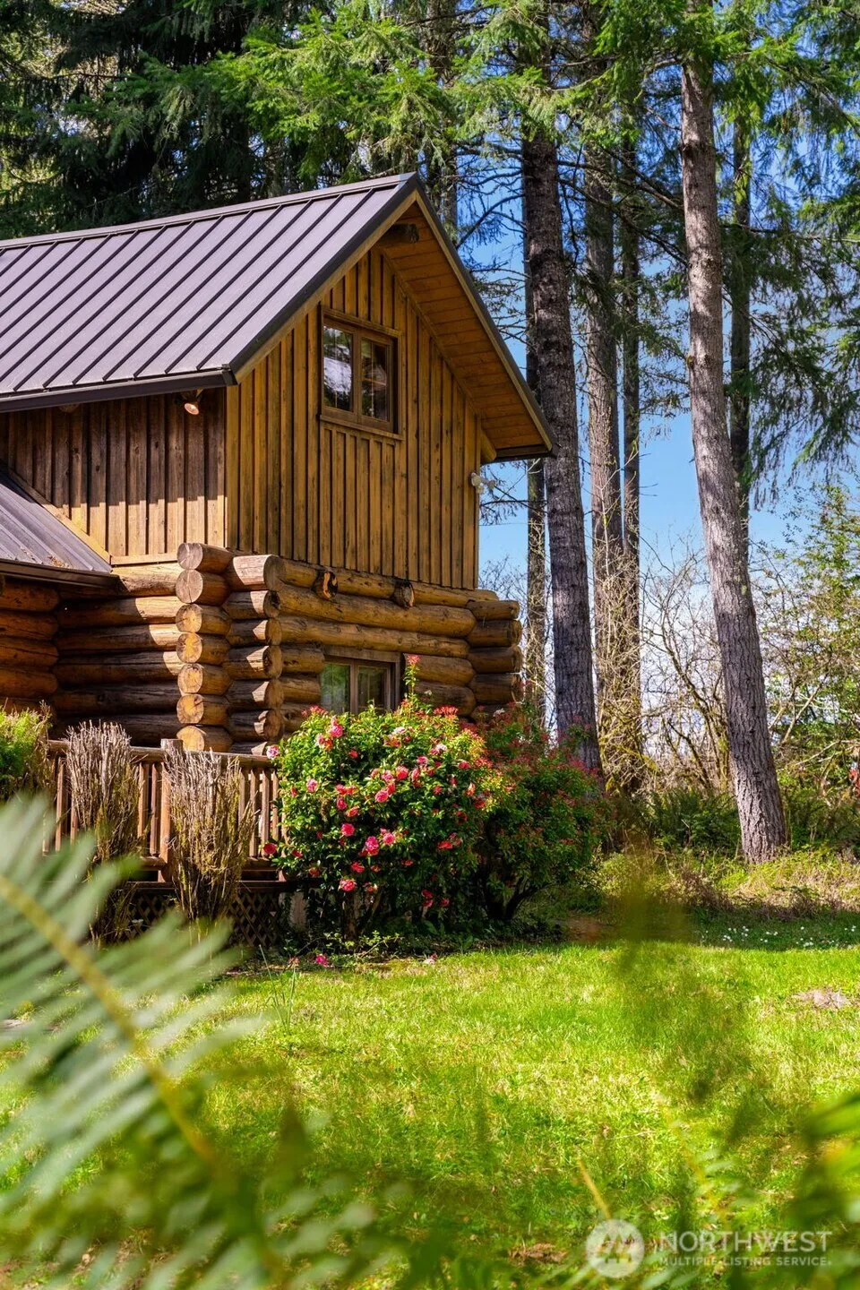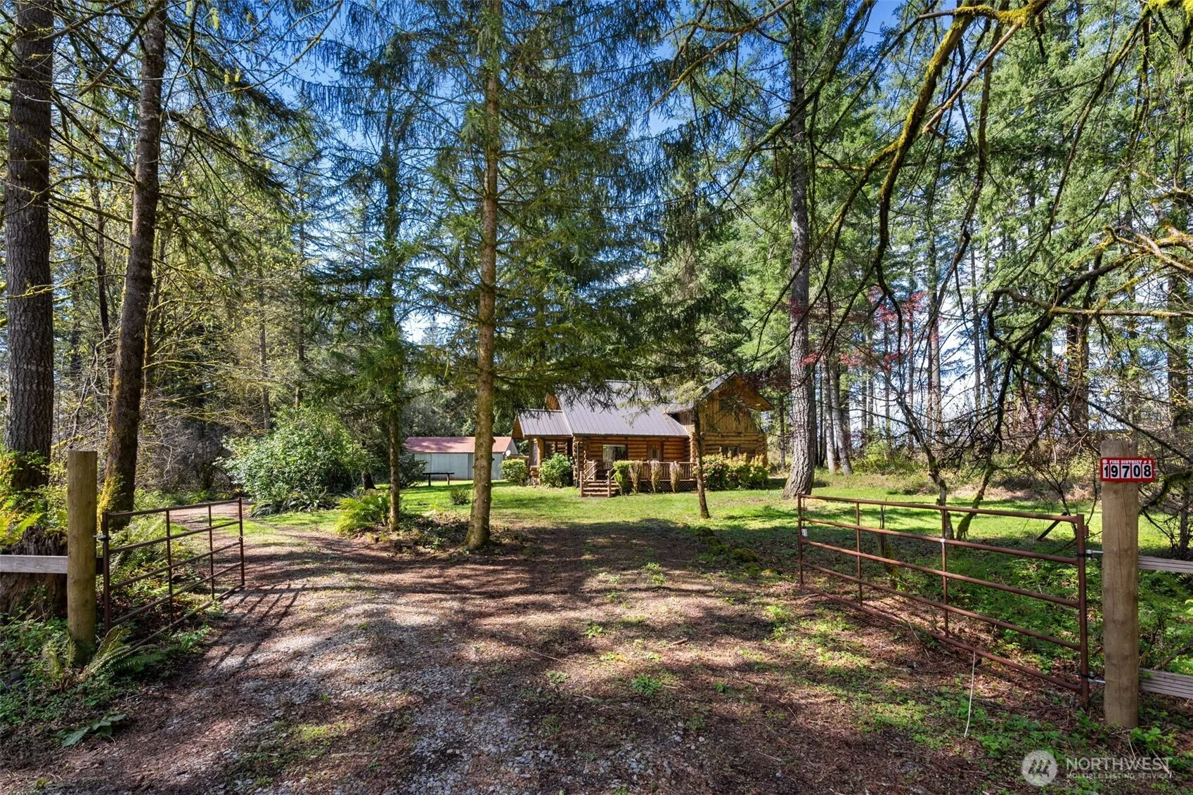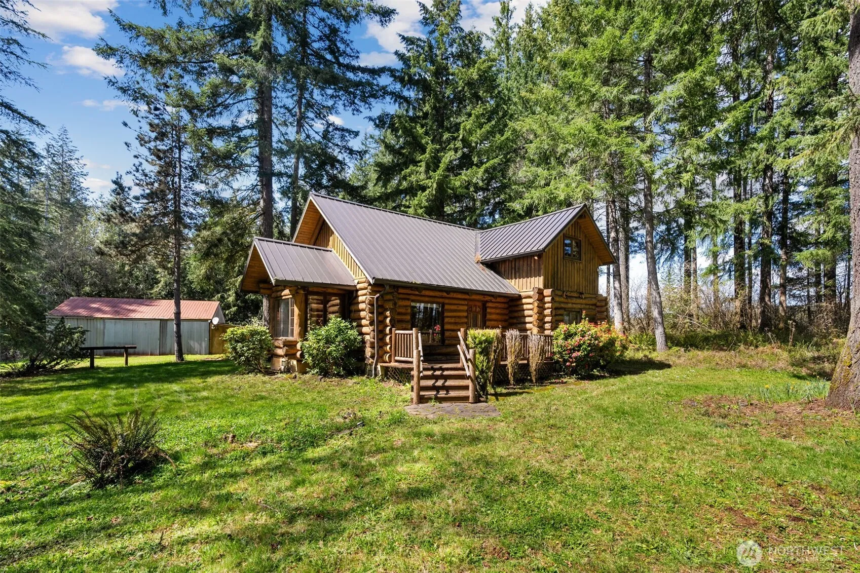 A log home straight from a fairytale, set on 2.5 acres of flat, usable land. This 1,340 sq. ft. home features 3 bedrooms, 2 bathrooms, vaulted ceilings, and a dramatic floor-to-ceiling stone fireplace. Large windows throughout offer a peaceful connection to the outdoors. The property includes a 1,152 sq. ft. detached shop, a solid 4-stall horse barn, gated entry, and a durable metal roof. The vaulted primary suite opens to a private deck. Ready for updates and sweat equity, this is a rare opportunity to create your vision in a truly special setting—just five minutes from Hantwick Trailhead and Battle Ground Lake.