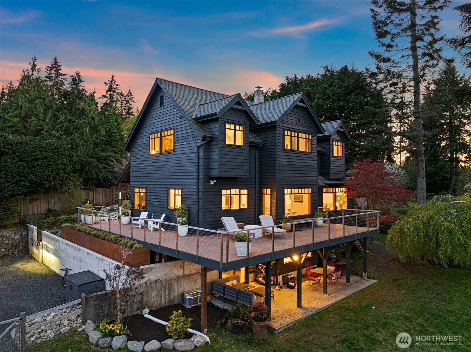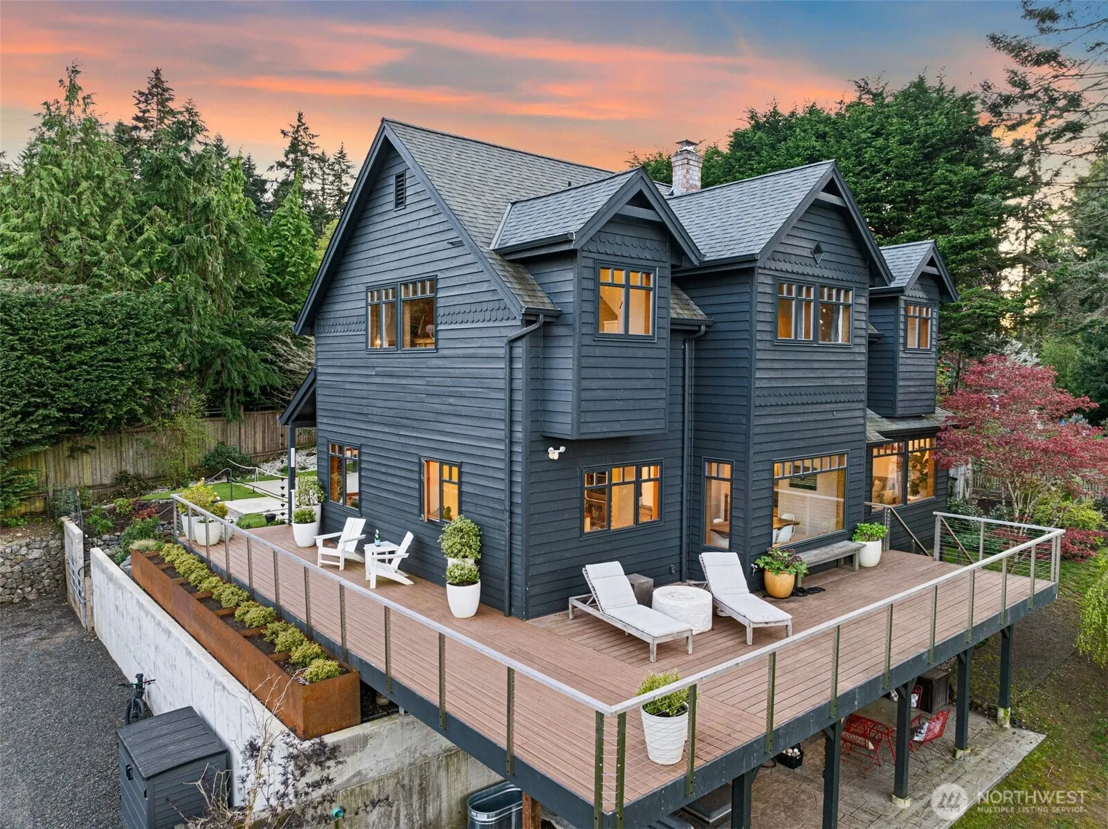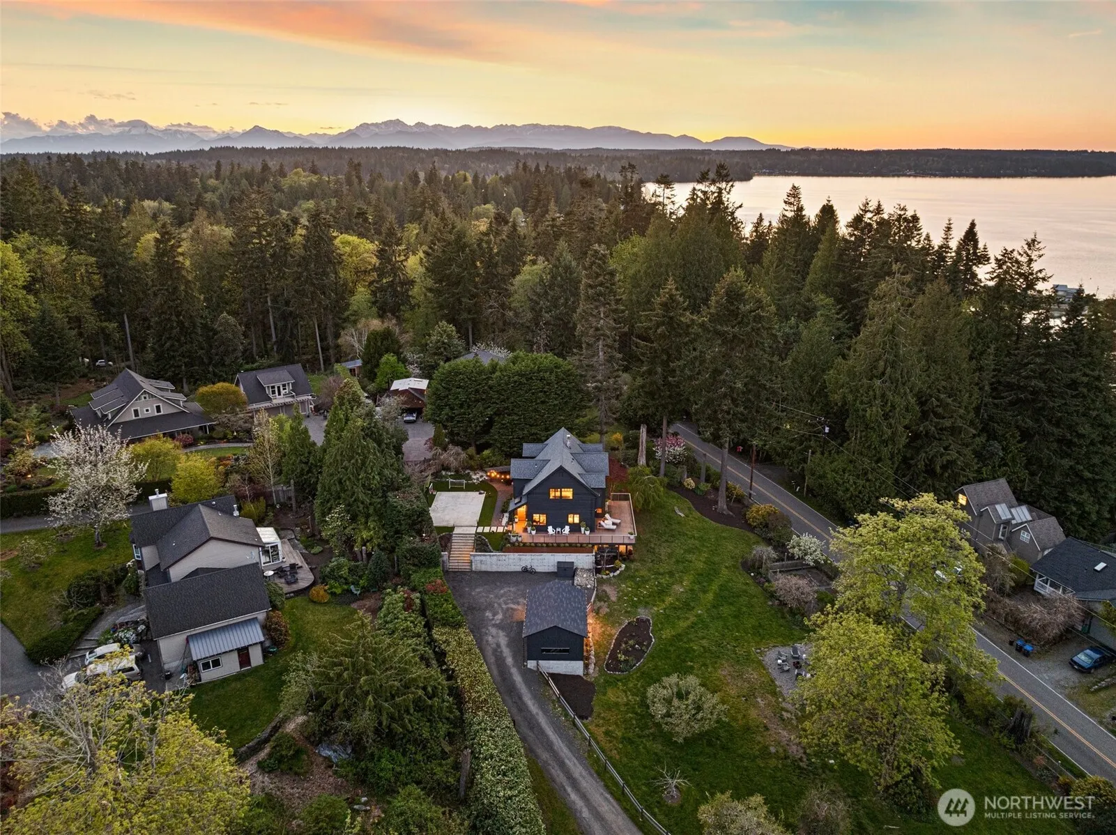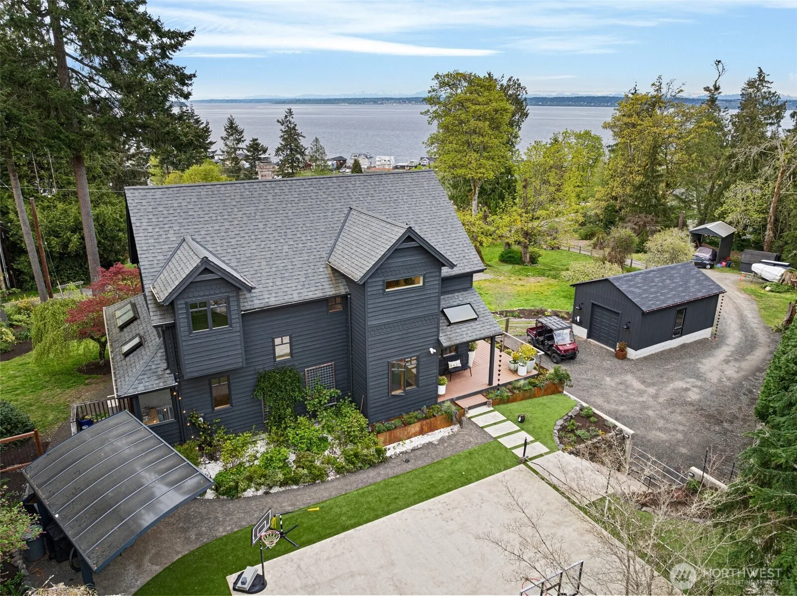 Entertain in style w/ panoramic views of the Sound & Cascade Mountains. Perfect for gatherings, the backyard oasis is expertly transformed featuring an expansive 1+ acre lot, large wrap-around deck, sports court, lush turf, fenced garden w/ raised beds, fruit trees, firepit & ample yard space. Inside the chef’s kitchen awaits w/ a breakfast nook, double oven, large island, abundant storage & beverage fridge. Large windows flood the home w/ natural light, showcasing stunning views from nearly every room. Spacious primary suite w/ stunning vistas, walk-in shower & dual vanities. Flexible bonus rooms offer options. New single-car garage is plumbed, offering versatility-studio, office, potential future ADU. Short stroll to Fay Bainbridge.