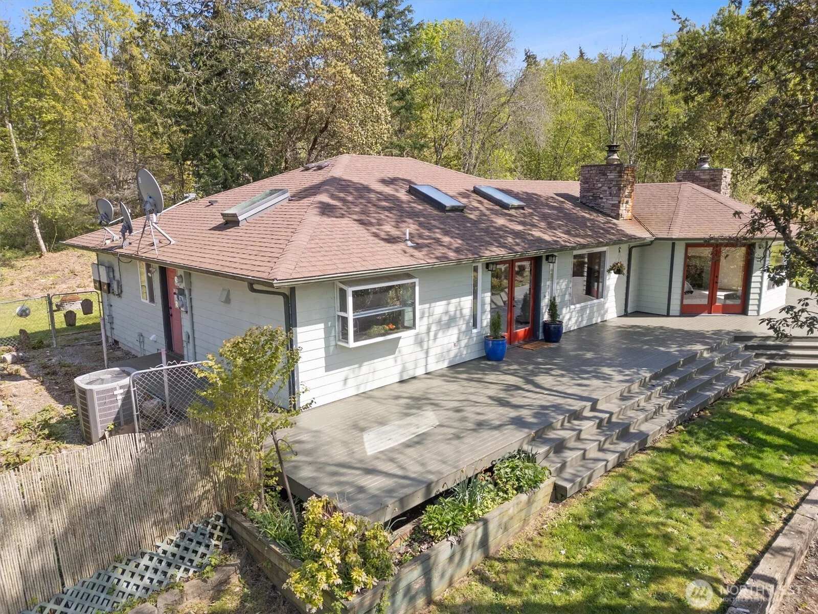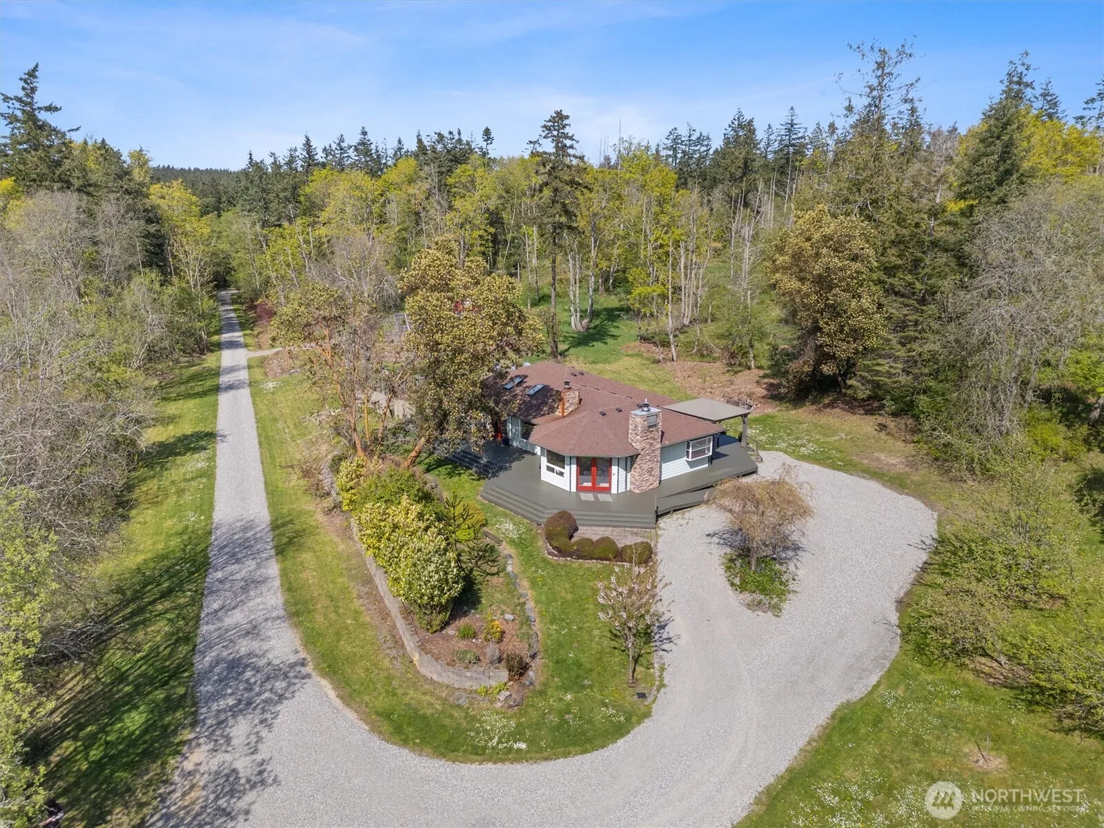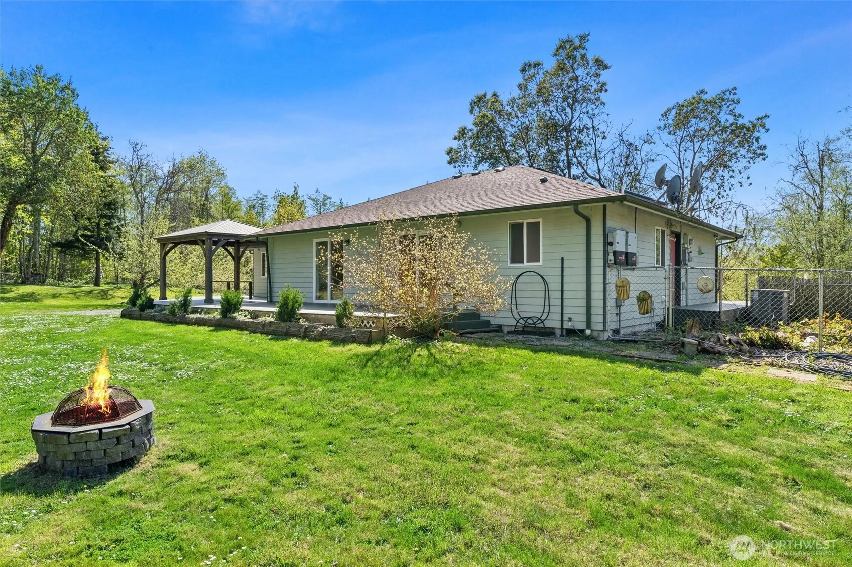 Rambler on 5+ private acres—perfect for your gardening or hobby farm dreams w/potential to add ADU! Enjoy a wrap-around deck with gazebo, large gardens, fenced pasture w/sheds for animals, fruit trees, and peaceful water feature & fire pit. Inside, the spacious kitchen and open great room with fireplace provides the ideal spot for entertaining. Unwind in the primary suite with its own fireplace, walk-in closet, 5-pc bath, and doors leading to the deck. Expansive windows and skylights provide abundant natural light and peaceful views of nature. New paint and carpet inside, large solar panel system, heat pump, and a detached 2-car garage complete this idyllic Camano Island retreat! Perfect location near the State Park for beaches and trails.