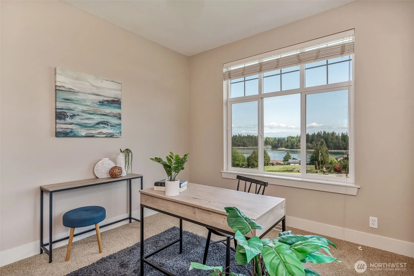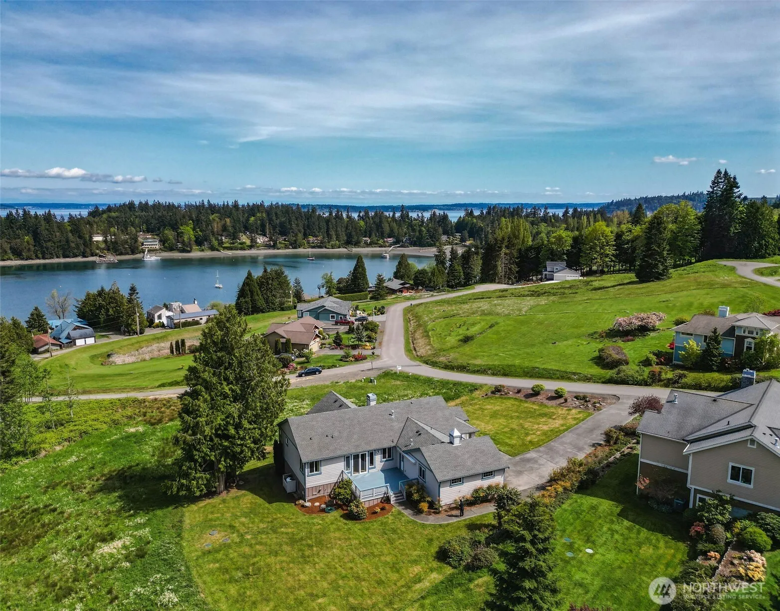 A little bit of paradise! This single level Craftsman home has expansive views of Mats Mats Bay, a shy acre, and is move in ready! A gorgeous home that has been well maintained and is view protected, it boasts vaulted ceilings and wood floors. The kitchen has quality cabinets and granite countertops, high end appliances and ample storage; a great room to dining area and living room. Beautiful built-ins surrounding the double-sided fireplace shared by the living room and dining room. The primary ensuite bedroom is spacious with walk in closet and water views. Additional bedroom, bath, office and laundry room. Two decks to enjoy great outdoor enjoyment; watch boats, wildlife. Photo #40 shows building envelope on adjacent parcel.