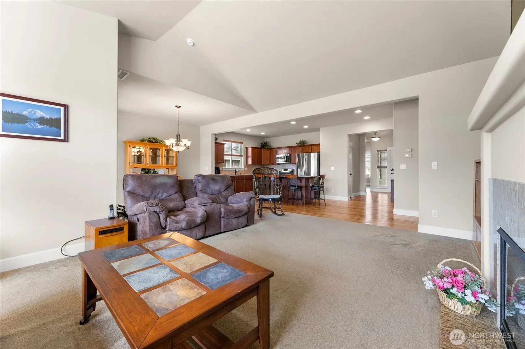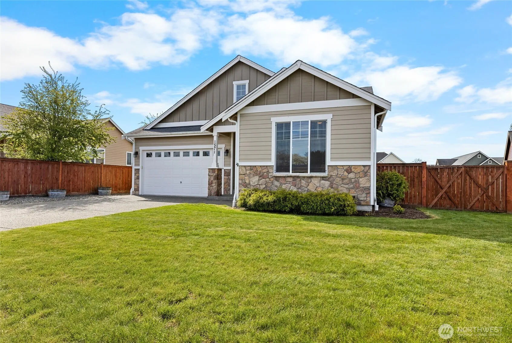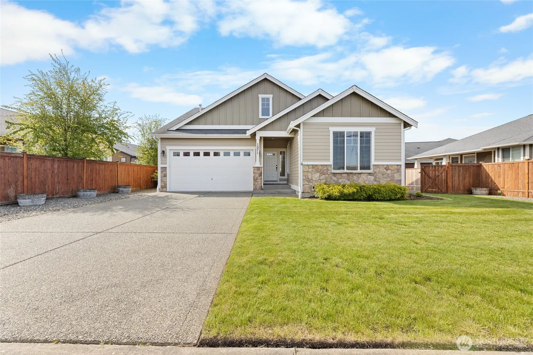 Enjoy stunning Mt. Rainier views from this meticulously cared for, open concept rambler. Designed to impress w/vaulted ceilings, high-end hardwood floors, white millwork, recessed lighting & an abundance of natural light. The exceptional layout features a gas fireplace & a spacious dining area that flows seamlessly to the expansive covered patio. The kitchen boasts rich cabinetry, slab granite counters, a large island w/eating space, extensive tile backsplash & sleek SS appliances. The luxurious 5pc primary ensuite includes a soaking tub, double sinks & a walk-in closet. The fully fenced backyard offers a double gate & raised garden beds. All tucked away just off Main Street in a quiet community of just 13 homes. Washer & dryer included.