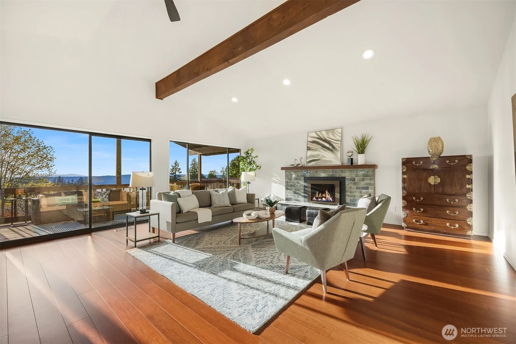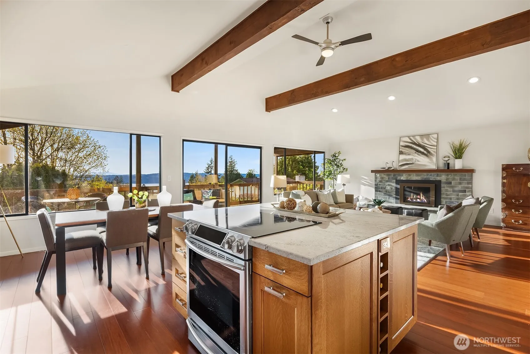 Soak in the essence of the PNW in this meticulously maintained & thoughtfully updated home ft. exquisite views of the Puget Sound, Whidbey Island & Olympic Mountains. Luxury touches & upgrades made throughout- incl. completely remodeled bathrooms w/ custom tilework & heated floor, new laundry rm in 2022. Remodeled chef’s kitchen & open-concept layout ideal for entertaining. Bamboo and premium engineered hardwood floors, Italian tiled fireplace, new HVAC/heat pump, and so much more! Located at the end of a quiet cul-de-sac, this South-facing home with Westward views offers fantastic natural light during the day & unforgettable sunsets at night. Expansive covered deck & patio perfect for indoor/outdoor living & entertaining all year-round!