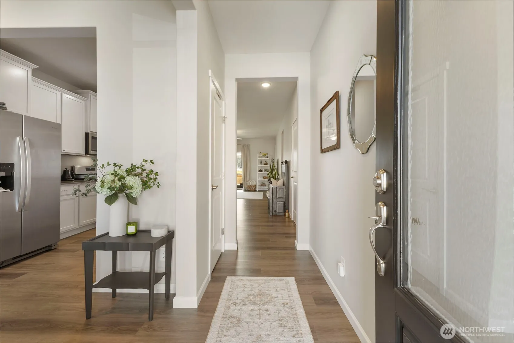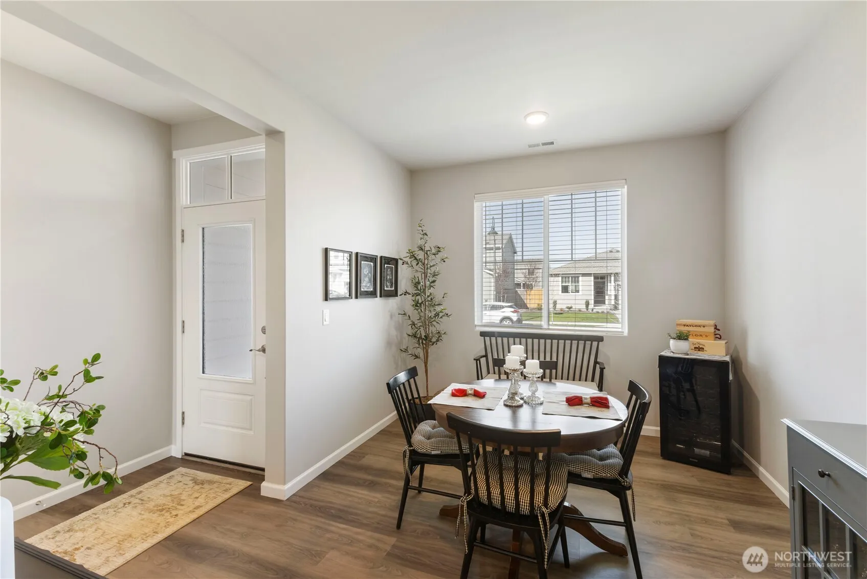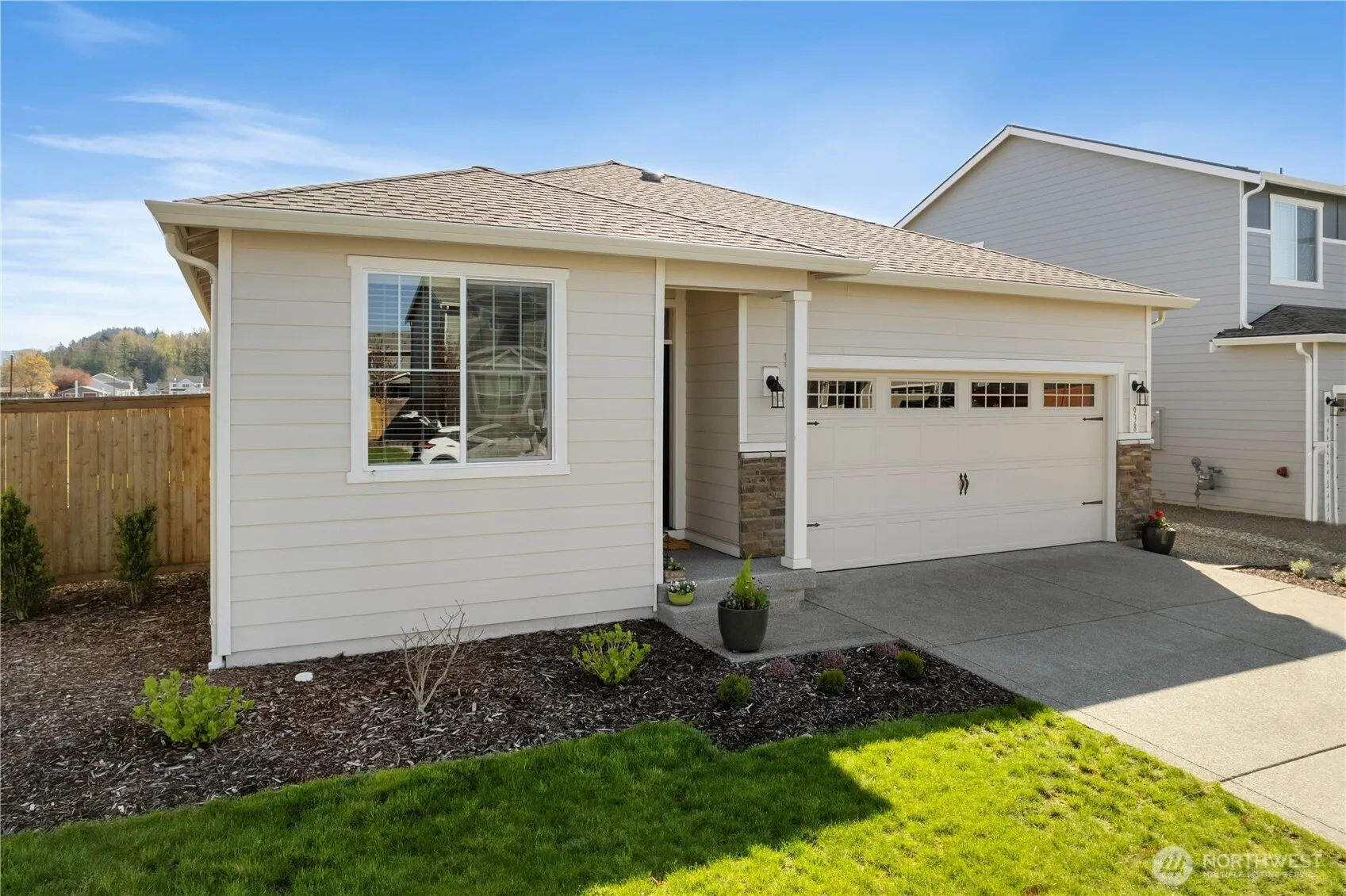 Low Maintenance living in this CLEAN, open & spacious RAMBLER! Like-new single-story home includes a private dining room in addition to a spacious kitchen & sprawling great room. The modern kitchen is equipped with stainless steel appliances including a gas range-oven! Thru-out the home, you’ll find polished quartz countertops, modern white cabinetry 9′ ceilings & stunning vinyl plank flooring. The luxurious primary suite includes a large tiled bathroom with soaking tub & separate shower, plus walk-in closet. Two additional bedrooms & a second full bathroom offer additional living space in this well-designed rambler. Efficient Heat Pump provides Air Conditioning! Tidy lot with Double fenced back yard (bioswale provides backyard buffer).
