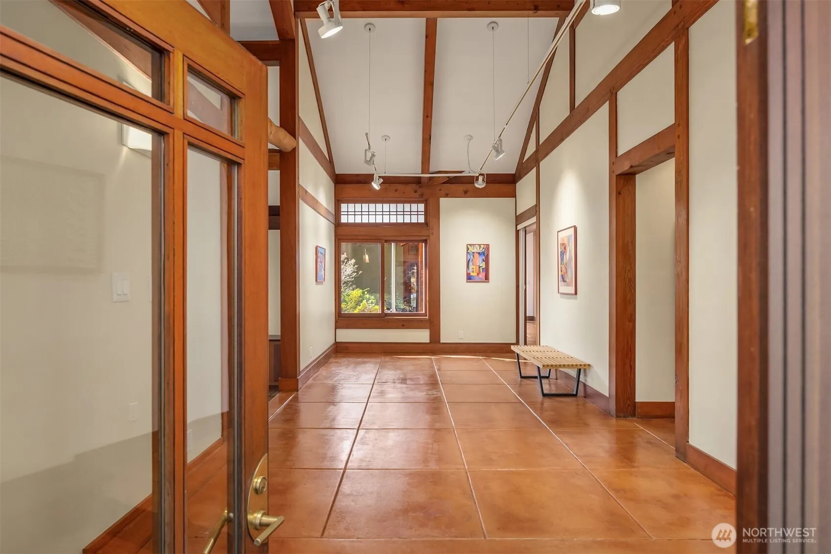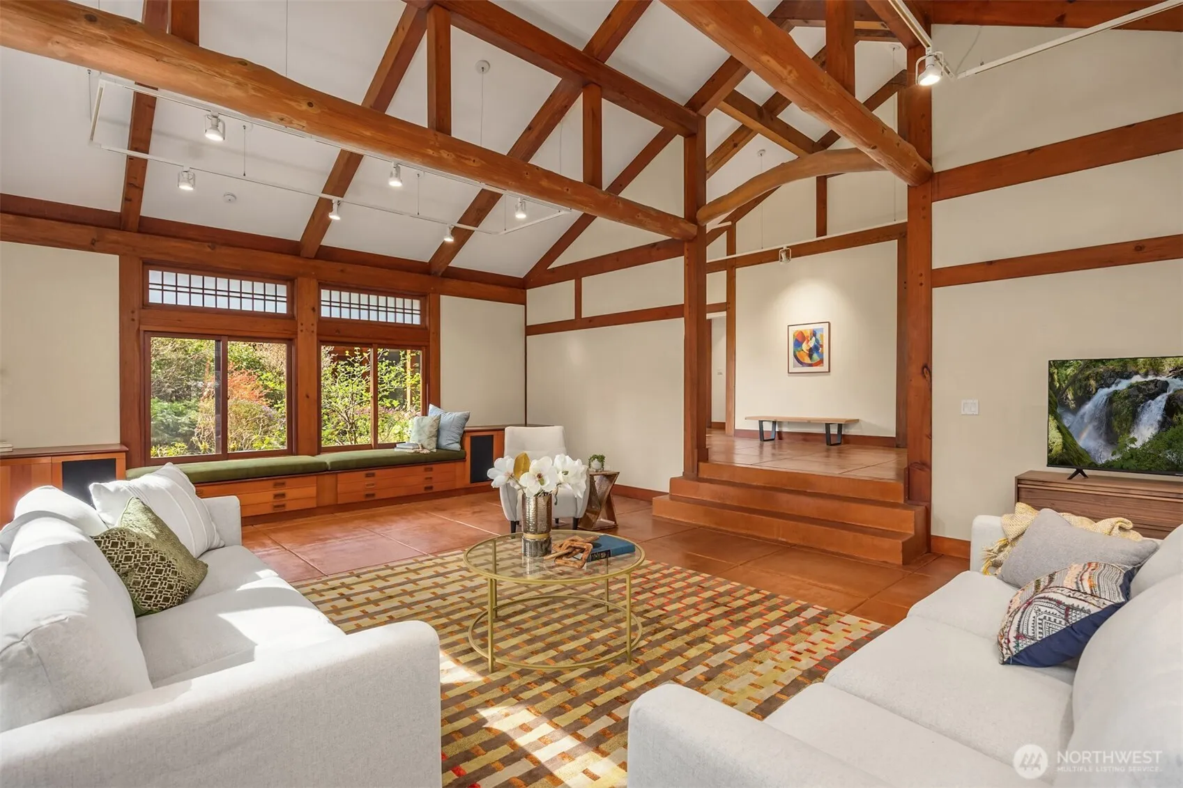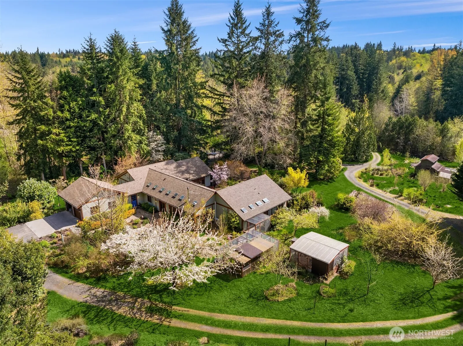 Enjoy quintessential island living in this architecturally distinctive timber frame home, perfectly sited on 8.55 sun-drenched pastoral acres. Designed around a serene central courtyard, the 3BR, 2.5BA single-level residence offers a harmonious blend of home & nature. Dramatic exposed timber framing, soaring vaulted ceilings, & striking madrona beams create a warm, rustic elegance. Large windows & thoughtful design invite nature in, while the open floor plan fosters effortless living & entertaining. Outside, you’ll find thriving gardens with evergreens, Japanese maples, perennials, & fruit trees. With ample space for growing vegetables, raising livestock, or simply enjoying the peaceful sounds of nature, this property is a zen sanctuary.