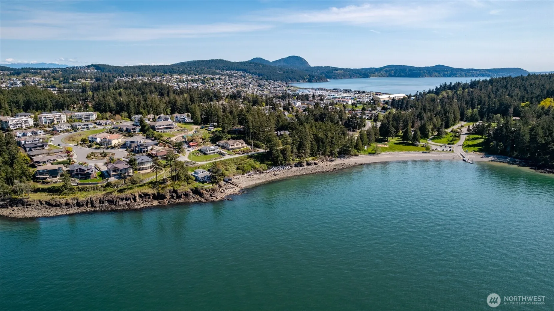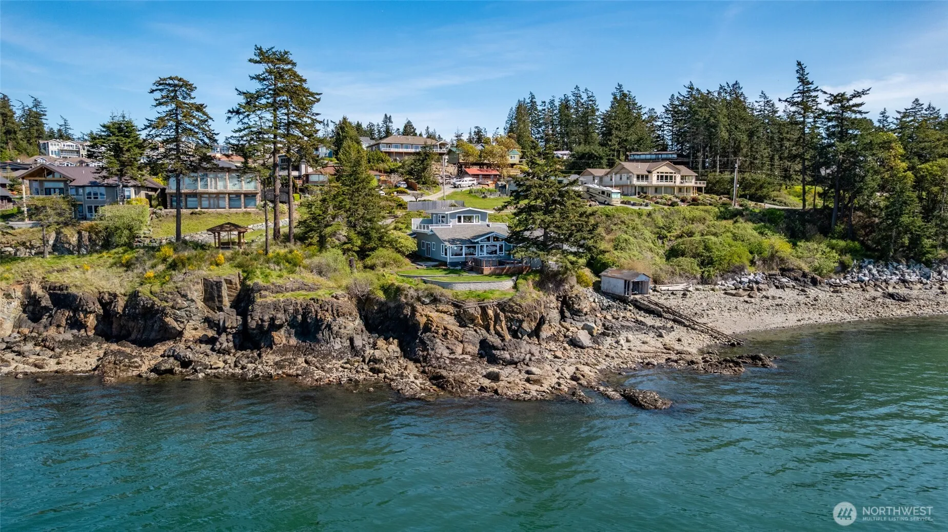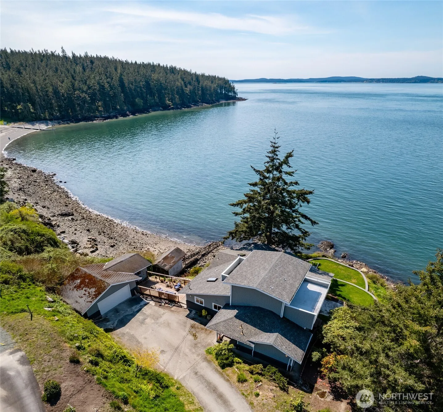 Magnificent waterfront home in one-of-a kind location. This tastefully updated home sits on a rock promentory on the far west side of the island. A beautiful public beach on one side and a buffer on the other, provide this home with highly desirable privacy. Water views from almost every location in the home. Terraced yard and large deck with hot tub provide ample opportunities for outdoor enjoyment and entertaining. Master suite options of main level or upper level with view decks. 3 bedrooms with private baths. Nicely updated kitchen with views from every window. Office/bonus room space and view family room off of the kitchen. Garage with shop/studio space. Property includes tidelands. Sit back and enjoy the view and glorious sunsets!