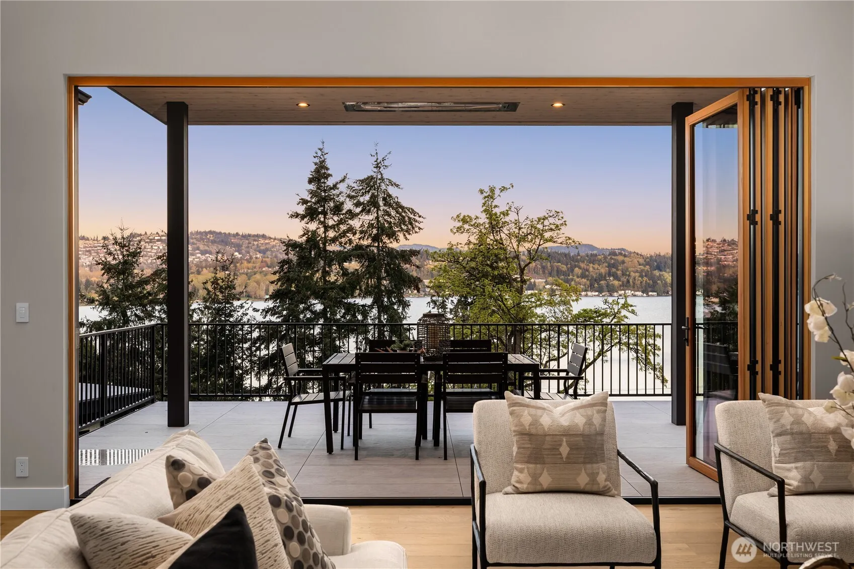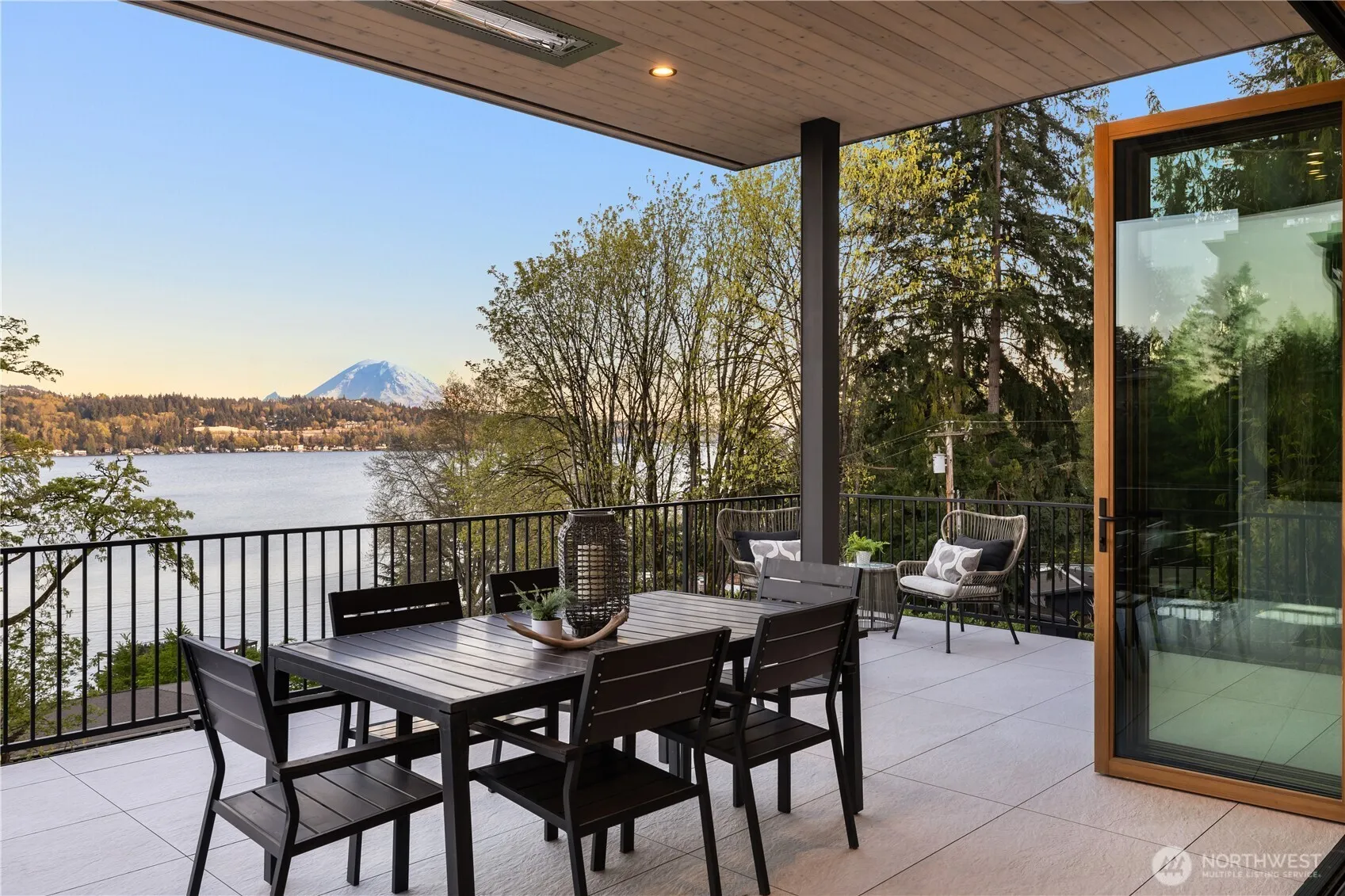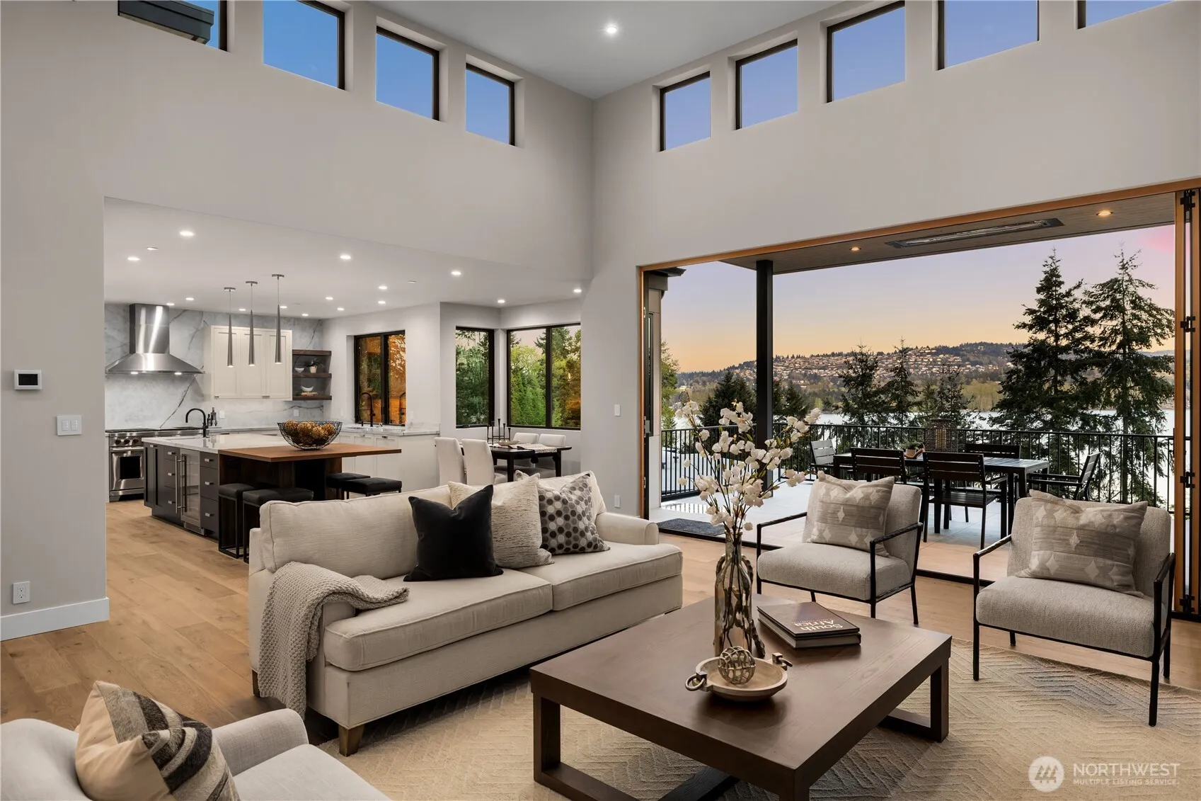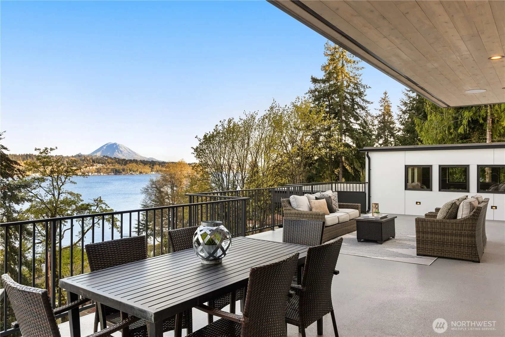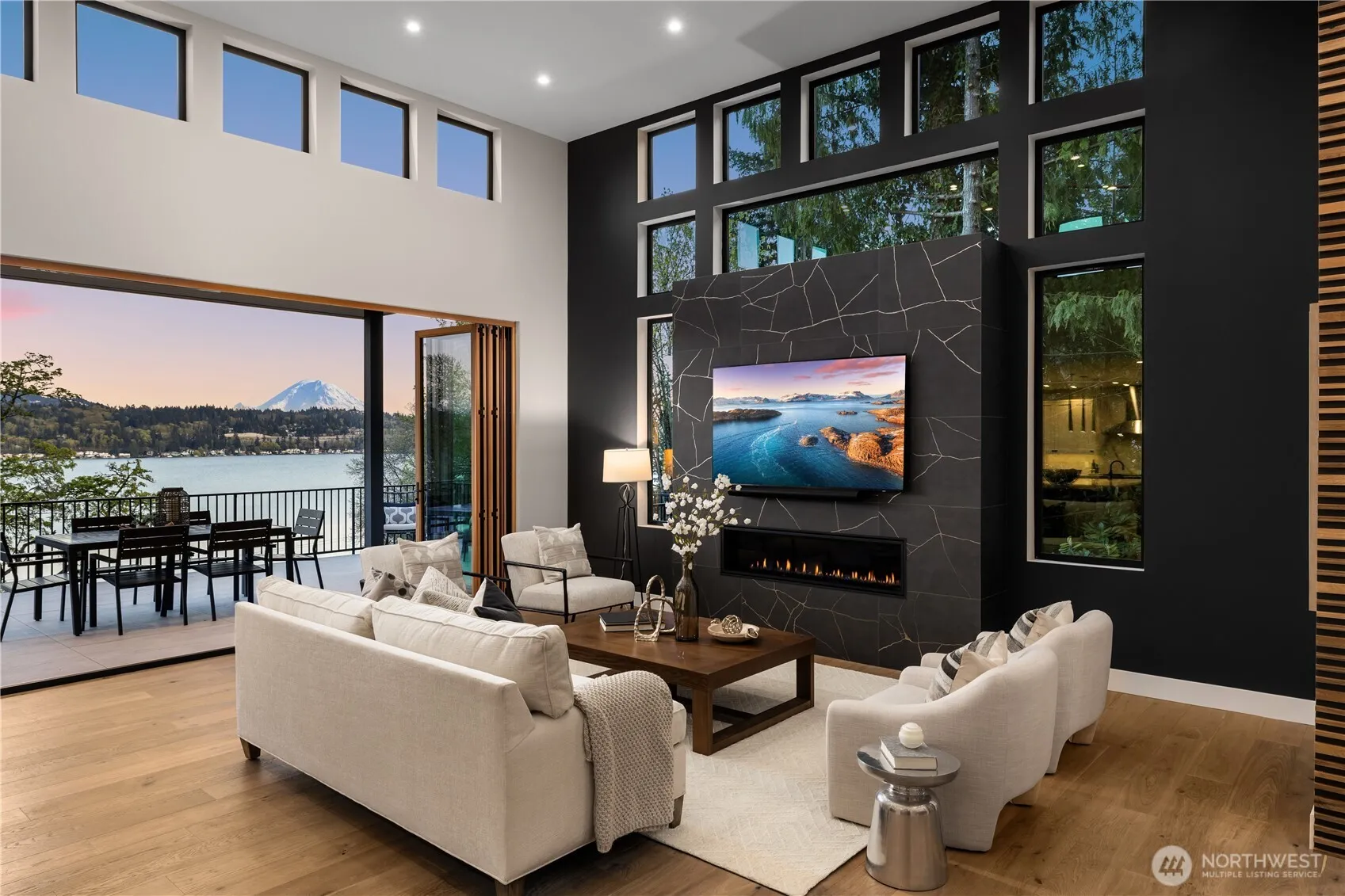 This striking new construction home doesn’t compete for attention—it commands it! Panoramic views of Lake Washington and Mt. Rainier. At the heart is a dramatic living room with nearly 16-foot ceilings, clerestory windows, and a full LaCantina door that opens completely to the outdoors. Chef’s kitchen with porcelain slab counters and backsplash, Wolf, Sub-Zero, and Miele appliances. Main-floor primary suite with a bath that redefines luxury. Upstairs, an 840 sq ft rooftop deck with spectacular views extends from the bonus room. Three bedrooms and a second bonus room below. Radiant heat, smooth drywall, steel pivot door, custom slat walls, designer lighting, and smart systems. Quietly stunning.