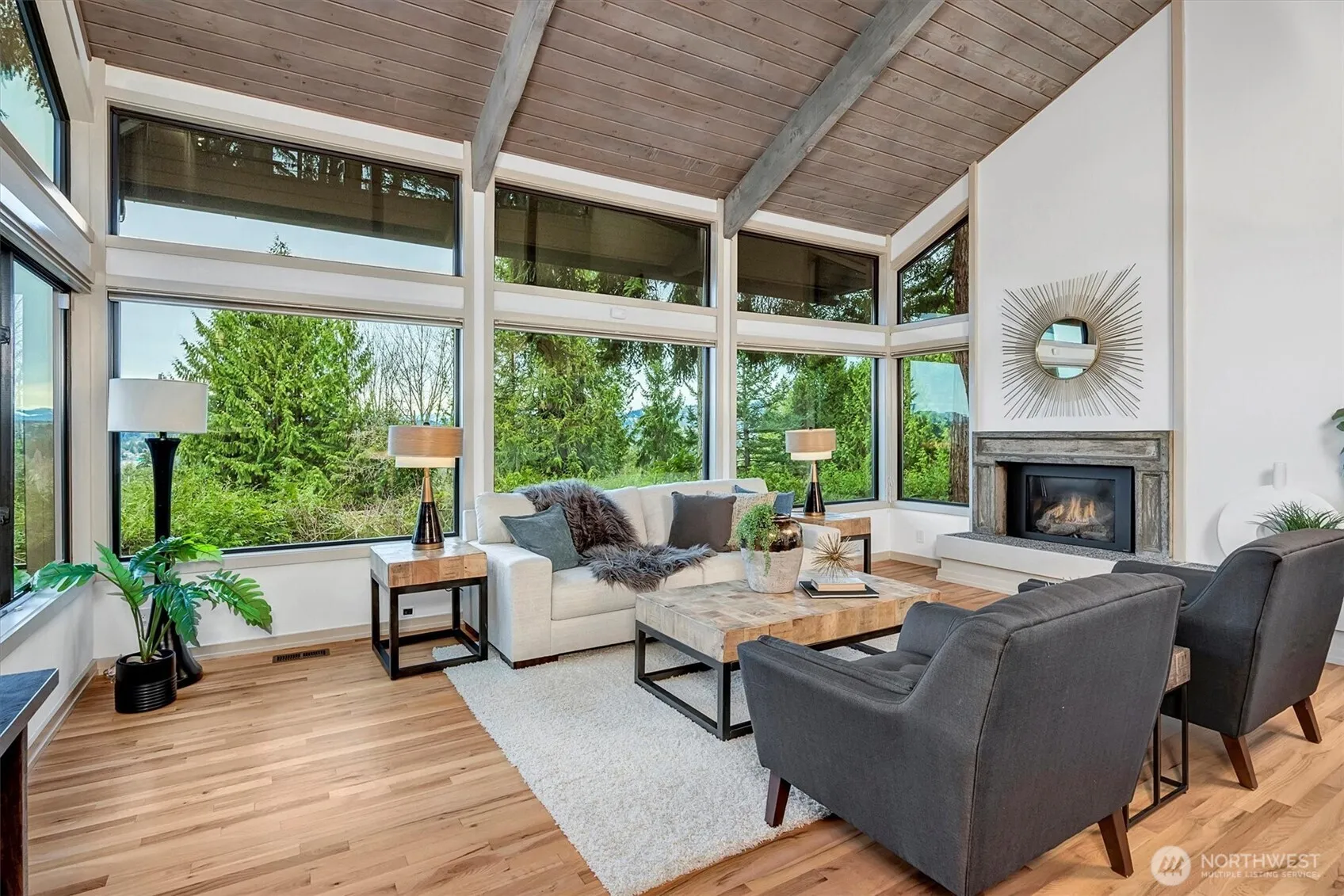 Wake up to sweeping views of the Cascade mountains and downtown Bellevue from the main floor primary bedroom with private ensuite. The dramatic living room with more views stuns w/vaulted wood-paneled ceilings, expansive windows, hardwood floors, and gas fireplace. The kitchen has granite countertops, SS appliances, and ample cabinets and connects to an open dining room. A cozy family room w/ a 2nd fireplace opens to the deck. A 2nd bdrm/den and powder room round out the main level. Discover flexible living downstairs with three additional bedrooms (or office/den), a spacious rec room with fireplace, and an abundance of storage. Additional comforts include central A/C and a backup generator, ensuring peace of mind in every season.