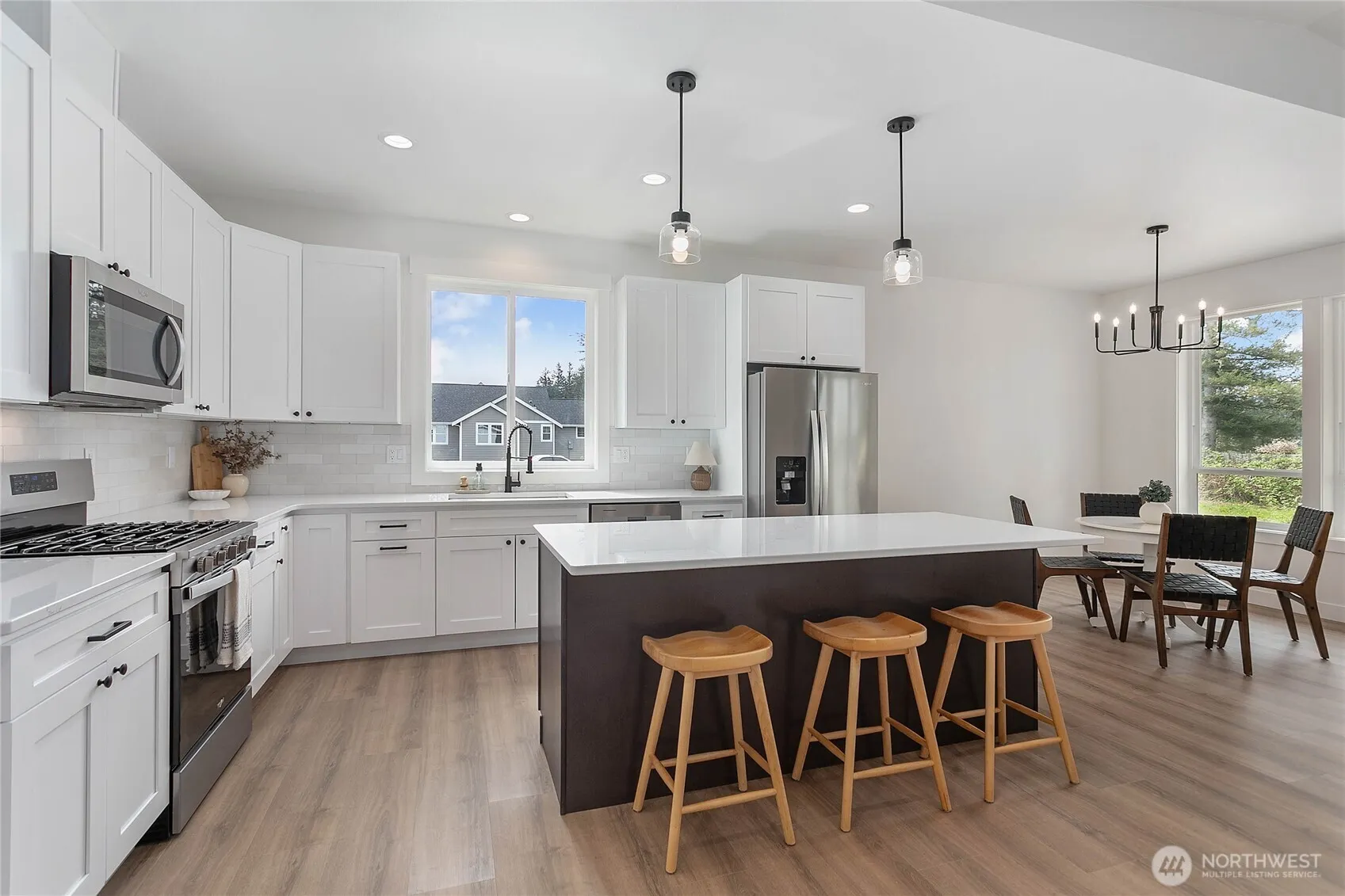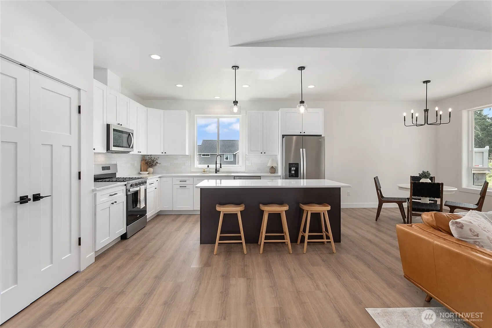 Just 15 minutes from Bellingham, this beautifully situated home offers the perfect blend of convenience and comfort. Designed with an open-concept layout and vaulted ceilings in the living room, the space feels airy and expansive. High-end finishes include custom cabinetry, quartz countertops, gas stove and SS Appliances, a stylish tile backsplash, and durable waterproof vinyl and tile flooring. With 3 bedrooms and 2 bathrooms—including a spacious master suite—all on one level, this home is ideal for easy living. Step out onto the back patio and enjoy the massive fully landscaped yard. This home is truly move in ready!
