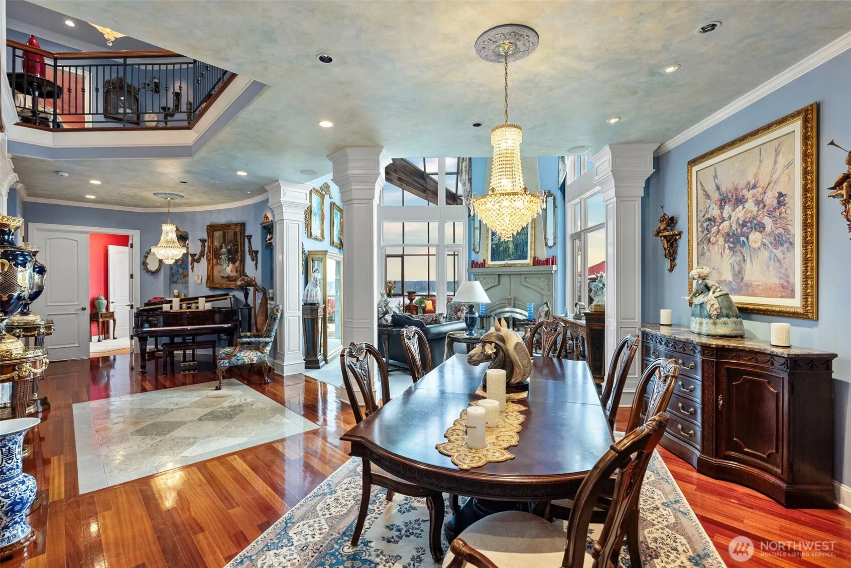 Experience unparalleled luxury in this impeccably maintained, resort-style home spanning just under 8,000 sq ft, w/sweeping 180° views! Crafted for the most discerning buyer, this private 5-bedroom estate, nestled on approximately 4.5 acres atop Fox Island’s SW side, is a masterpiece of elevated living & grand entertaining. Boasting a chef’s kitchen, lavish primary suite, home theater, solarium, wine cellar, gym, spa, hidden safe room, radiant heat, encapsulated crawl space, & the list goes on! Manicured grounds feature a pool, 12-ft-deep koi pond teeming w/50 large Japanese koi fish, & a detached 5-car garage—completing this private & magical sanctuary where every room offers breathtaking sunsets! Virtual tour can show home unfurnished.