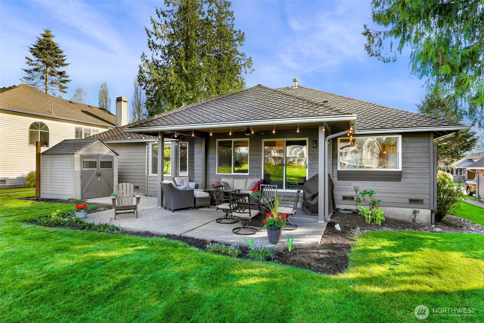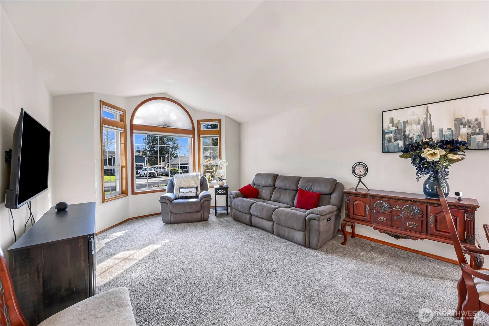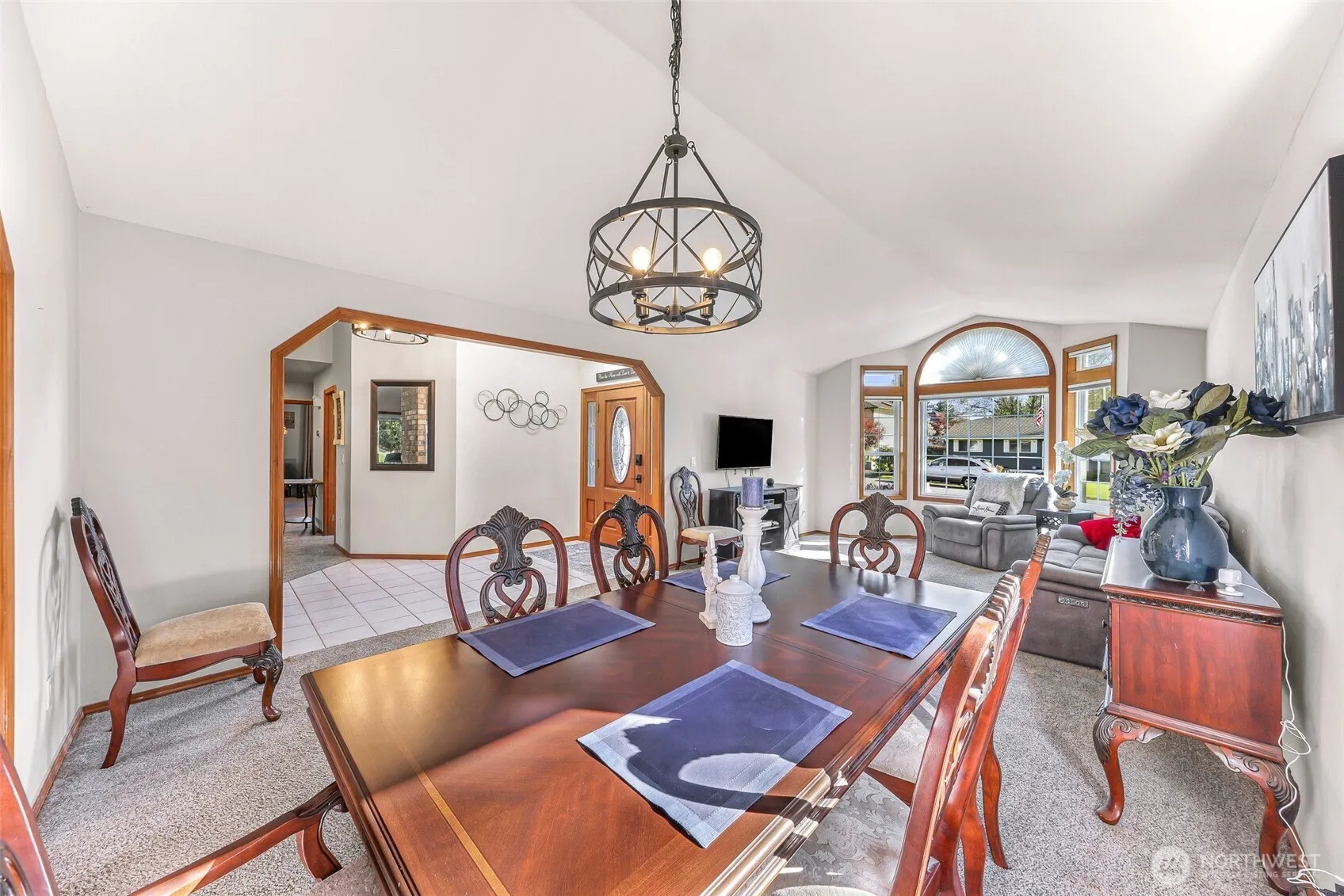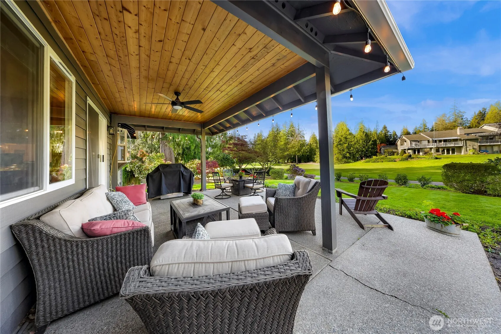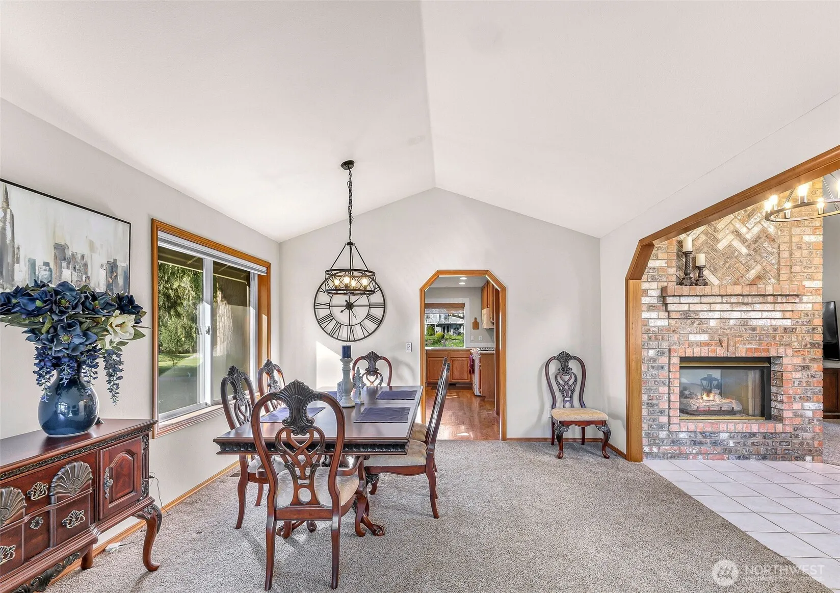 Sweeping views of the 3rd fairway in this classic rambler full of warmth, character & room to entertain. Kitchen features HW floors, large windows & flows naturally into the home’s gathering spaces. 2 spacious living rooms w/vaulted ceilings offer flexibility—one adjoins a large dining area w/a bay window & motorized blinds; the other, off the kitchen, opens through a slider to a covered patio & beautiful backyard w/mature landscaping—perfect for year-round grilling. A double-sided brick fireplace anchors the layout w/timeless charm. Retreat to the primary suite w/double doors, 5-piece bath & walk-in closet. 2 additional bedrms, full guest bath & laundry rm off the 2-car garage w/attic storage complete the home. Central AC & a 50-year roof!