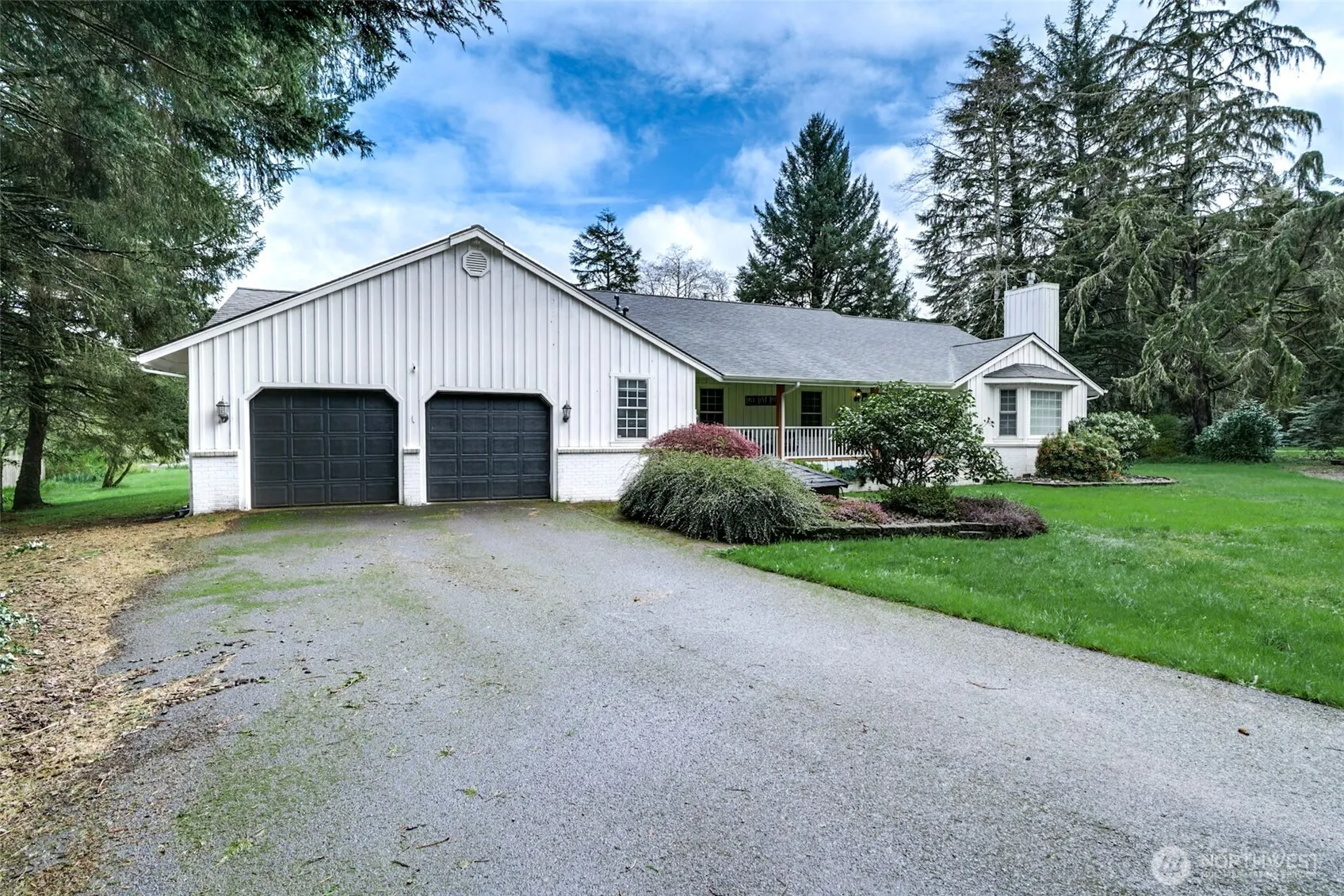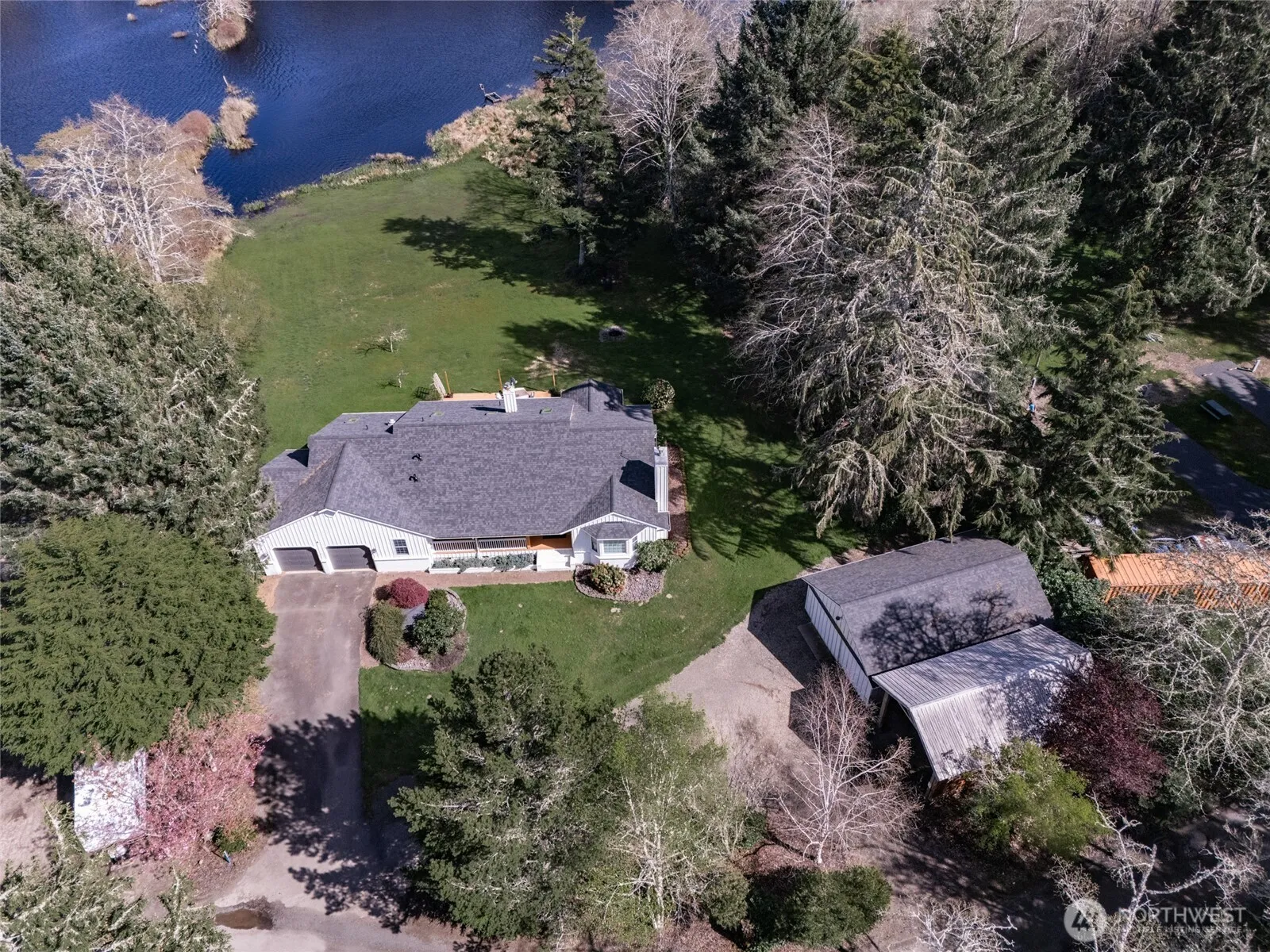 2.5 acre secluded LAKE FRONT home with abundant wildlife and natural beauty. Enjoy the view and peaceful setting on your 500+ sqft deck OR from your bedroom, den, dining room or kitchen! This home offers easy one level living. Part of its charm are the many large windows bringing the outdoors inside. Enjoy the warmth of the living room fire place and the cozy stove in the den off the kitchen. There are two family rooms, beautiful tile countertops, radiant floor heat, a soaking tub, and many comfy nooks to curl up in. And to enjoy all your toys, hobbies and more step into the 884 sqft garage or the 864 sqft detached shop. There’s even covered parking for your RV. There’s something for everyone to enjoy here!