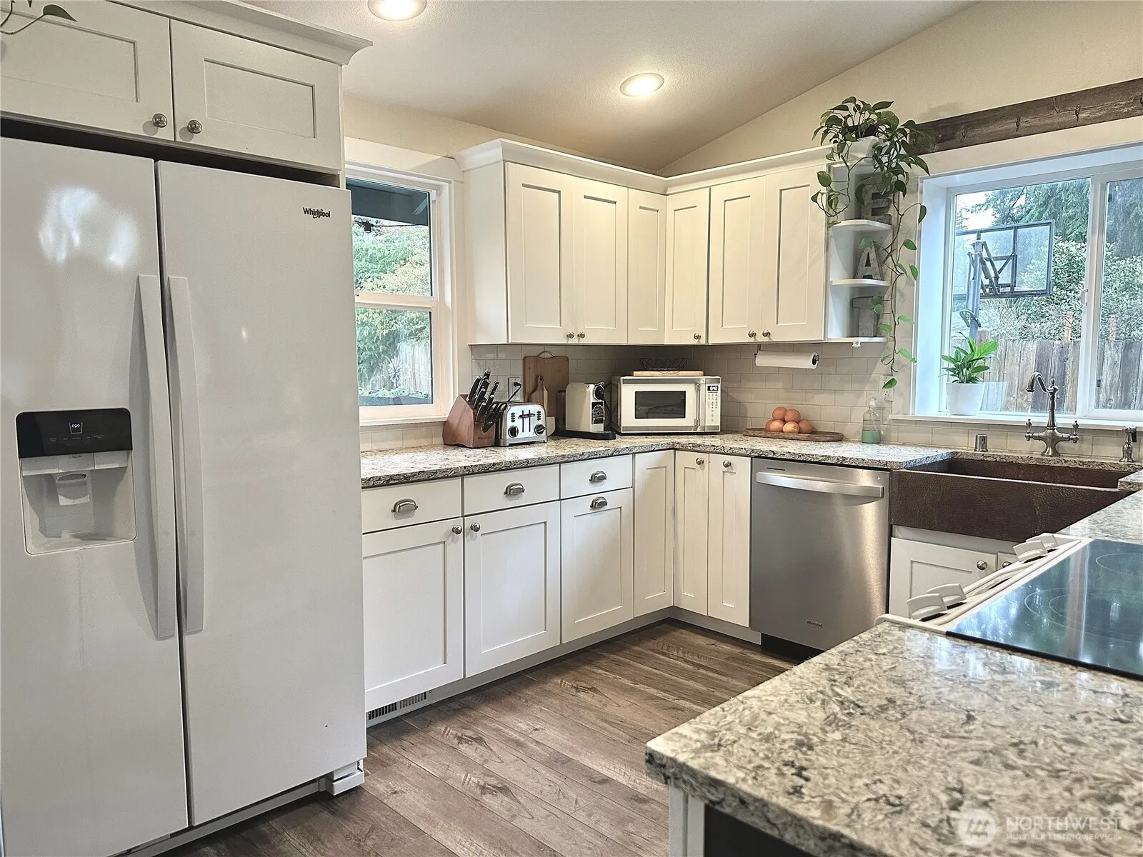 Charming home in desirable Lancaster Gate community! Minutes away from downtown Covington. Enjoy an open-concept, yet cozy, kitchen/dining/living room combination with vaulted ceilings & plenty of natural light. Kitchen features a hammered copper sink & quartz countertops. Large family room for relaxation or play. Many updates throughout including remodeled primary bath with gold finishes & herringbone floors. Spacious backyard with a low-maintenance composite deck, swing set, 3 young apple trees & room for raised garden beds. Partial garage conversion for a private home office. Solar panels & generator hookups provide energy efficiency & peace of mind. Come tour this lovingly cared-for home today!