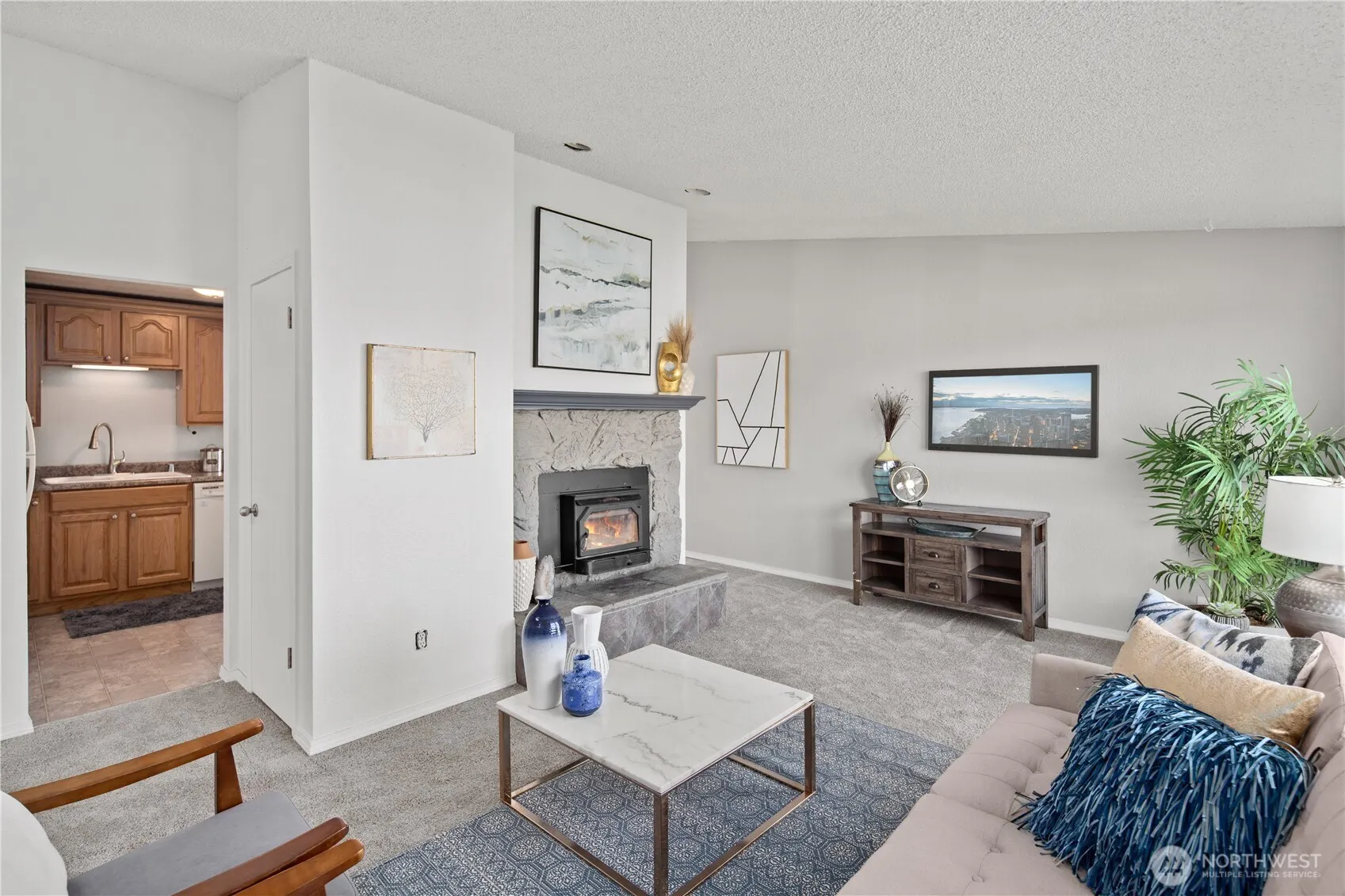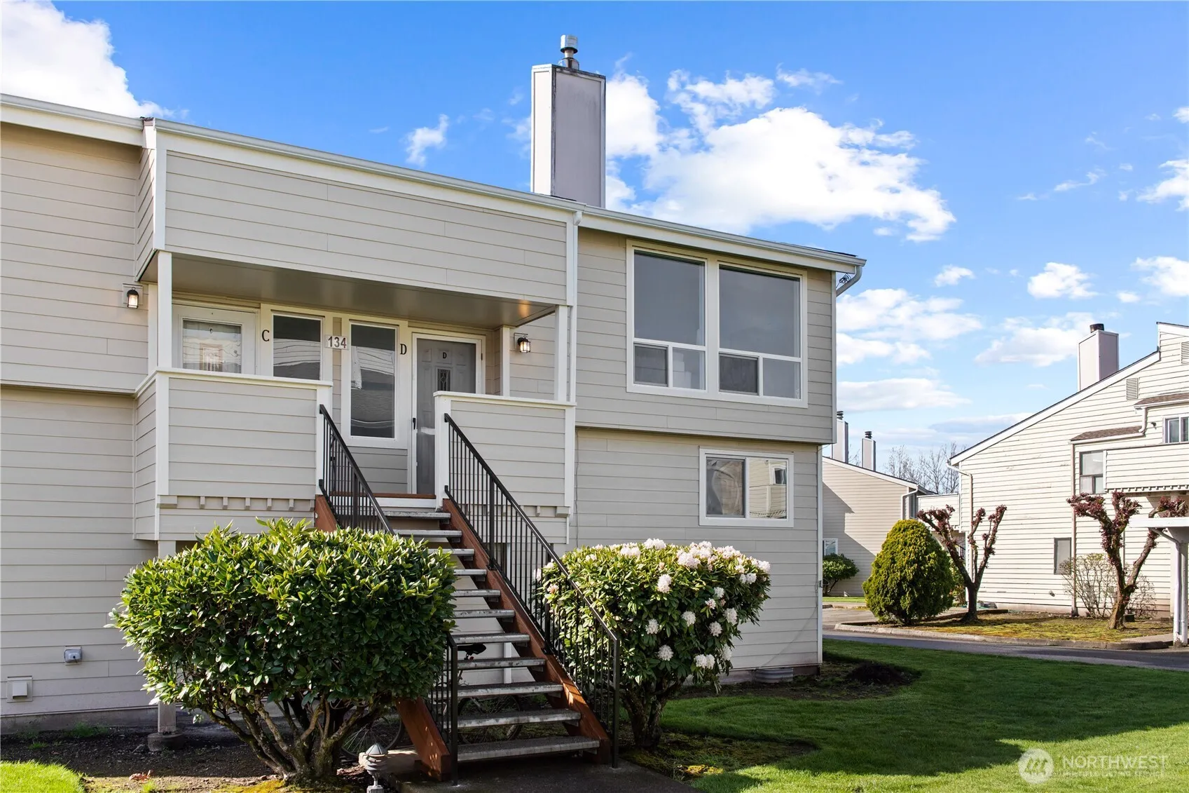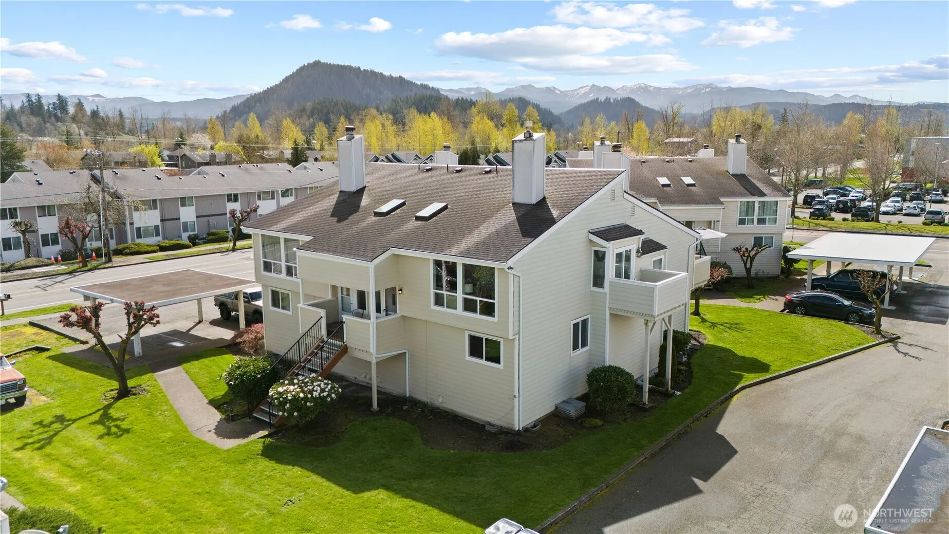 Welcome to this beautifully updated 2-bedroom, 1.5-bath condo in the heart of Enumclaw, offering 1,085 sq/ft of comfortable living across two levels. The lower level features both bedrooms, a full bathroom, and a convenient laundry area, while the upper level boasts a spacious living room with a cozy wood-burning fireplace, a second full bath, a dining area, and a bright kitchen that opens to a private balcony. Recent updates to the complex include new roofing, siding, paint, windows, and staircases, providing peace of mind and great curb appeal. The unit includes one reserved covered parking space with plenty of additional open parking available, all just steps from Enumclaw High School and close to local amenities.