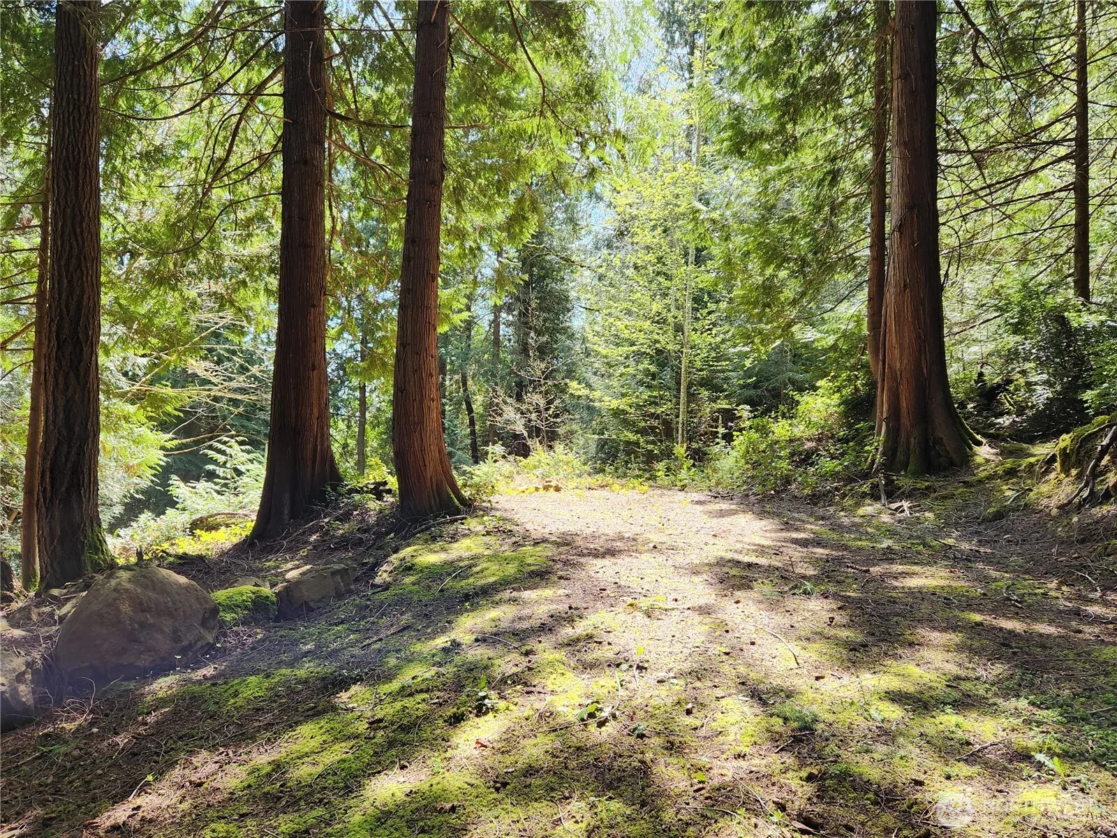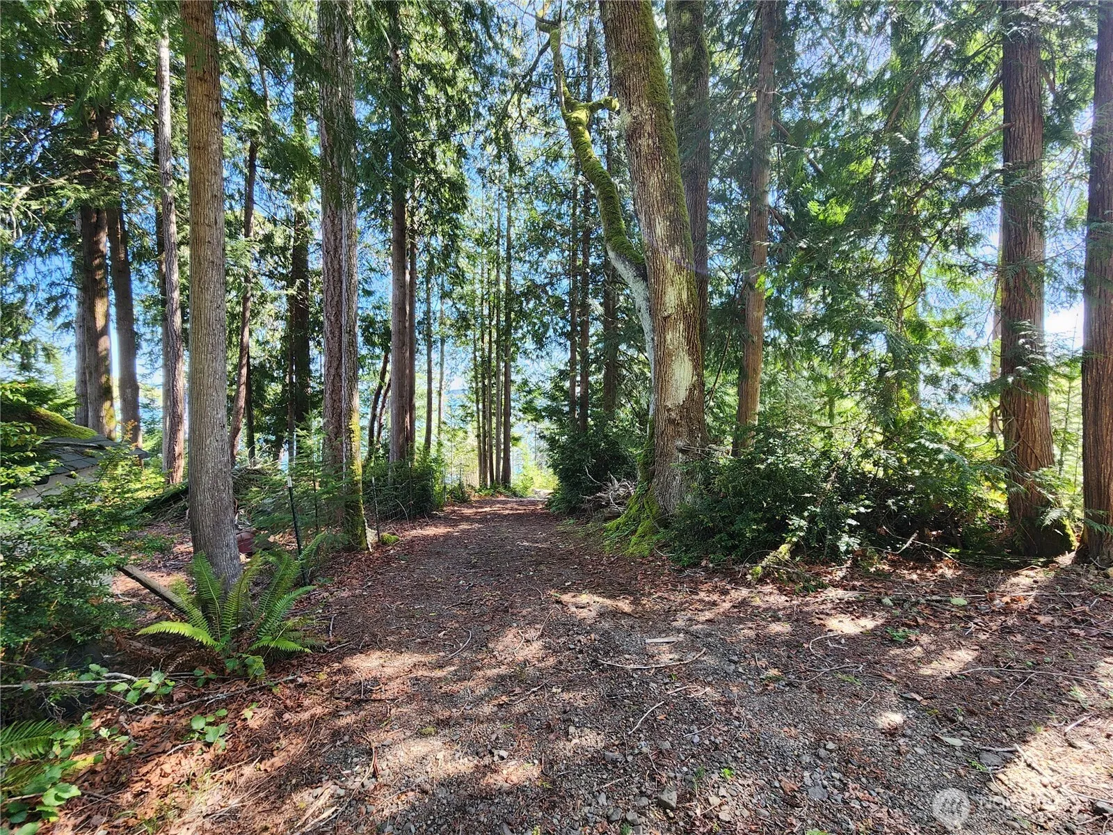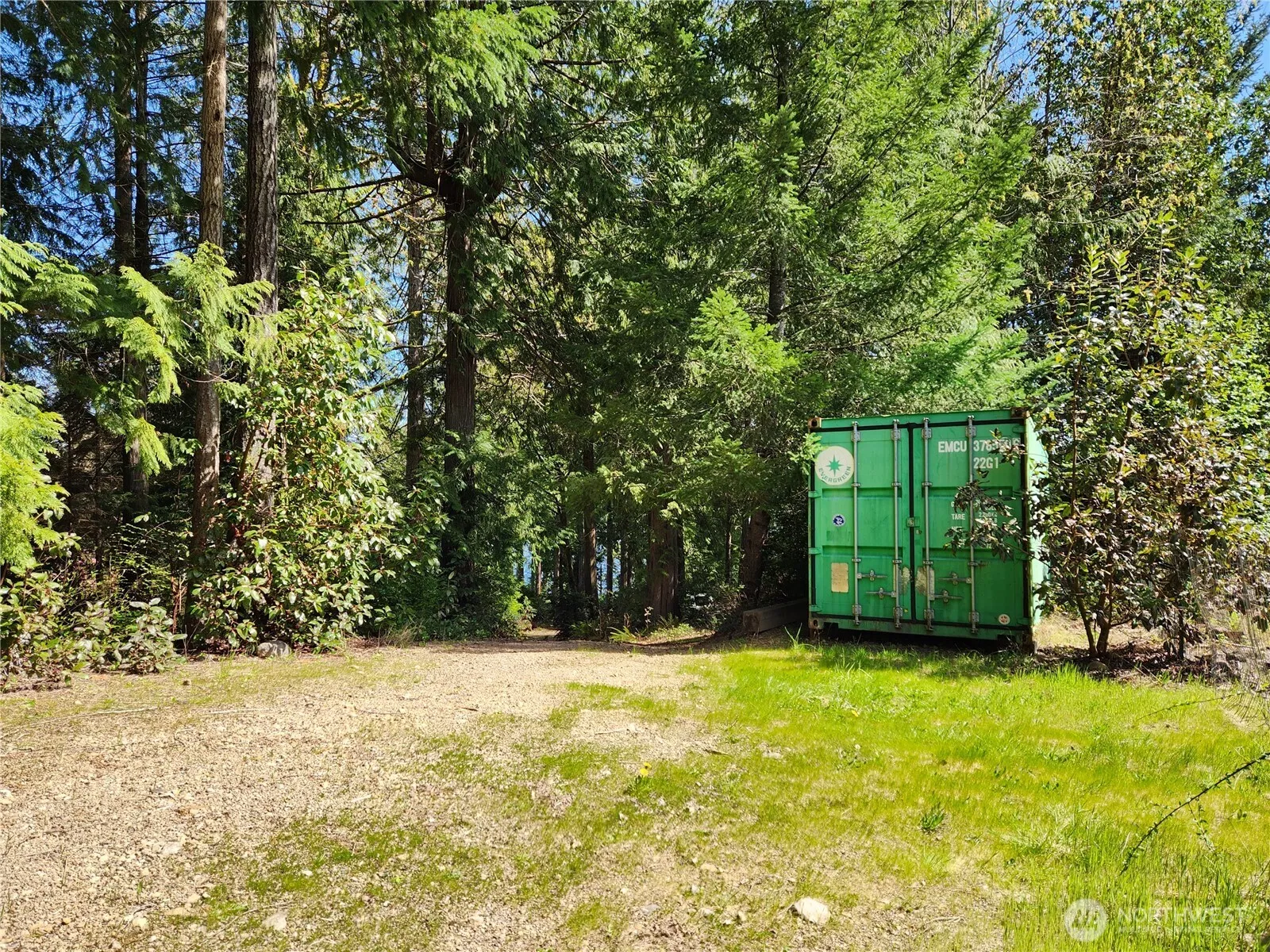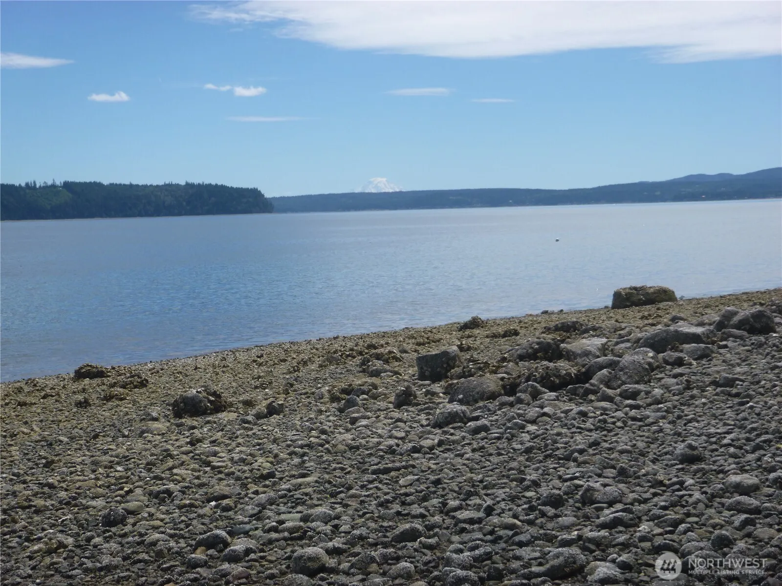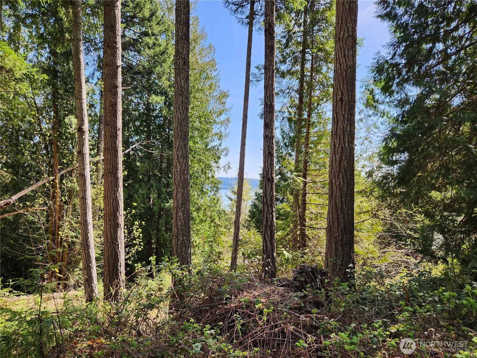 2 1/2 acres of heavily forested land with views of Hood Canal and Mt. Rainier. 100ft. of waterfront with tidelands, gradual beach with shellfish. Buyer would need to create a trail or steps to beach. Several level areas to create cabins or other buildings, clear some trees for more view if desired. Well established driveway into property. Storage container included for a beginning.