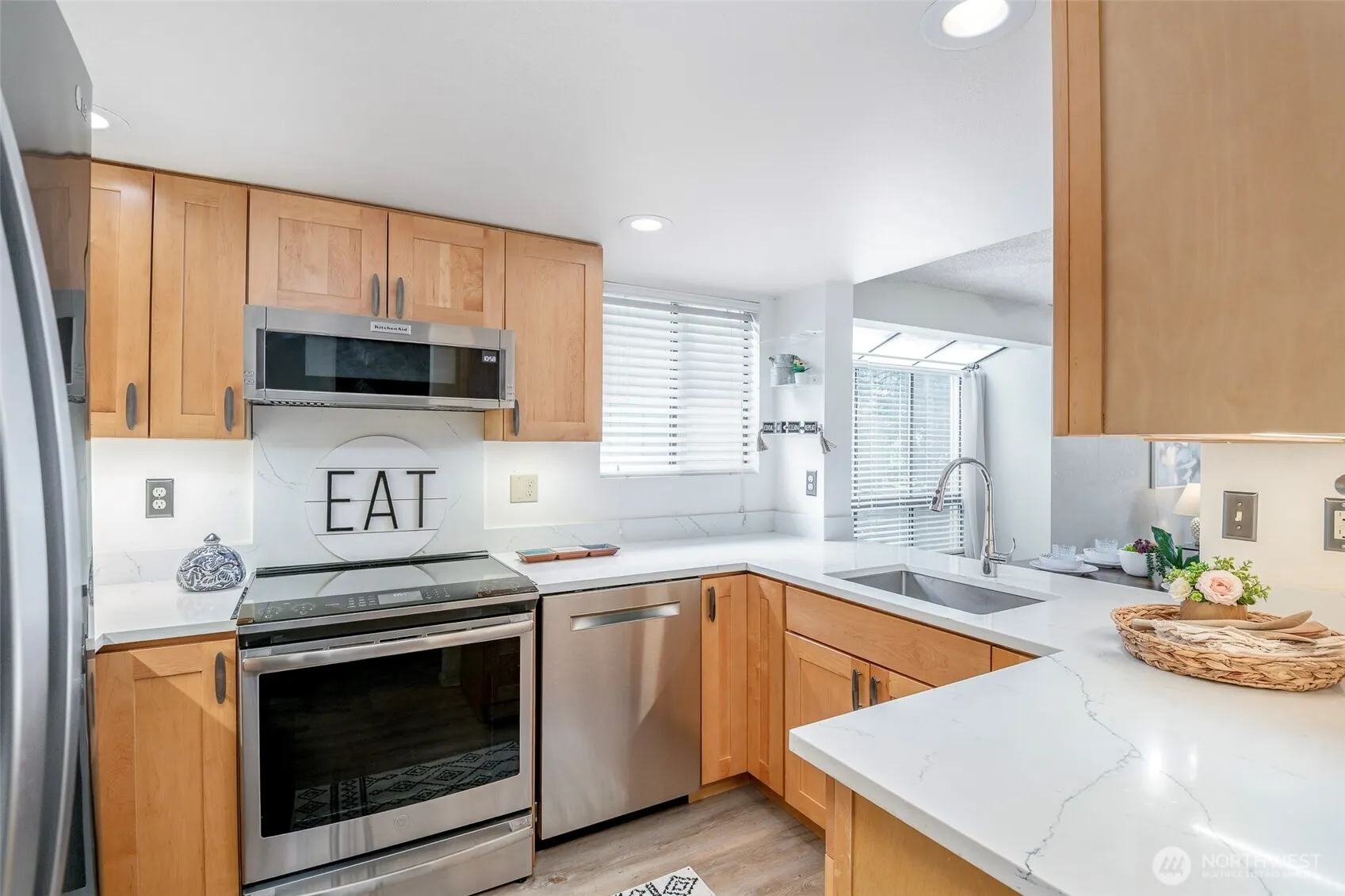 Gorgeous ground-floor unit in Sunwood Condominiums featuring 2 bedrooms & a spacious Jack & Jill bath. The fully updated kitchen shines, & a stunning solarium window fills the dining area with natural light. New flooring throughout—brand-new carpet, updated vinyl in bath, & stylish finishes make this condo truly turn-key. Full size W/D stays with unit. Ample storage in every room. Enjoy the convenience of your own covered parking space right out front. Located just minutes from Seattle, major freeways, Westfield Mall, dining, & more—yet tucked away in a lush, green setting. HOA covers W/S/G & common area maintenance. Enjoy resort-style amenities: heated outdoor pool, tennis courts, cabana, jacuzzi & more! You’re going to love it here!