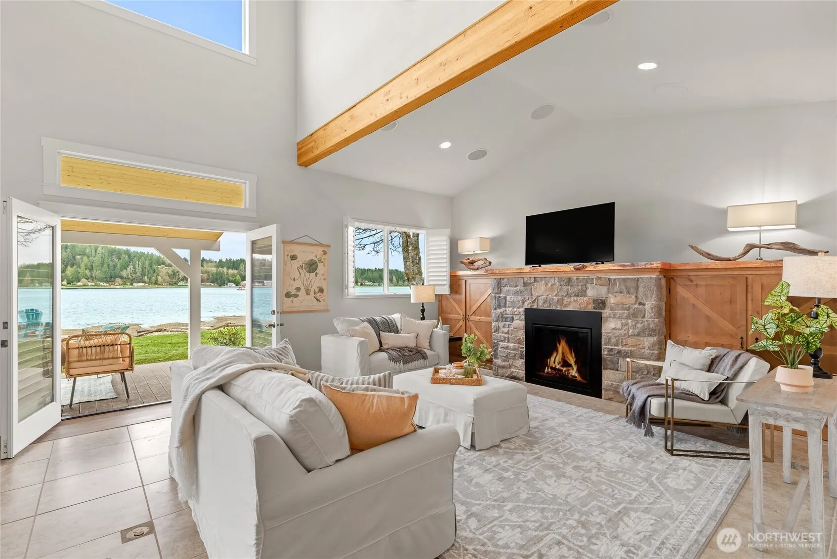 Rare low-bank waterfront in Downtown Allyn with 88′ of bulkheaded frontage and ownership of 50′ of tidelands-harvest oysters and clams from your own beach! This home is beautifully updated with new carpet, flooring, fixtures, vanity, and a custom wood skybar. Enjoy a newly covered patio for year-round enjoyment of the outdoors. Take in views of Orcas, Seals, and Eagles as you enjoy the rhythm of the tides. Open-air great room with a chef’s kitchen and artisan-crafted dining table. Main-level primary suite, 2 bedrooms, loft/office, radiant heat, tankless water. Walk to downtown Allyn’s marina, shops, and dining with golf just up the hill. A True Coastal PNW Waterfront Gem.